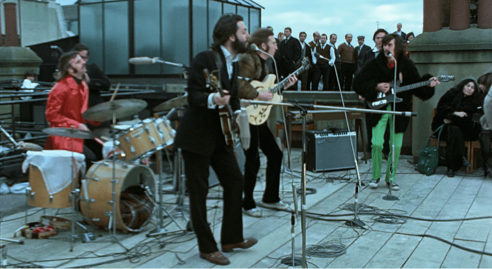 Men det är uppenbart att Paul McCartney är taggad från start och njuter av varje sekvens att få spela live med Beatles igen. Han kickar okynnigt igång lite extra när polisen bevärdigar takkonserten med sin närvaro. John Lennon är trögstartad, men smälter och slappnar så småningom av. Ringo Starr är stadigt svängig, vet vad som krävs och är tacksam att få spela med sina kompisar och George Harrison står på sin kant utan att falla ur ramen. Det är ett sagolikt ögonblick, väl värd all väntan genom alla surmulna rep.