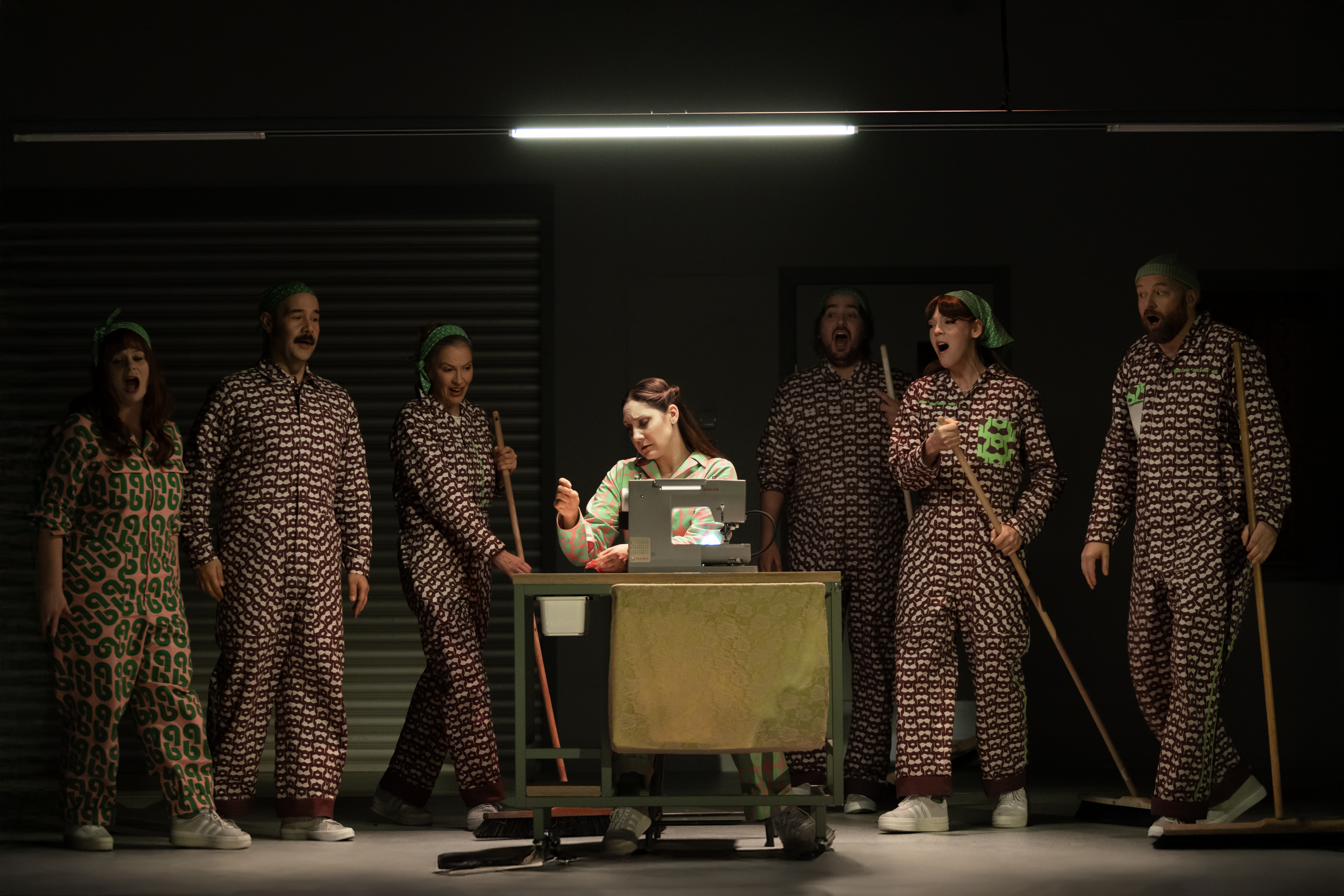 Vi hamnar rappt i textilfabriken som syr bh:ar, trosor och korsetter. Musiken är staccatoartad med hela ensemblen i ett försök till en attackerande, entonig symbios. Några bryter sig ut, som tävlande om att att ta högsta tonen. Allvaret och humorn är satt från början. Denna växelverkan spinner genom musik och libretto i föreställningen.