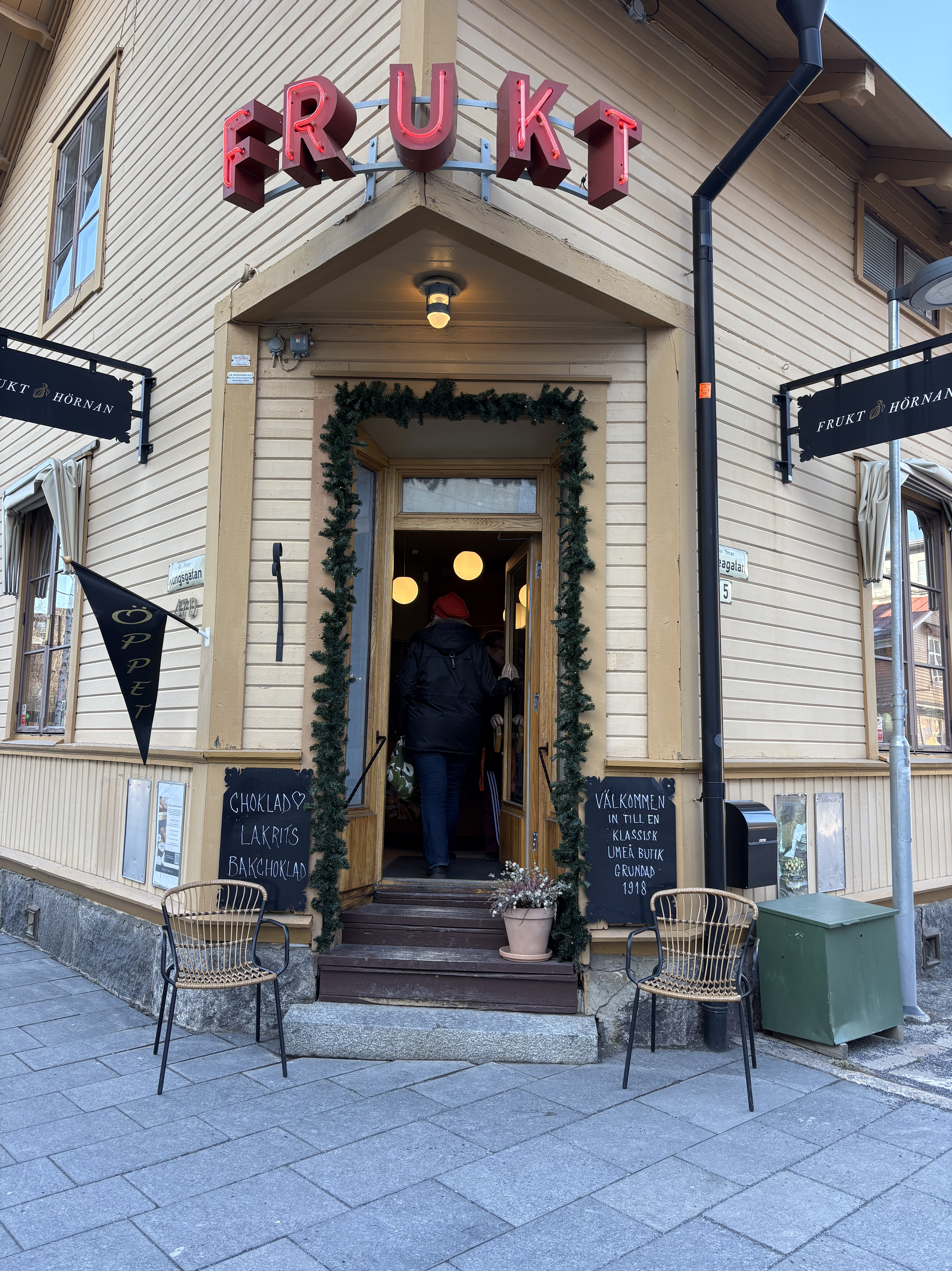 Äntligen är min väntan över. Men vi går in de få hundra meterna till centrum. Ingen returresa med bussen, alltså. 1–0 till Z. Vi kommer in på gågatorna, smiter in på Frukthörna – en anrik och kulturskyddad byggnad – som nu mer inte säljer frukt utan godsaker de luxe. Min vän köper söt lakrits. Jag en chokladkaka made in Umeå för 120 kronor (!). Vi viker av mot Seniortorget, passande namn för mig, för ett besök på secondhanden Kärngården, som också hyser ett kafé. Nej, det blir inget shoppat, men en stund för fika innan vi går till Ica Gourmet för inhandling av det som saknas hemma och för middagen innan föreställningen.