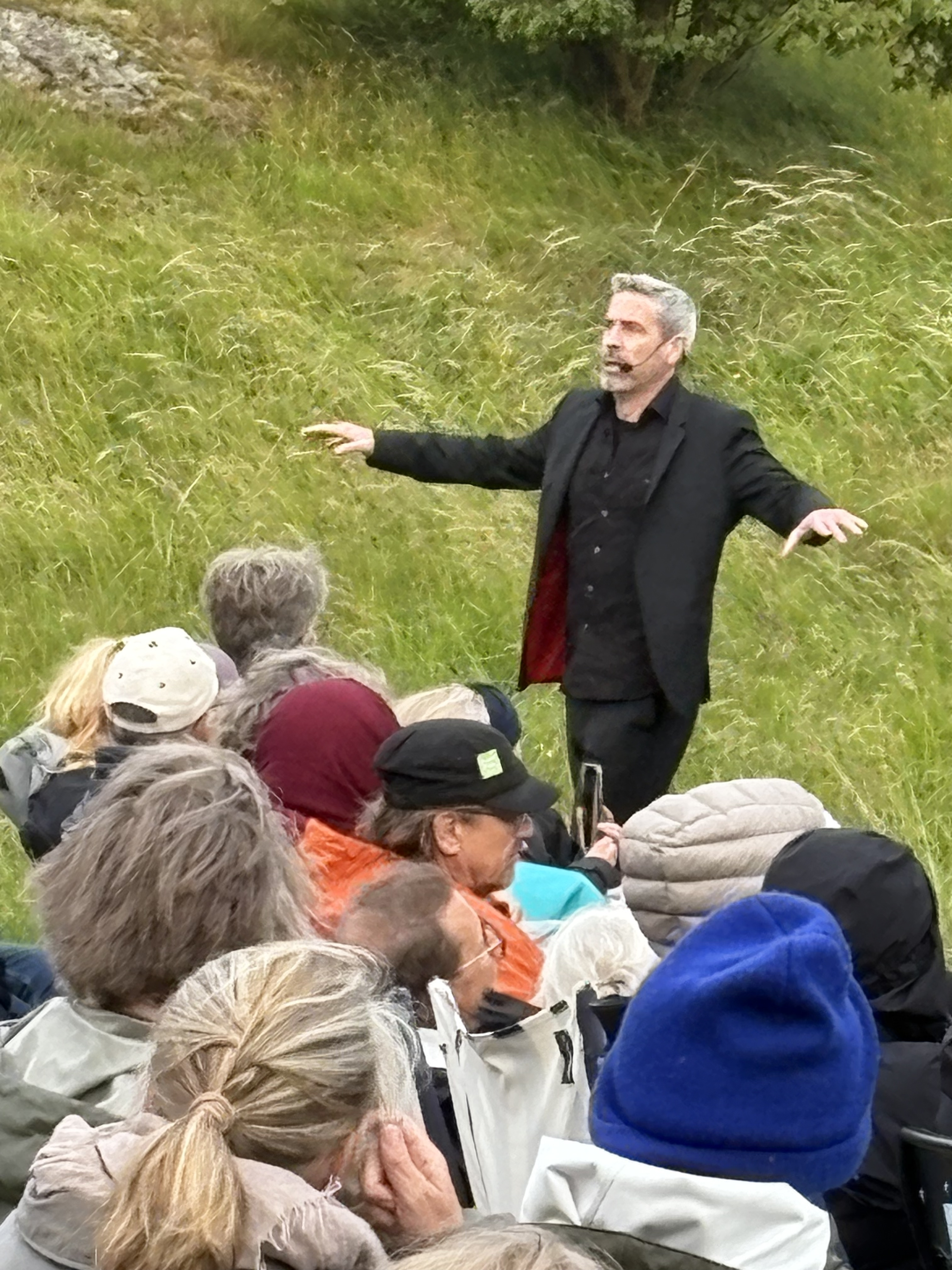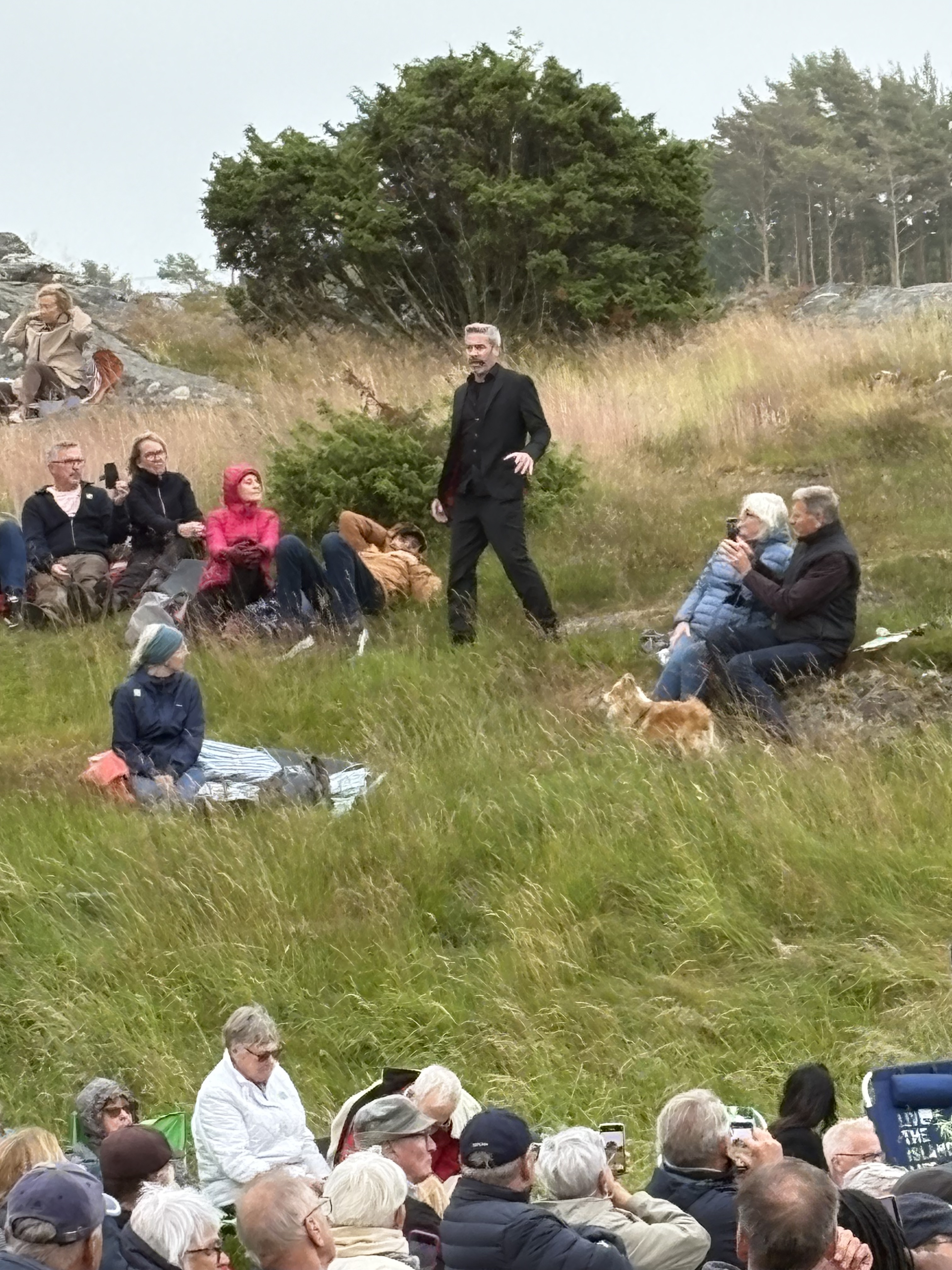 Nå… man förlorar en del. Vinner annat. Ola Rapace röst hörs över nejden, men oklart varifrån. Hans stockholmska ljuder över klipporna och se där, där kommer han med recitation av Strindberg, som Rapace bara helt spontant talar till oss. Han är klädd helt i svart med kängor, som en combatsoldat med grånad frisyr. Det är en snygg entré, där han sakta bär med sig sin text från promenaden över klipporna ned mot ängen där publiken sitter för att med ett vigt skutt ta sig upp på scenen och där avsluta sitt framträdande.