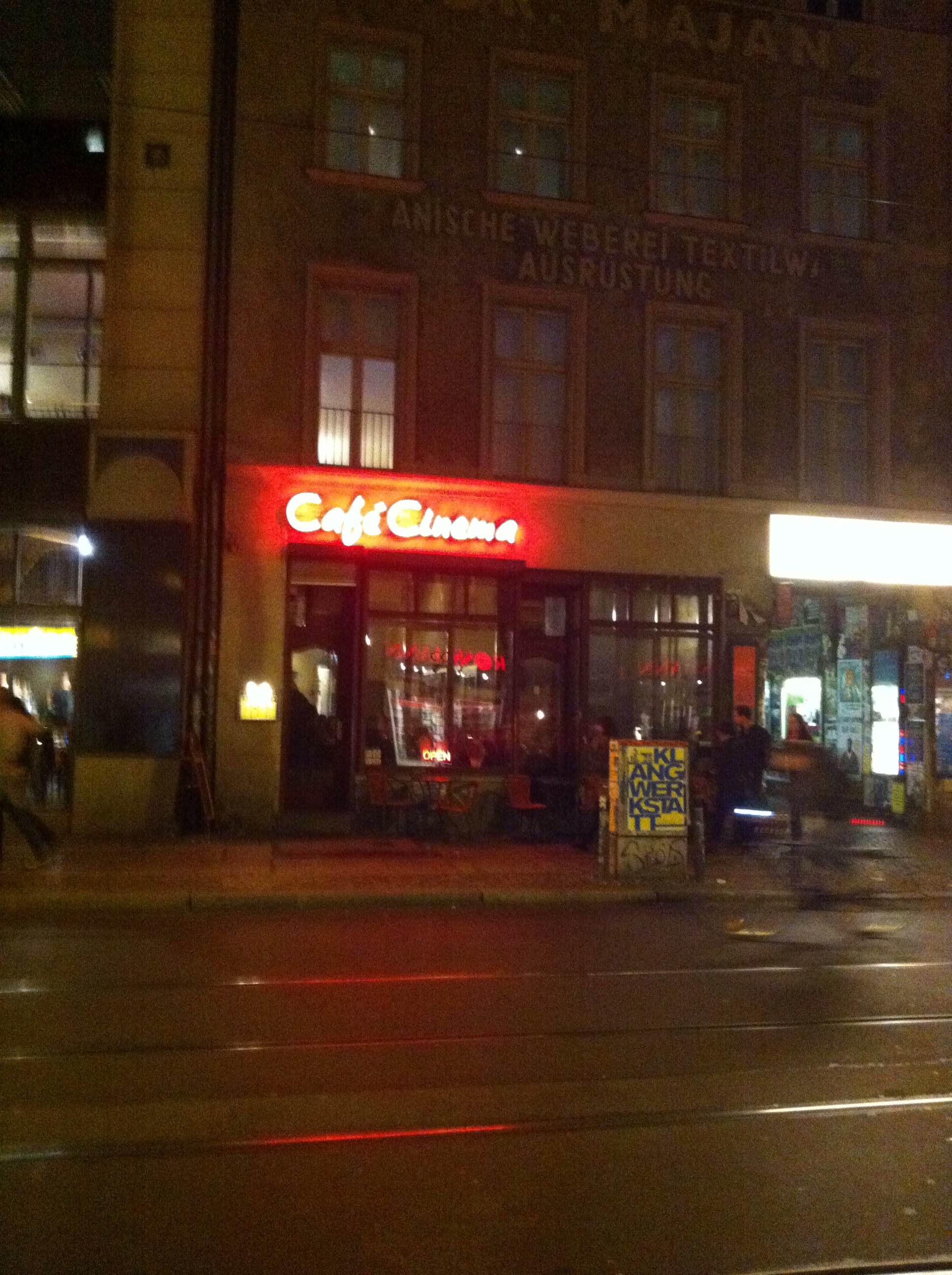 Vi blir kvar en stund, jag vilar min rygg, men behöver sedan röra på mig. Vi går mot Hackescher Markt, jag är sugen på glass, Häagen Dazs, men blir slutligen nedröstad. Istället går vi ett femtiotal meter mot Hackesche höfe och Café Cinema. Det blir kaffe och en äppelkaka, serverat av en servitris som arrogant talar om för mina vänner att beställningen inte sker vid disk och då hon kommer förbi mig som sitter vid bordet uppgivet rycker på axlarna då jag säger att mina vänner beställer åt mig och att de står därborta vid disken.