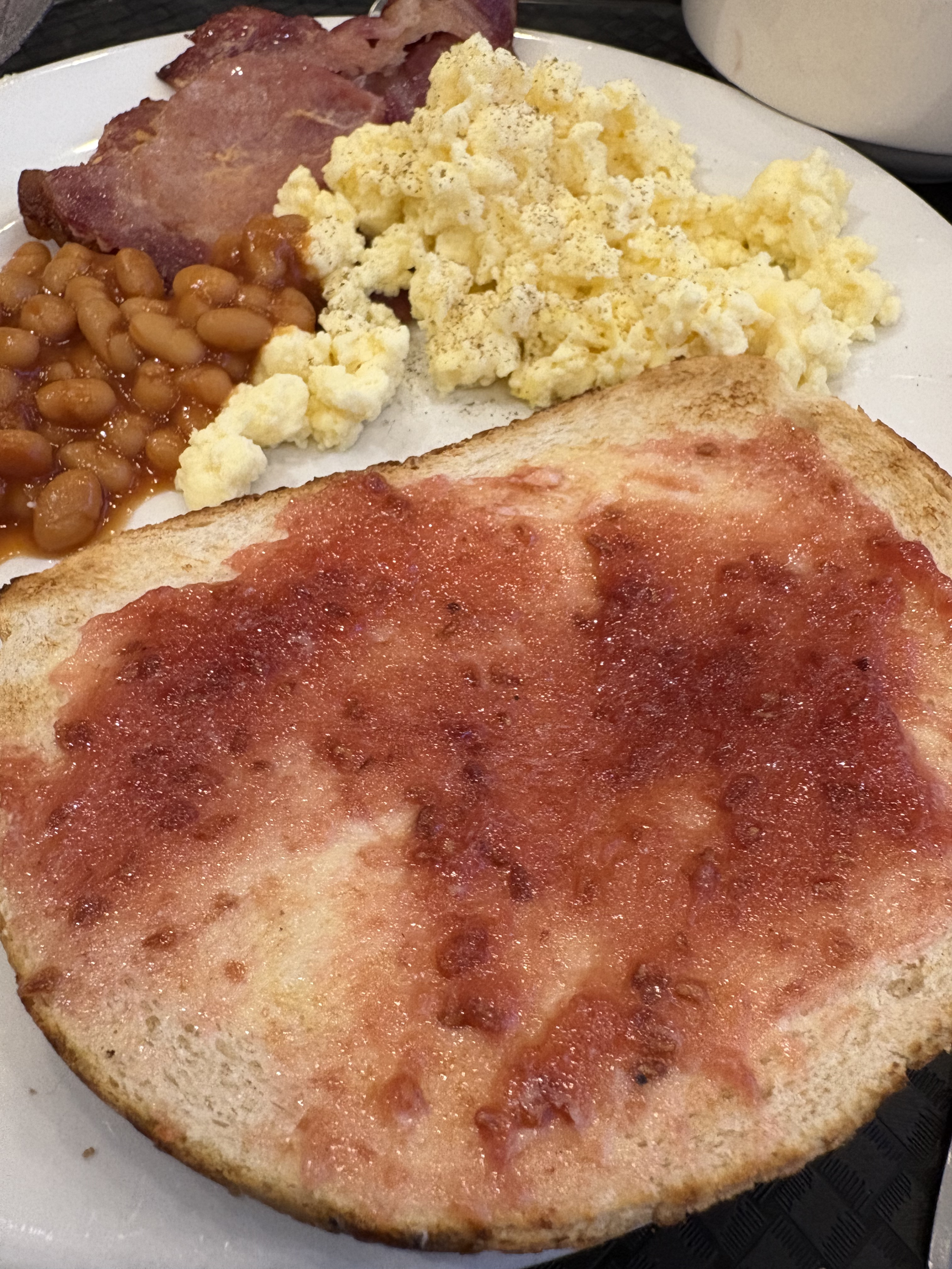 Vi startar dagen som den förra. Hinner knappt vakna förrän kläderna är på och vi tar hissen ned till frukostmatsalen, den som är densamma som gårdagens bar. Stolarna är ok, sofforna för låga och borden för små. Men maten som bjuds är brittiskt ok, bra skramlade ägg, stekta ägg, bacon, korvar, fruktcocktail, yogurth, flingor, bröd att rosta, marmelad, te eller kaffe. Vi tar vår tid, sitter vi olika platser varje dag. Spanar in andra frukostgäster, klädsel, frisyrer, vanor… Så går vi upp, gör morgontoaletten och skissar vad vi ska göra.