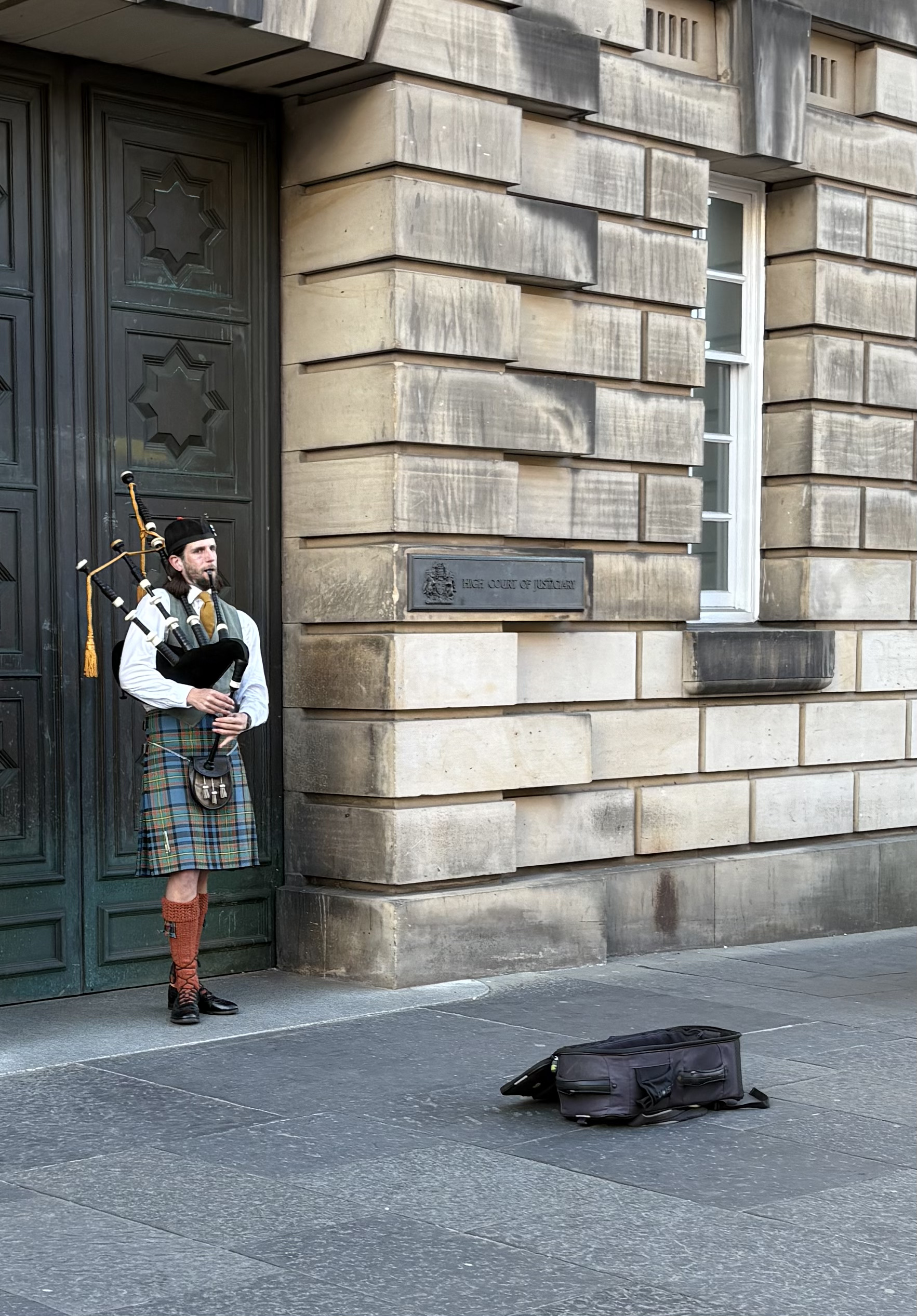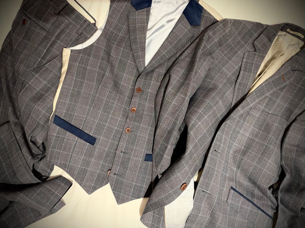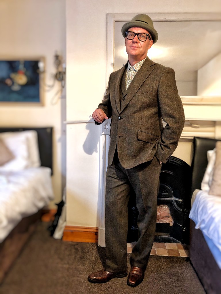 Han låter mig hållas, men håller också ett öga på mig ivrig att vara mig tillags när så krävs. Jag förklarar min historia, berättar om 2017 och köper 2018 samt besöket i deras butik i Edinburgh. Så väljer jag en kostym, en blå tweed. Vi bestämmer tillsammans storlek. Han springer ned i källaren för att hämta väst och kavaj. Kavajen sitter perfekt, västen likaså när jag provar dem. Byxorna är väldigt långa i benen, men ska så vara. Vi fixar det, säger han. Hur länge är ni kvar i London?