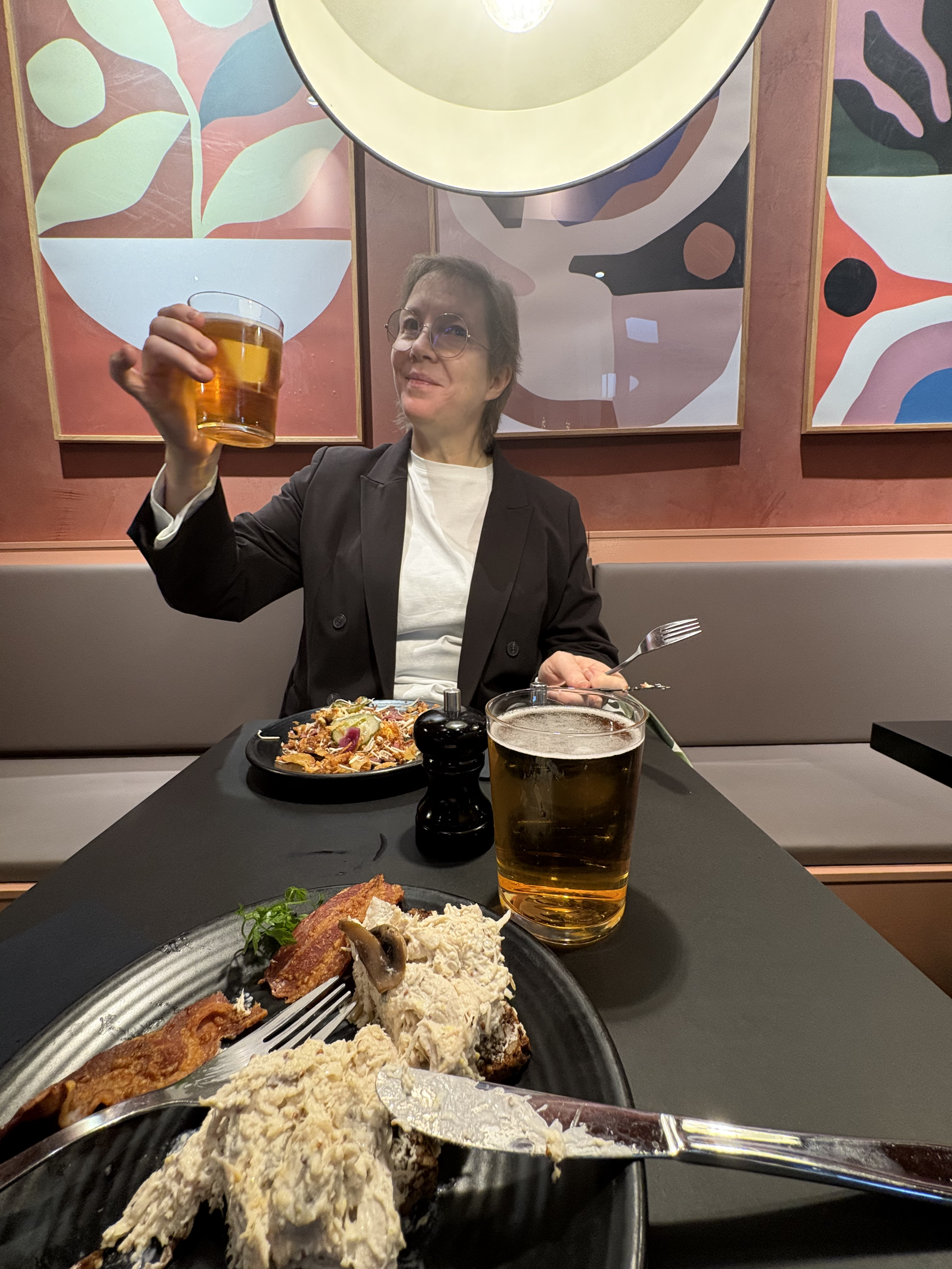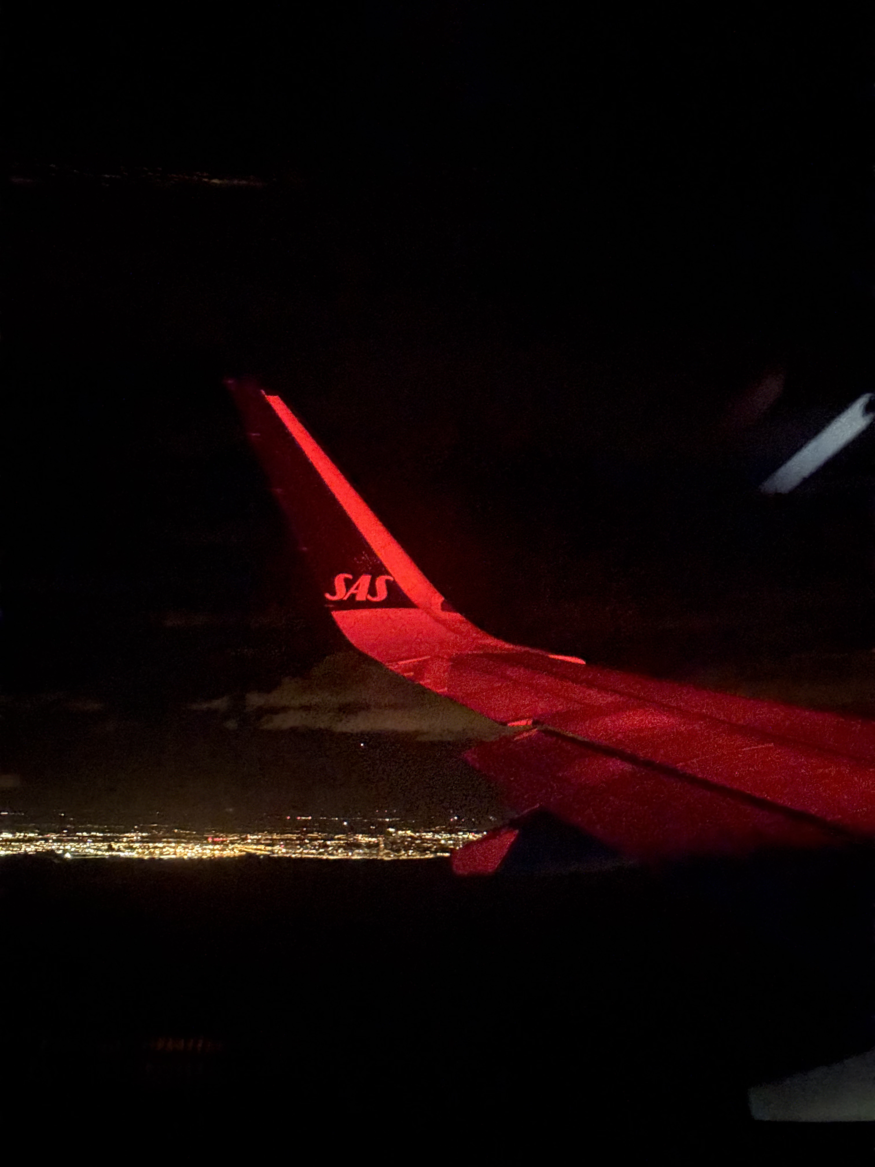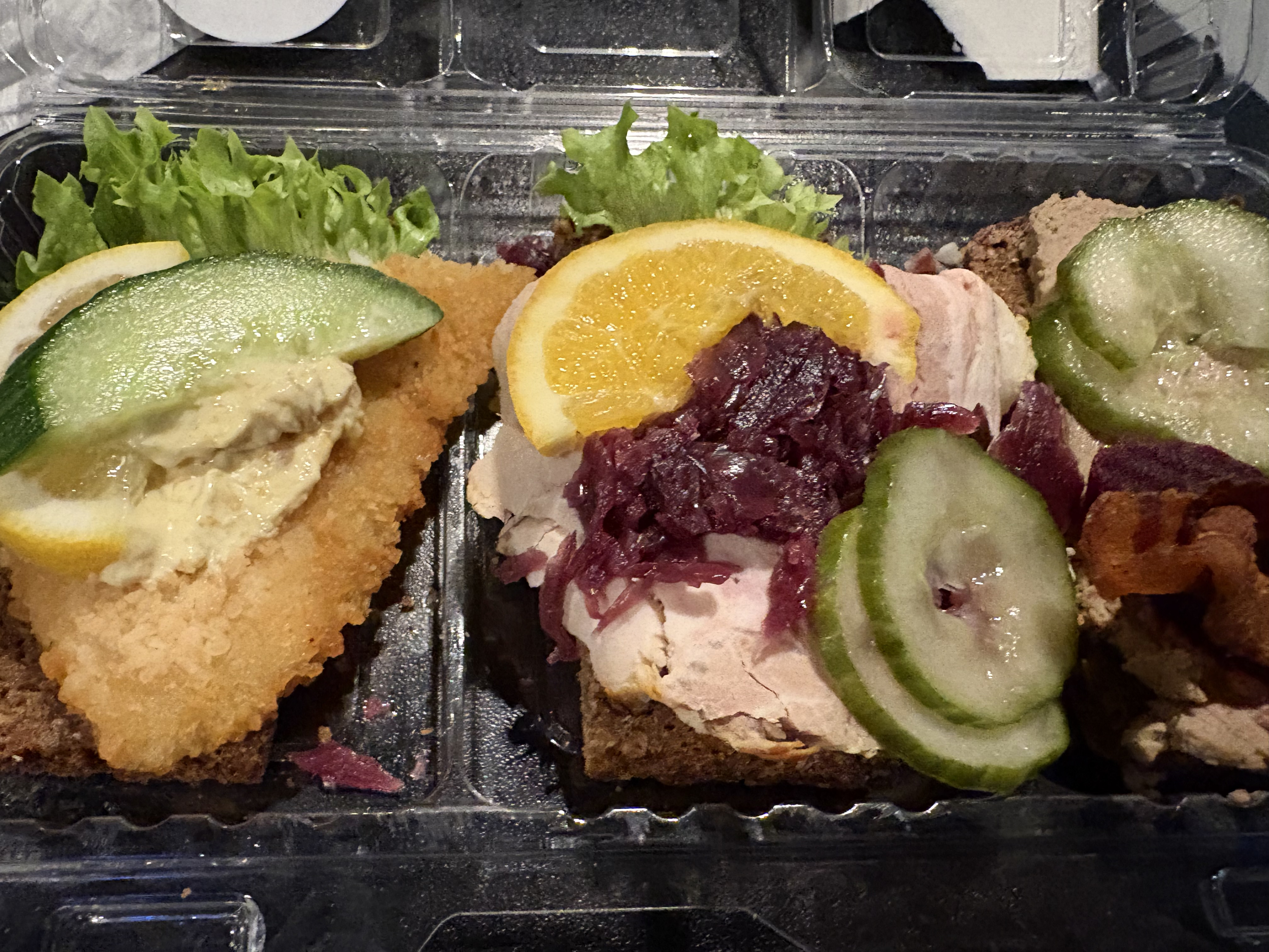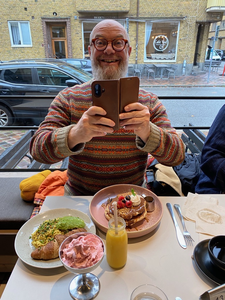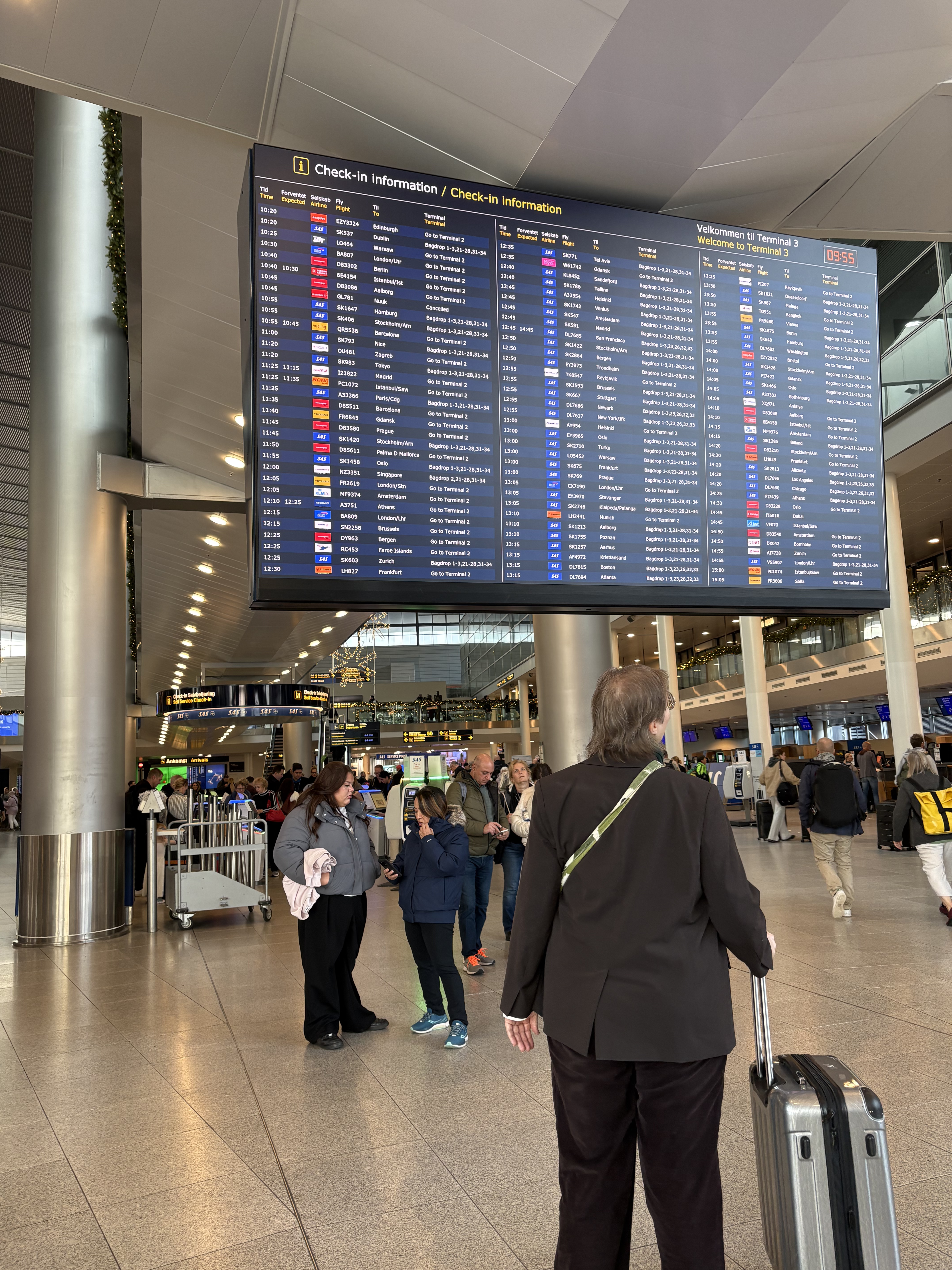 Checkar ut och mot Kastrup. Jag har fått övningar för mitt knä av fysioterapeuten och ett råd om att ha på mitt knäskydd – ett Baurefeind Genutrain som jag haft för att stärka vid en tidigare ledbandsskada. Ett brett gummiband är också nedpackat. Fortfarande ska jag ta det försiktigt med promenerande. Men säg det till flygplatserna. Vi går och går, checkar in bagage och går och går för att komma till säkerhetskontrollen och går och går för att komma till gaten. Innan dess går och går vi runt för att fördriva tid. Vi bestämmer oss för att äta för att inte helt hamna ur fas. Det blir den här gången i Kastrups Tivoli Food Hall, smørrebrød igen och en øl. Vi vänder oss till ett kafé runt hörnet för en kopp kaffe och möjligheten att äta upp de goda wienerbröden från igår. Just är står delar av Roxette, så det blir ett trevligt samtal innan take off. Z dokumenterar, förstås.