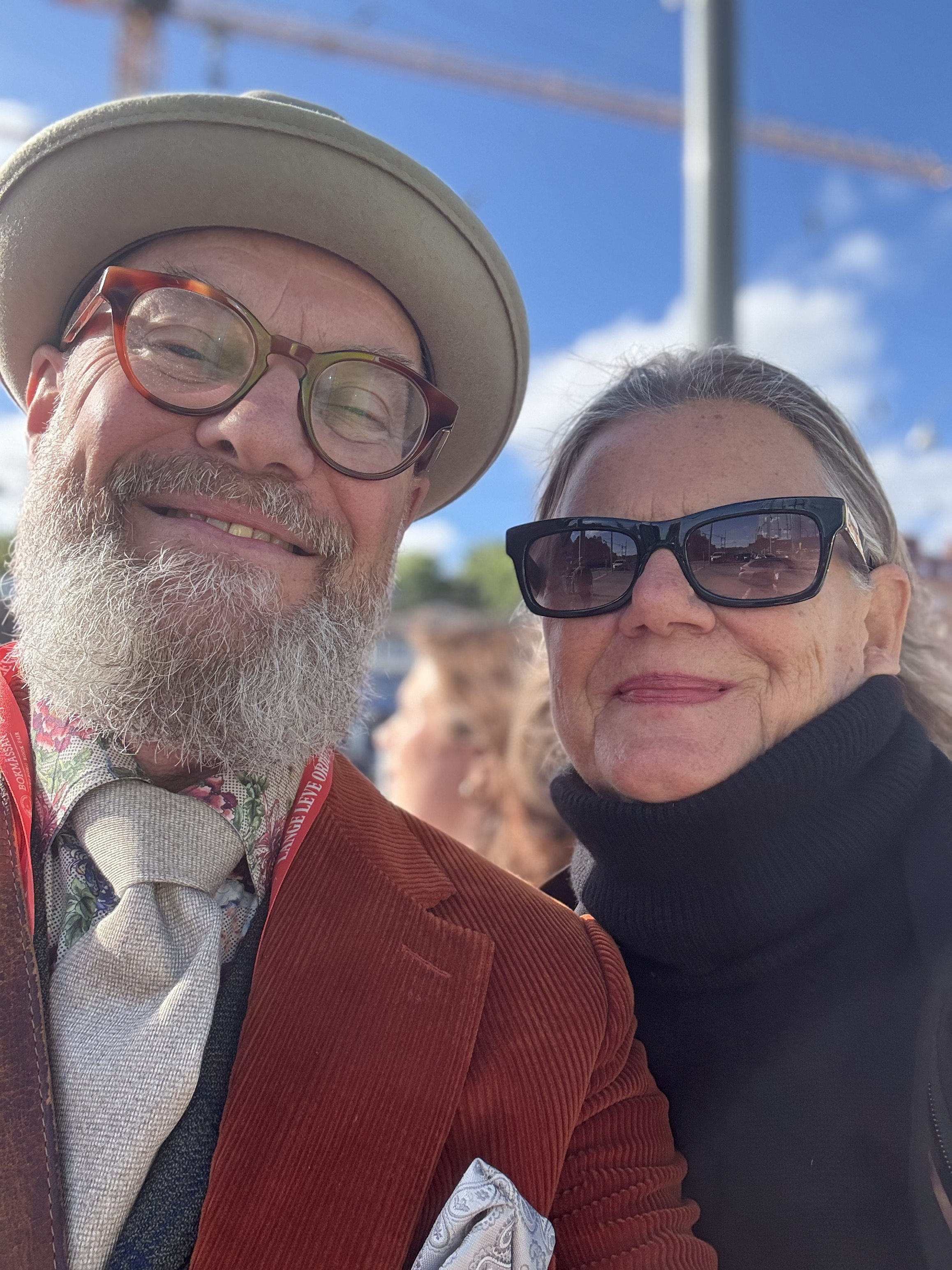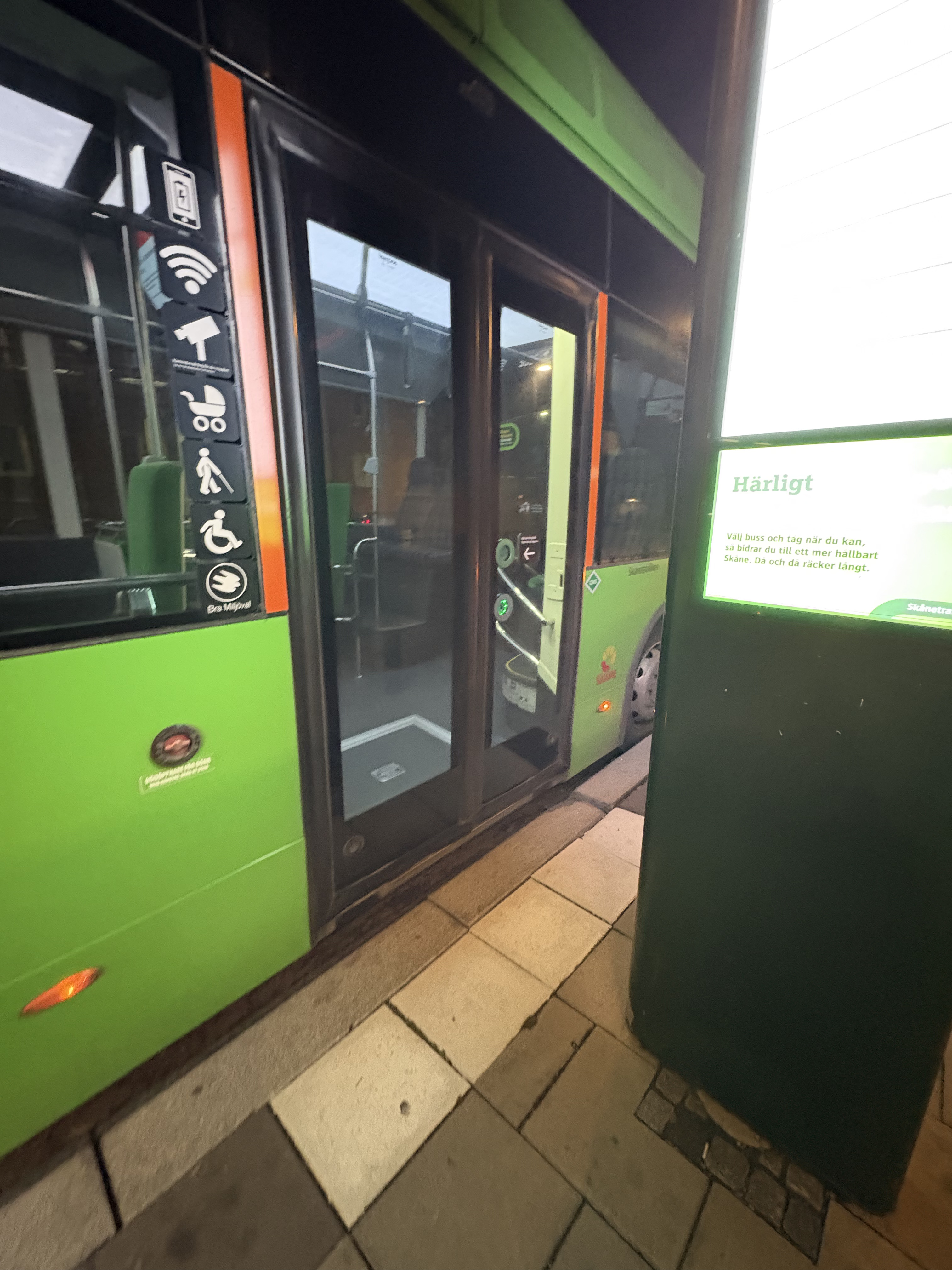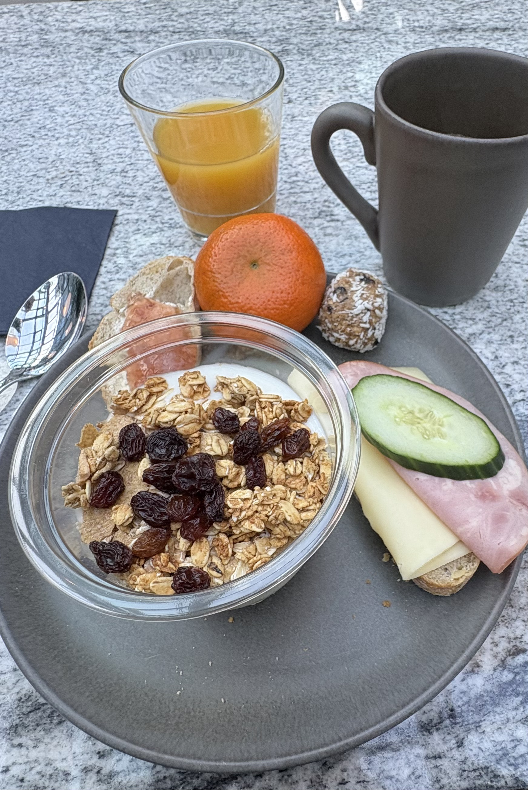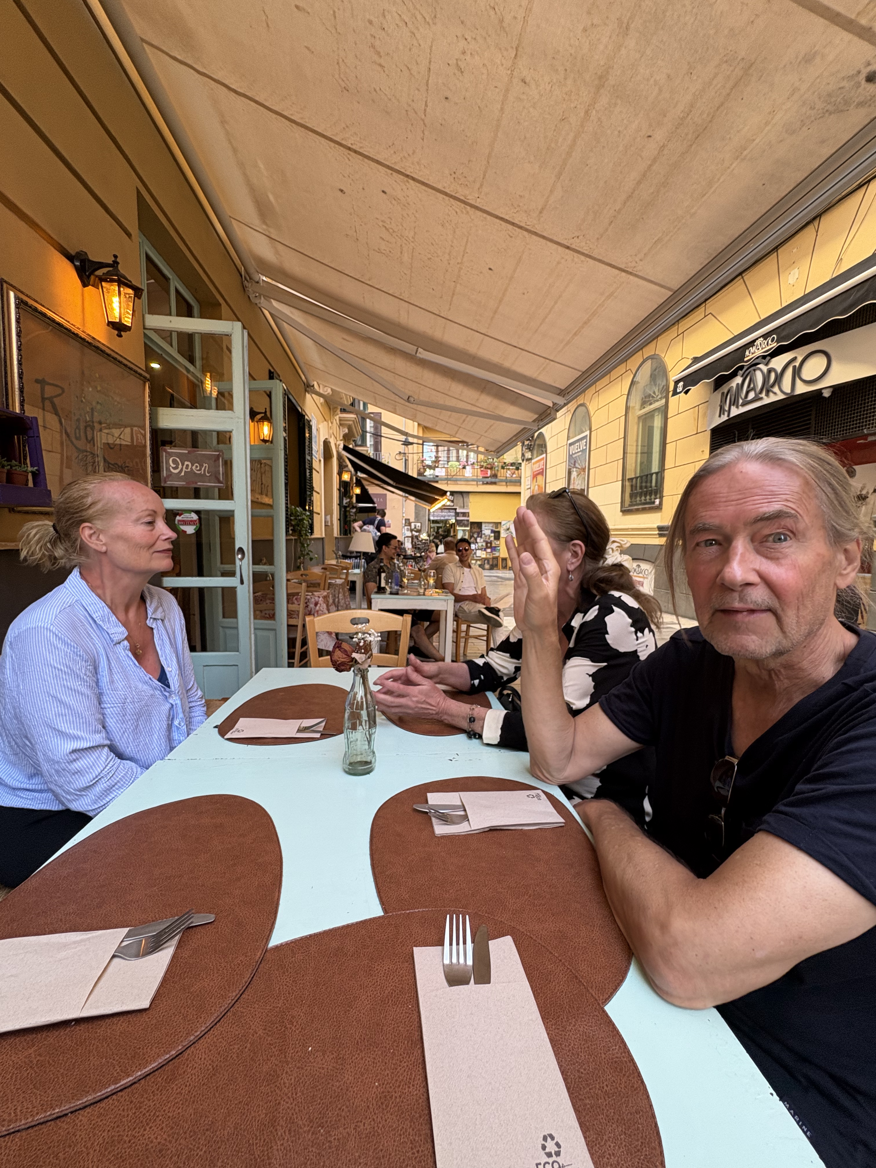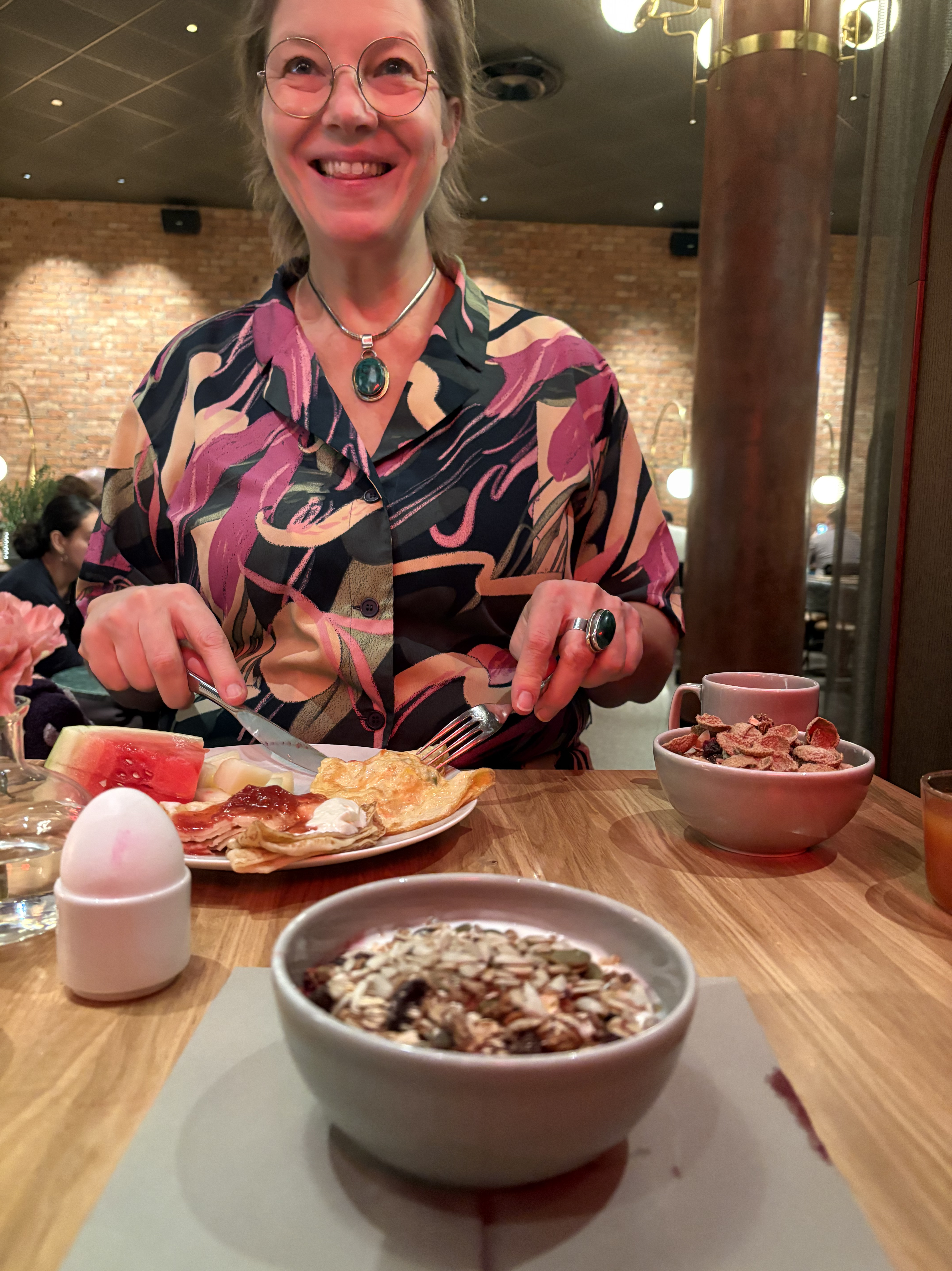 Checkar ut och mot Kastrup. Jag har fått övningar för mitt knä av fysioterapeuten och ett råd om att ha på mitt knäskydd – ett Baurefeind Genutrain som jag haft för att stärka vid en tidigare ledbandsskada. Ett brett gummiband är också nedpackat. Fortfarande ska jag ta det försiktigt med promenerande. Men säg det till flygplatserna. Vi går och går, checkar in bagage och går och går för att komma till säkerhetskontrollen och går och går för att komma till gaten. Innan dess går och går vi runt för att fördriva tid. Vi bestämmer oss för att äta för att inte helt hamna ur fas. Det blir den här gången i Kastrups Tivoli Food Hall, smørrebrød igen och en øl. Vi vänder oss till ett kafé runt hörnet för en kopp kaffe och möjligheten att äta upp de goda wienerbröden från igår. Just är står delar av Roxette, så det blir ett trevligt samtal innan take off. Z dokumenterar, förstås.