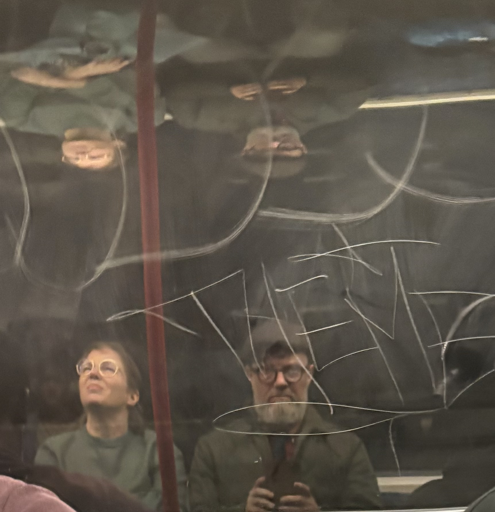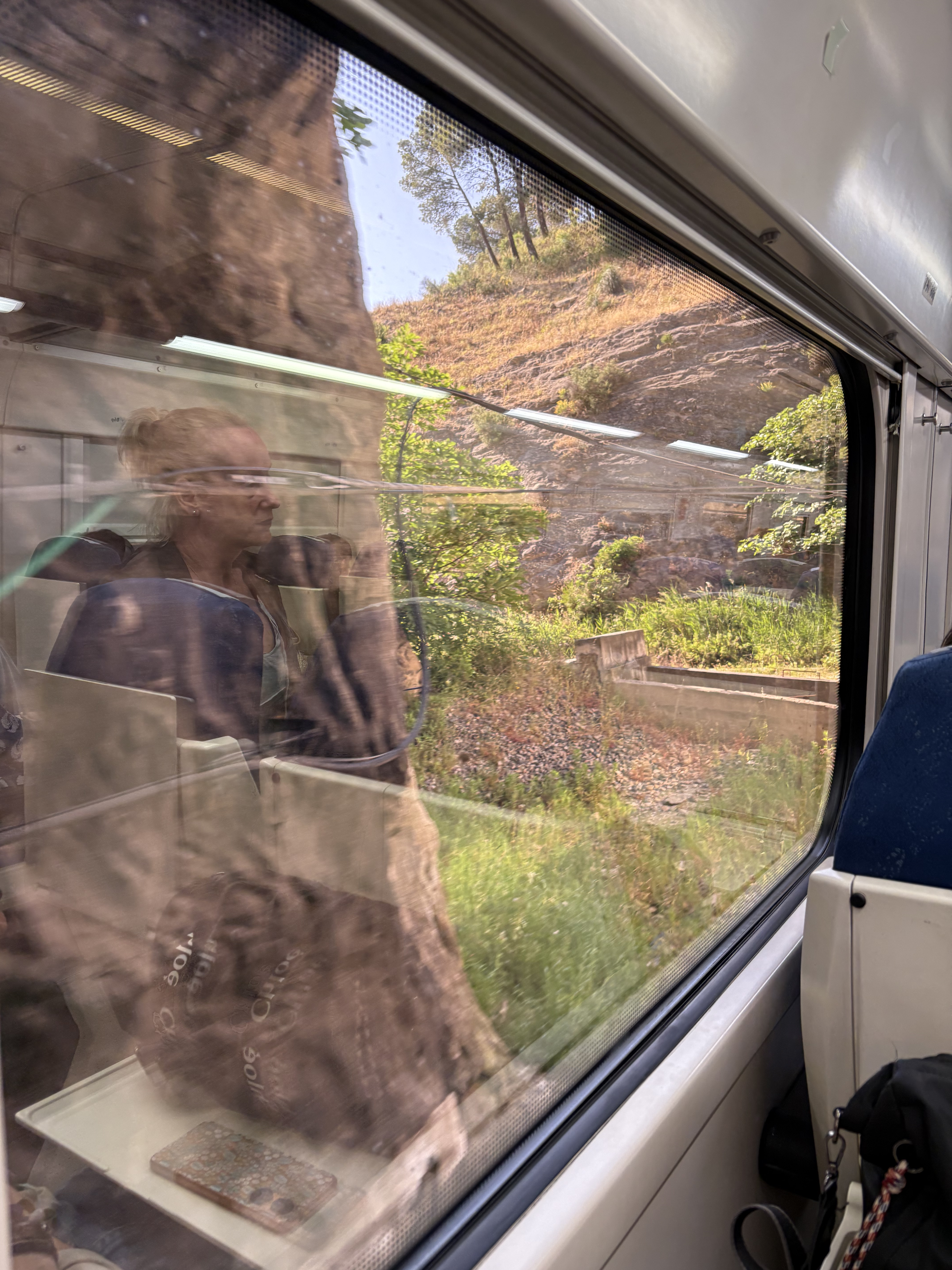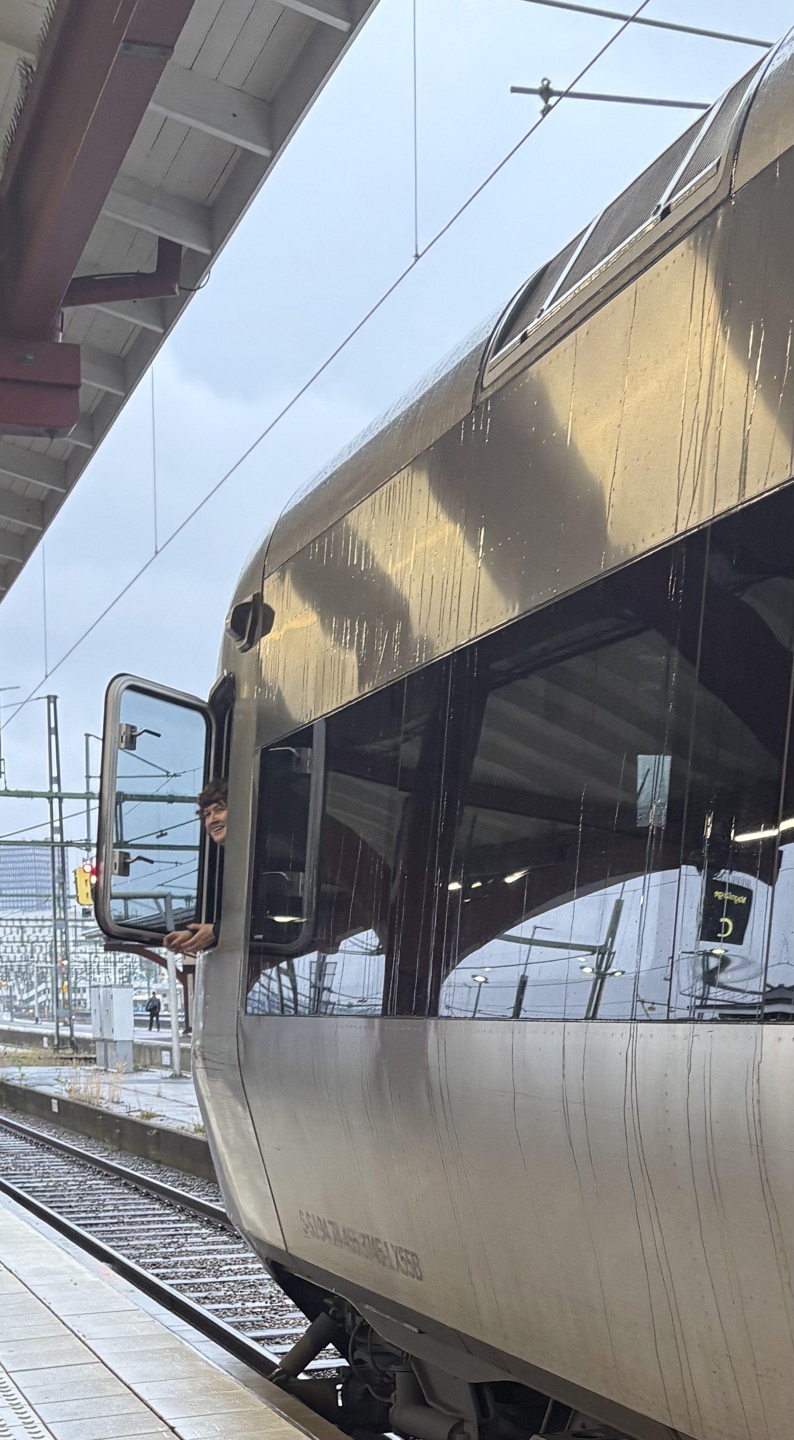 Vid nästa terminal är det ett myller av folk. Vi placerar oss girigt så strategiskt som möjligt och när tåget väl kommer efter en dryg väntan kliver Z frankt på och tar plats för oss båda. Hon är medveten om att stå inte är ett bra alternativ för mitt knä.