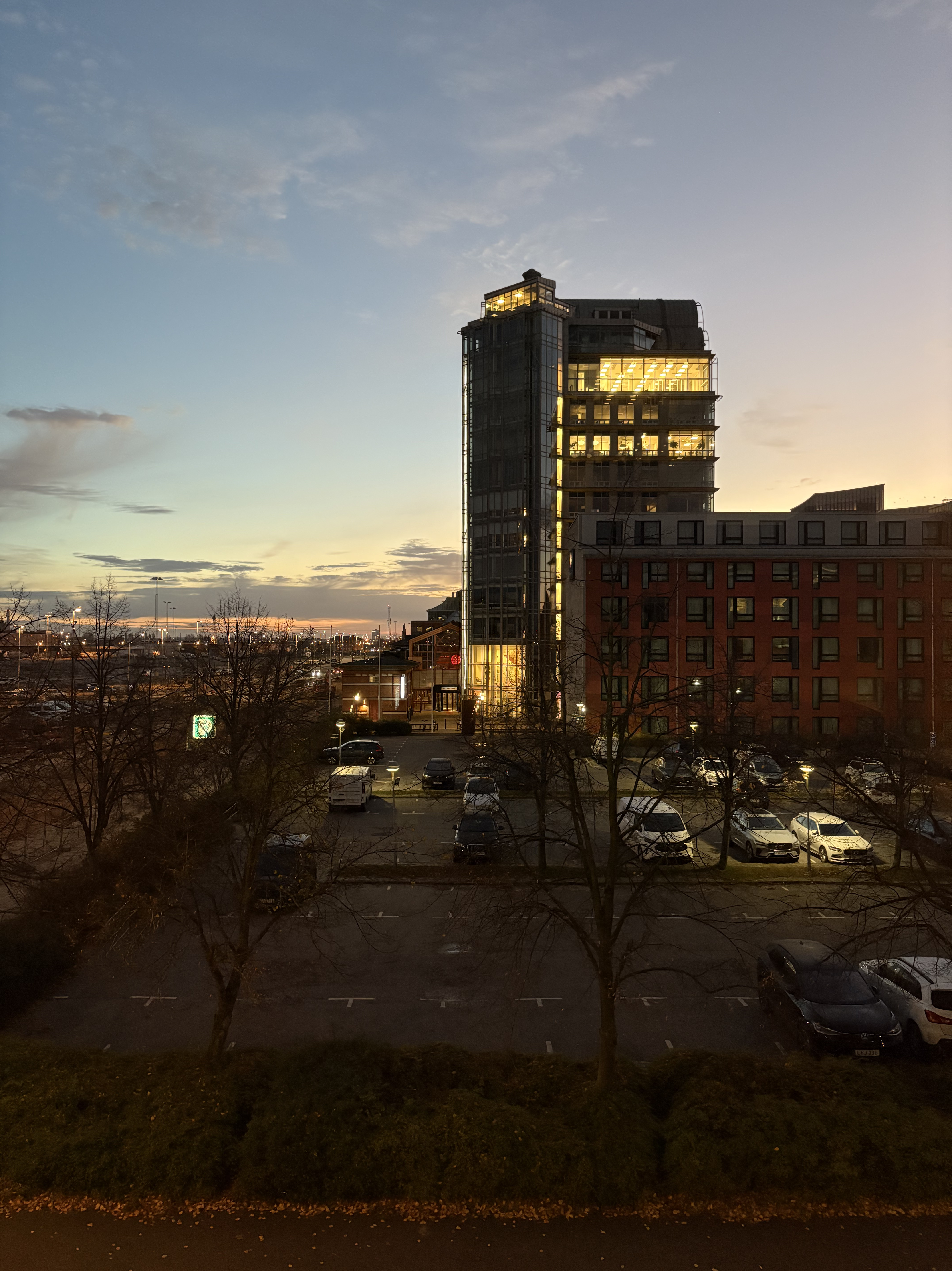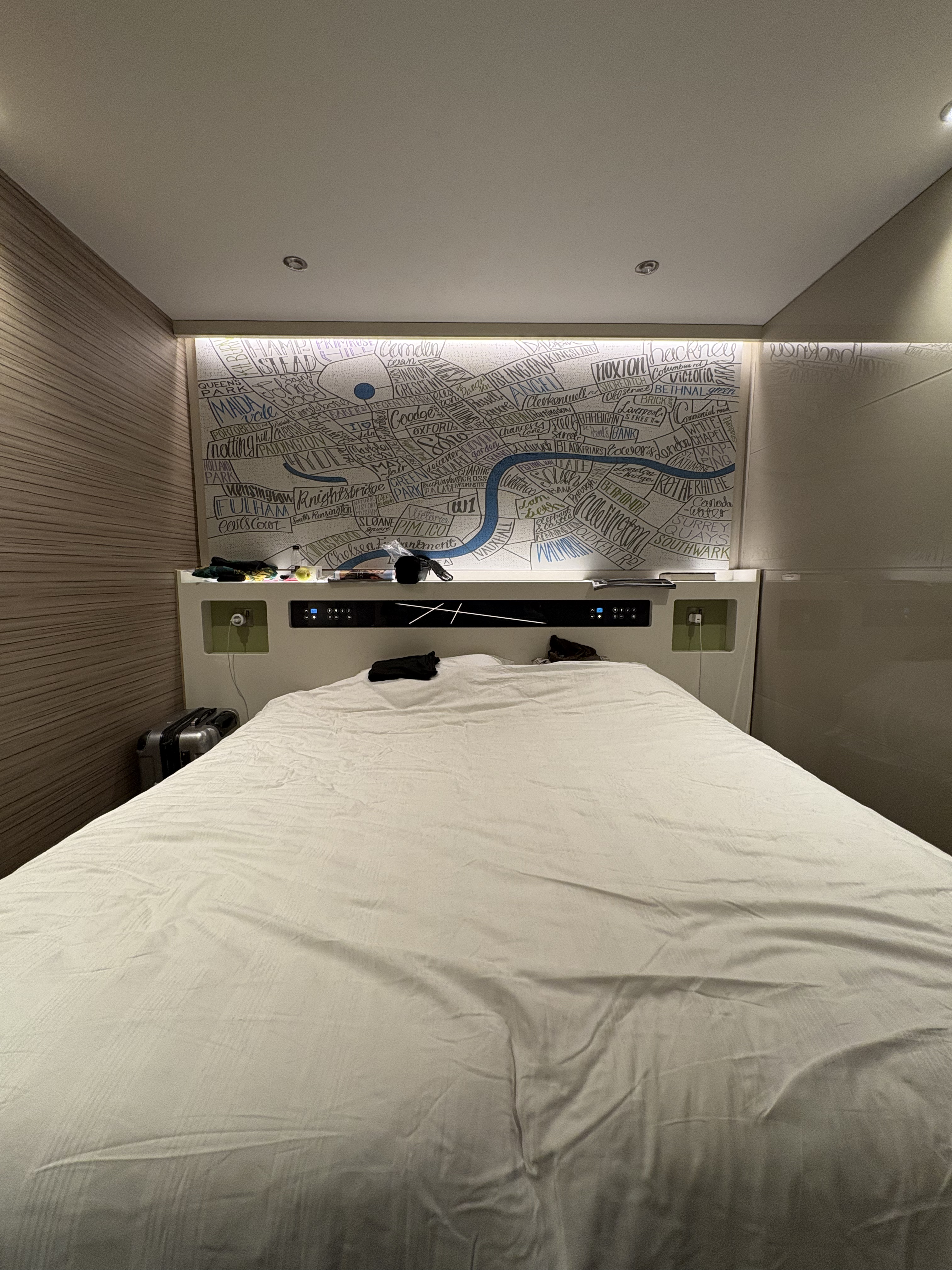 Så småningom kommer vi rätt, jag skymtar St Mary’s Hospital, som är ett riktmärke för mig, och vi knallar den vackra novemberdagen mot Edgware Road, som vi ska korsa och går vidare mot Old Marylebone Road, där hotellet ska ligga. Vi löser det efter lite bristfälligt orienterande och kommer fram till vår vistelse som ligger i hörnet av stora leden Marylebone Road. Hub by Premier Inn London Marylenebone är rätt nybyggt och ett högt hotell. Vi får ett rum på nionde våningen och möts av ett fräscht rum, men fönstret är i ena hörnet, minimalt och man kan bara ana den intensiva trafiken nere på Marilybone Road och, lite längre bort, Marilynebone Station. Men det blir bra. Sängen är spatiös, ett gemensamt täcke oroar initialt, men när vi väl somnar långt senare störs vi inte alls. Inte heller av att det bara finns handdukar för en person, men det löser vi senare.