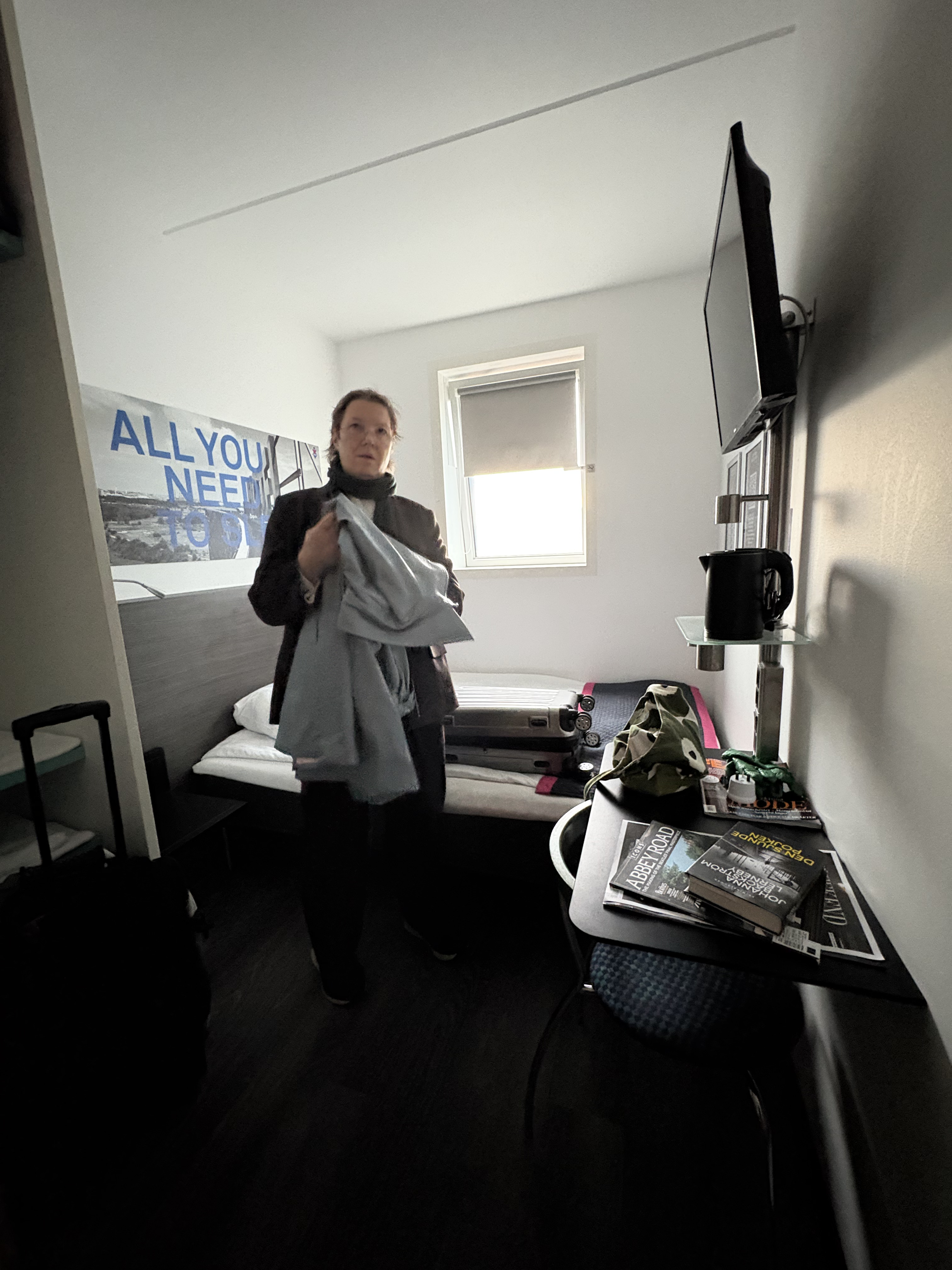 Sängen är trång, men sällskapet gott. Jag sover mot fönstret, måste diskret försöka smita förbi Z som sover på ytterplatsen. Nattens toabesök klaras av. Sedan kommer gryningen och hennes väckarklocka ljuder. Vi packar i ordning, fixar oss lite hastigt för frukost som är nere i källaren. Det blir en ok måltid i en matsal som en bamba. Så upp på rummet igen för att borsta tänderna och packa ned allt. Det blir lite mer än det var tänkt och mer än det som fanns plats i väskorna från Göteborg.