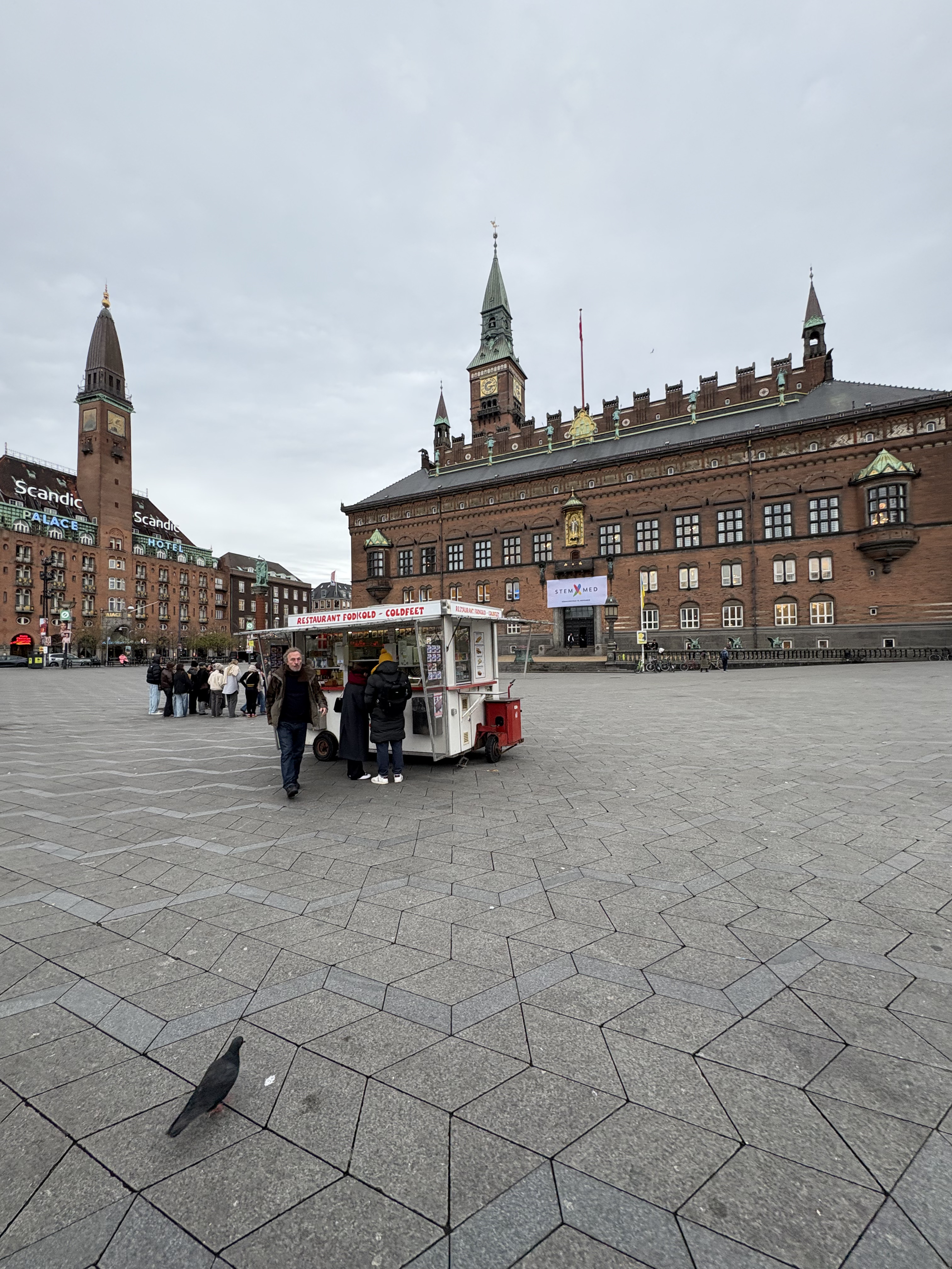 När vi kliver av vid Hovedbanegaarden är det strax efter lunch. Hungern pockar. Så vi går mot Tivoli, där nöden inte har någon lag. Jag smiter in med Z i Tivoli Food Hall. Hon för att spana efter de digra utbudet av maträtter; jag för att stapla ned för trapporna till toaletterna. Väl färdig och i samklang med Z konstaterar vi att det inte bli någon mat där i de stimmiga lokalerna. Vi söker oss förbi det klassiska nöjesfältet, mot Rådhuspladsen, över den trafikstridiga HC Andersens Boulevard och mot Frederiksbergsgade, den första av gatorna på Strøget mot Kongens nytorv.