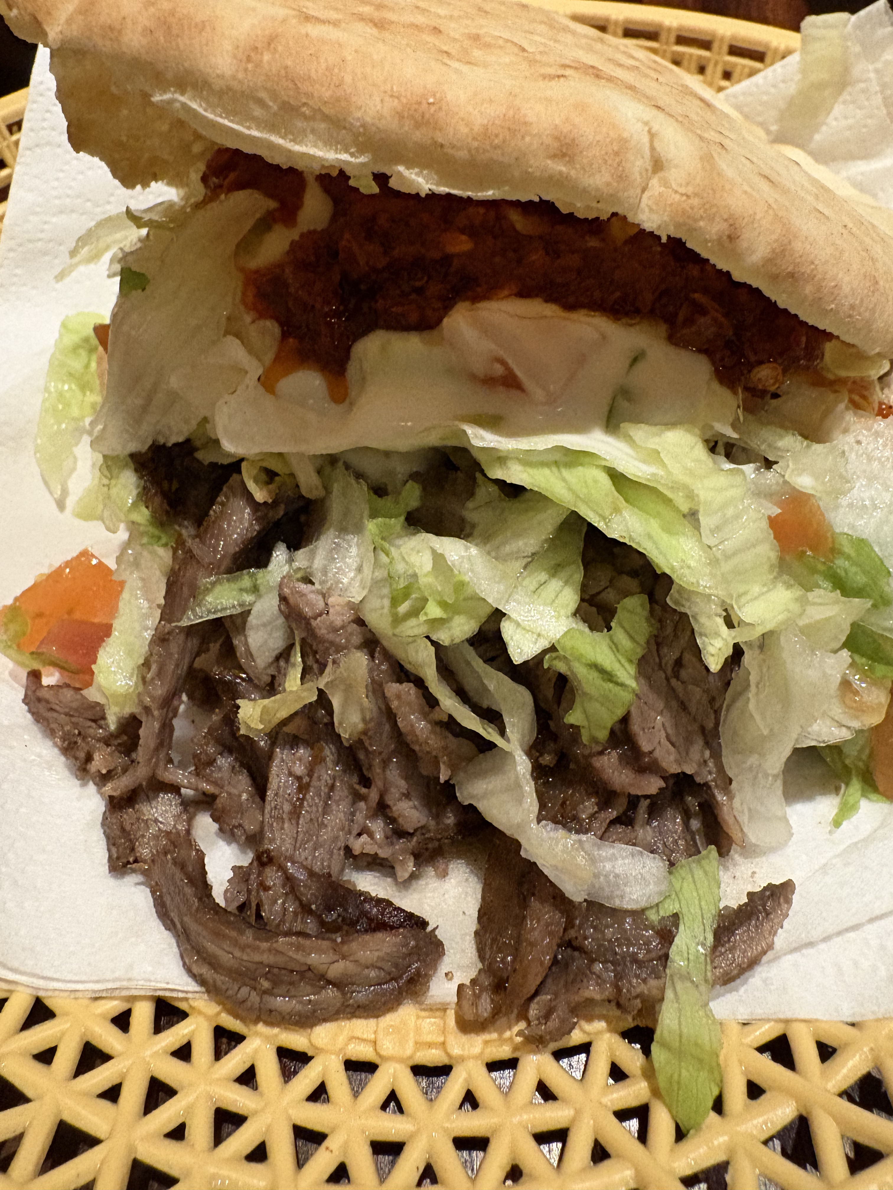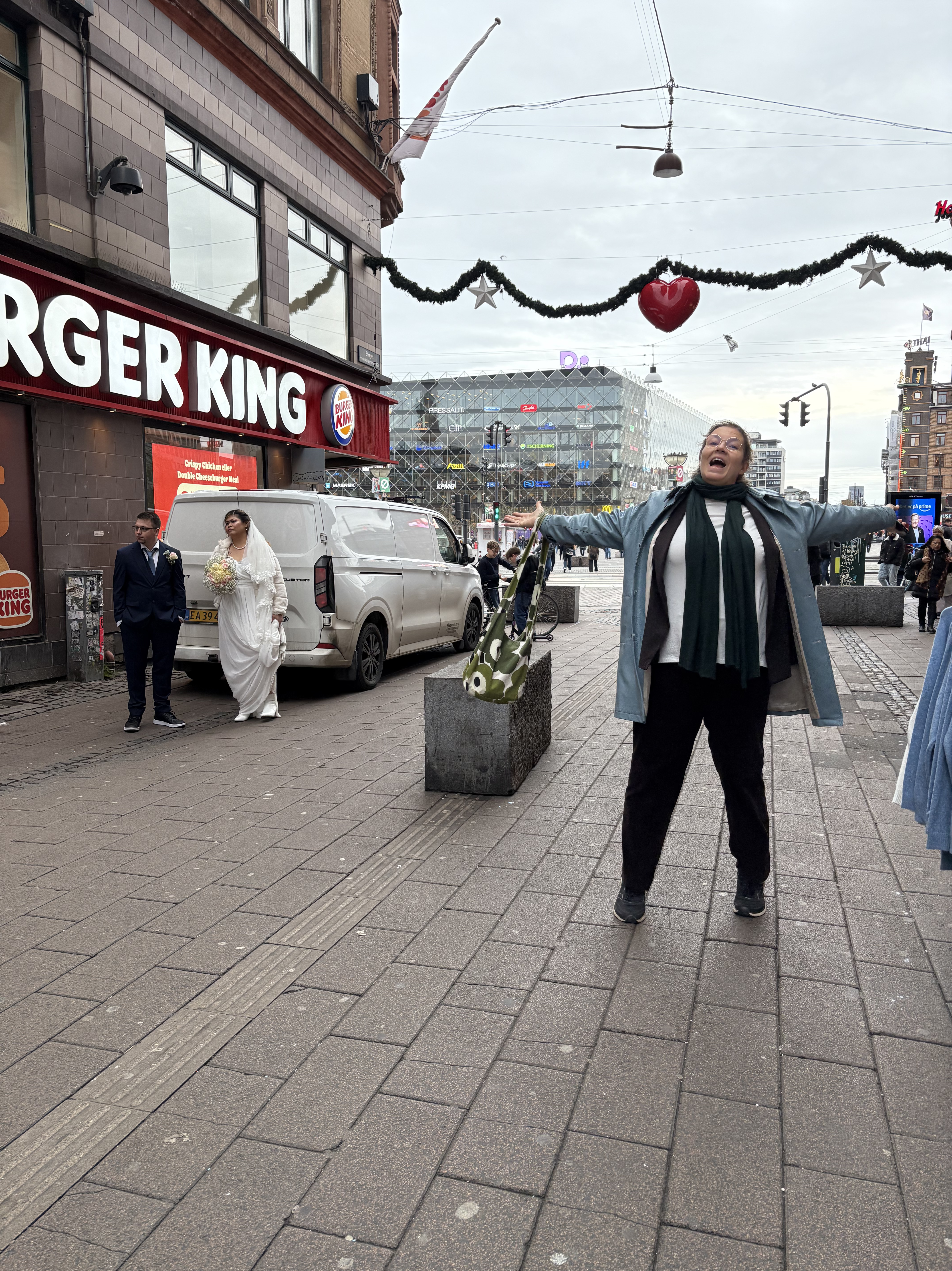 Z poserar vid entrén av det berömda gåstråket och jag fångar henne tillsammans med ett bröllopspar, som ovetandes blir med på bilden. Bara några tiotal meter därifrån ligger målet för vår promenad: Shiwarma grillhouse. Stället som tillsammans med hålet i väggen vid Prøvestenen utanför Helsingør bjuder på de bästa shiwarma man kan önska. Jag tar plats. Z, som beställt och betalat, kommer efter. Jag undrar över bestick. Hon hämtar tjänstvilligt och återvänder med kommentarerna om att männen tyckte det var konstigt med bestick till shiwarma i pitabröd. Men jag vill inte kladda. Har det kanske efter pappa, som hatade att äta hamburgare för då använda han händerna för att äta.
