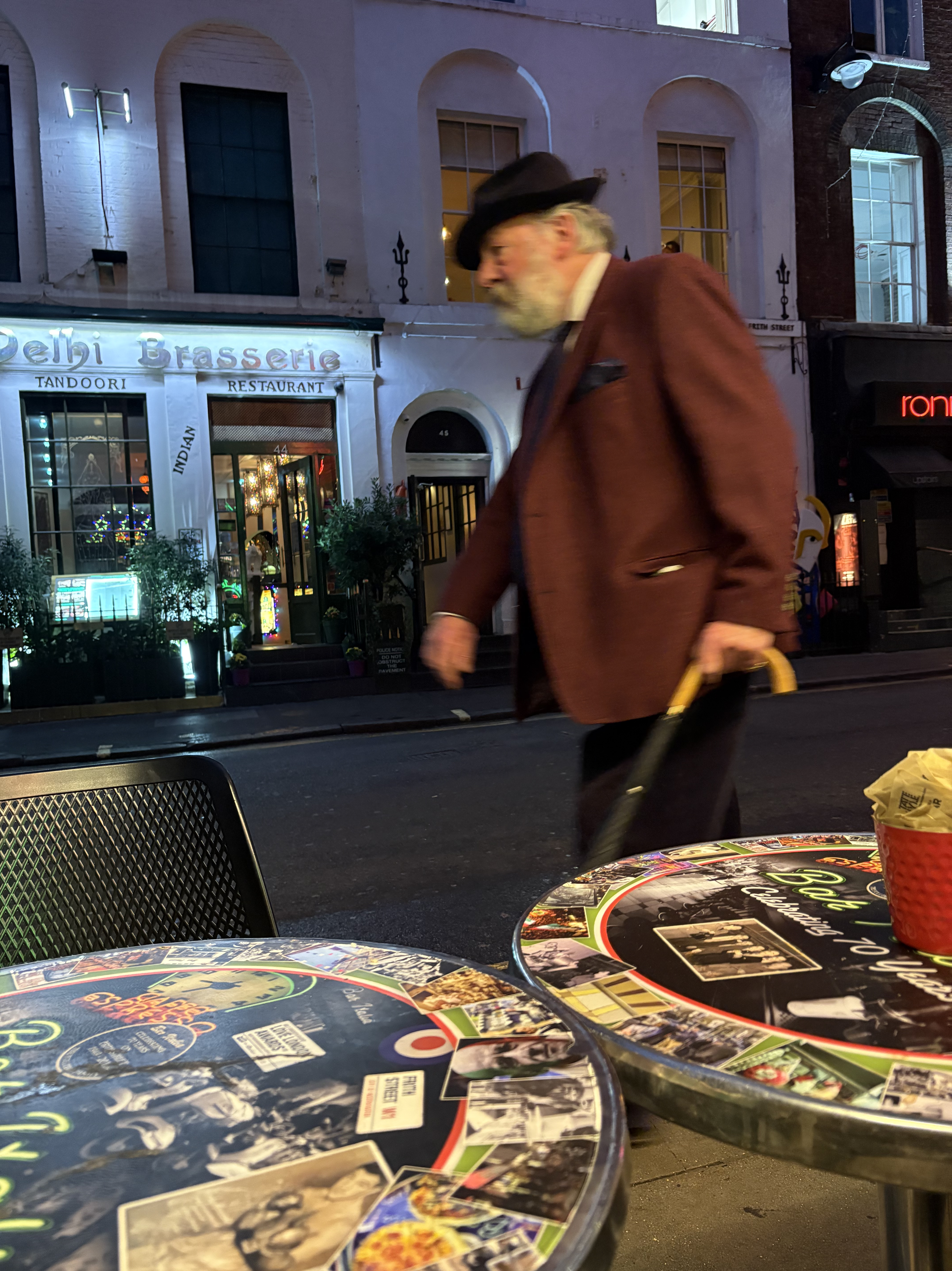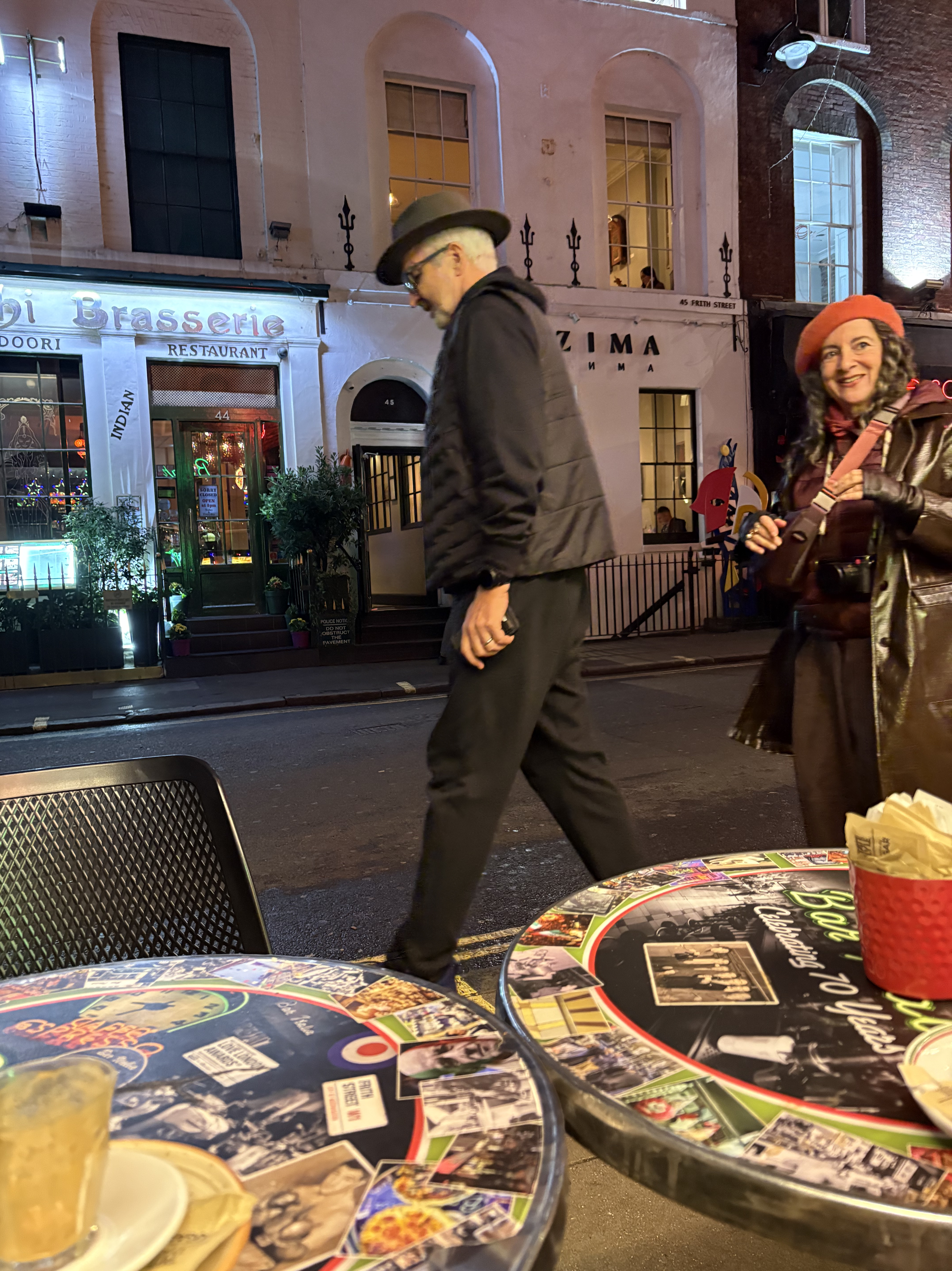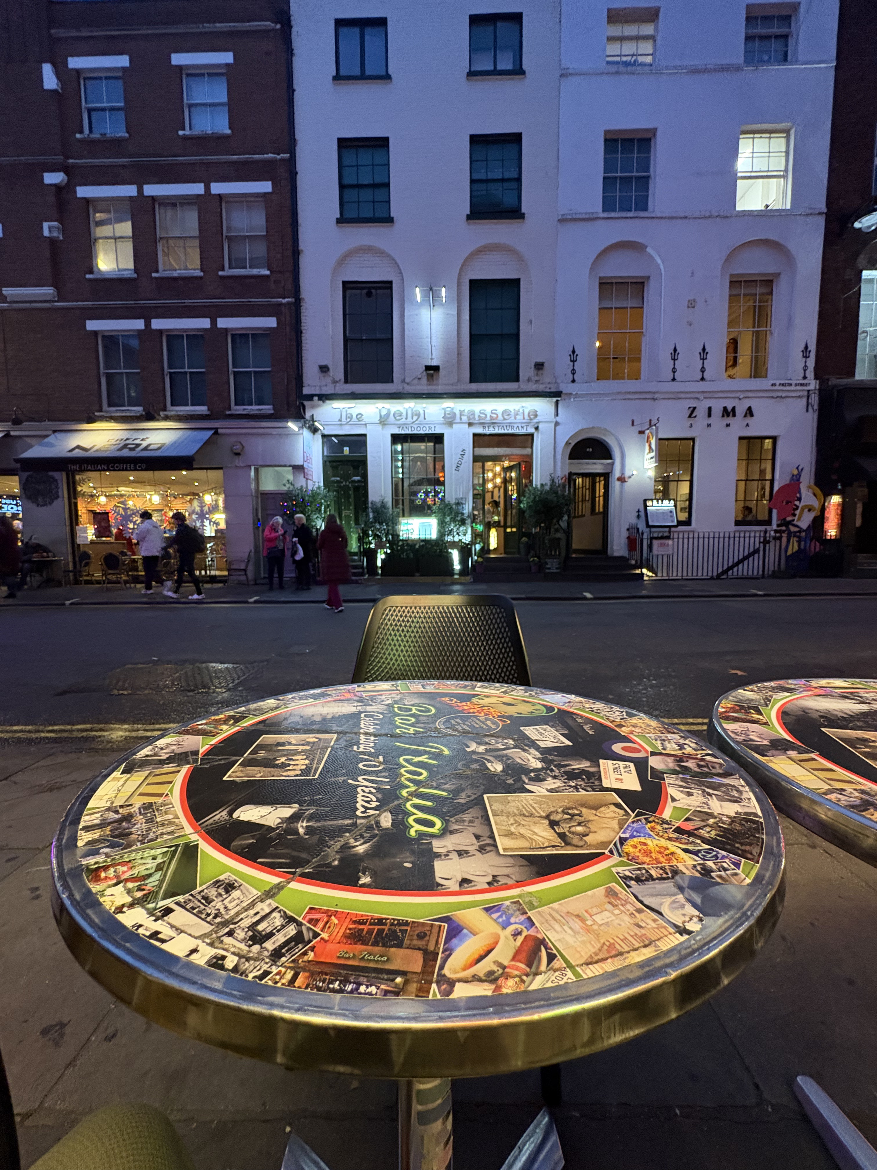 Vi betalar, bryter upp och söker oss mot Frith Street där vi hittar ett ledigt bord utomhus vid Bar Italias servering. Jag sitter med mina shoppingkassar och bevakar våra platser, som vi tingat bredvid varandra för att kunna spana in det intressant gatuklientelet. Z ordnar beställningen, som inte kommer och när vårt grannbord blir serverade först går Z in med bestämda steg för att höra vad som hänt. Jo, vi har blivit bortglömda, men allt ordnar sig och hos Bar Italia har man all tid i världen.