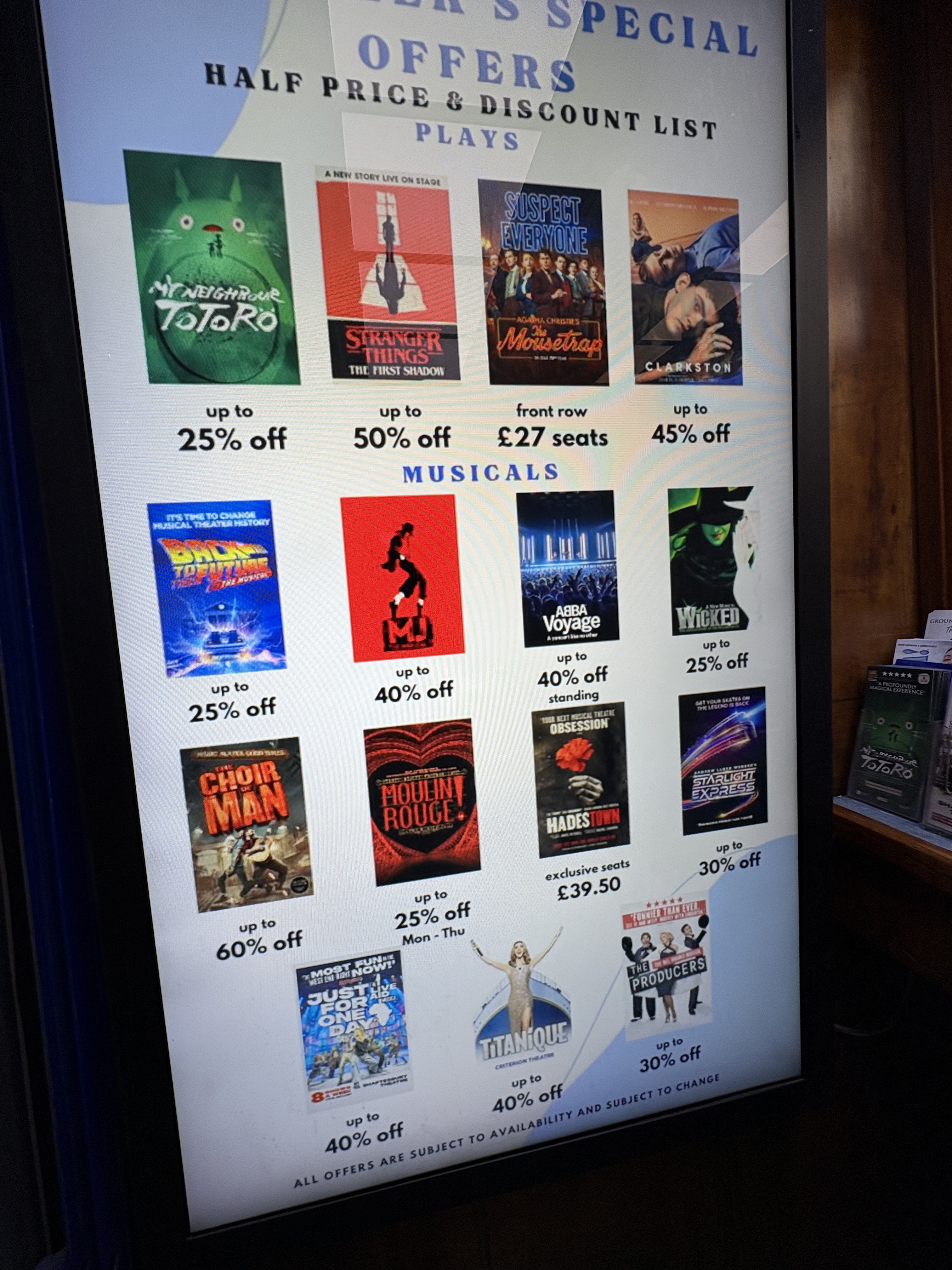 Vi lämnar med saknad och rör oss mot Leicester Square för att nu ska vi köpa biljetter till ”Abba Voyage”. Vi dividerar länge om vilken prisklass vi ska ta, men landar vi den lägre som kommer innebära ståplatser. Det får gå. Gubben vill helst sitta. Ja, hans gumma likaså. Men prisskillnaderna är radikala.