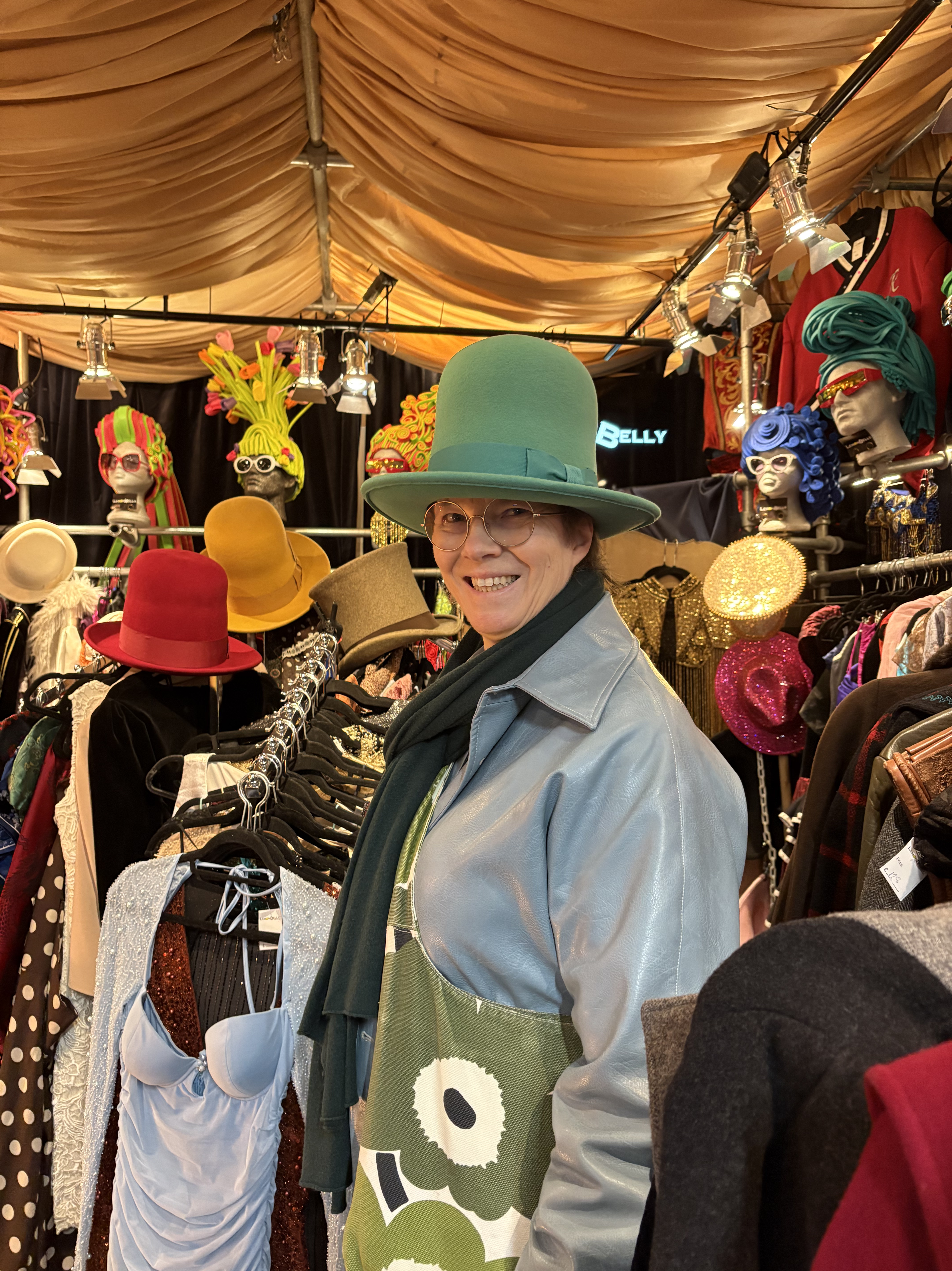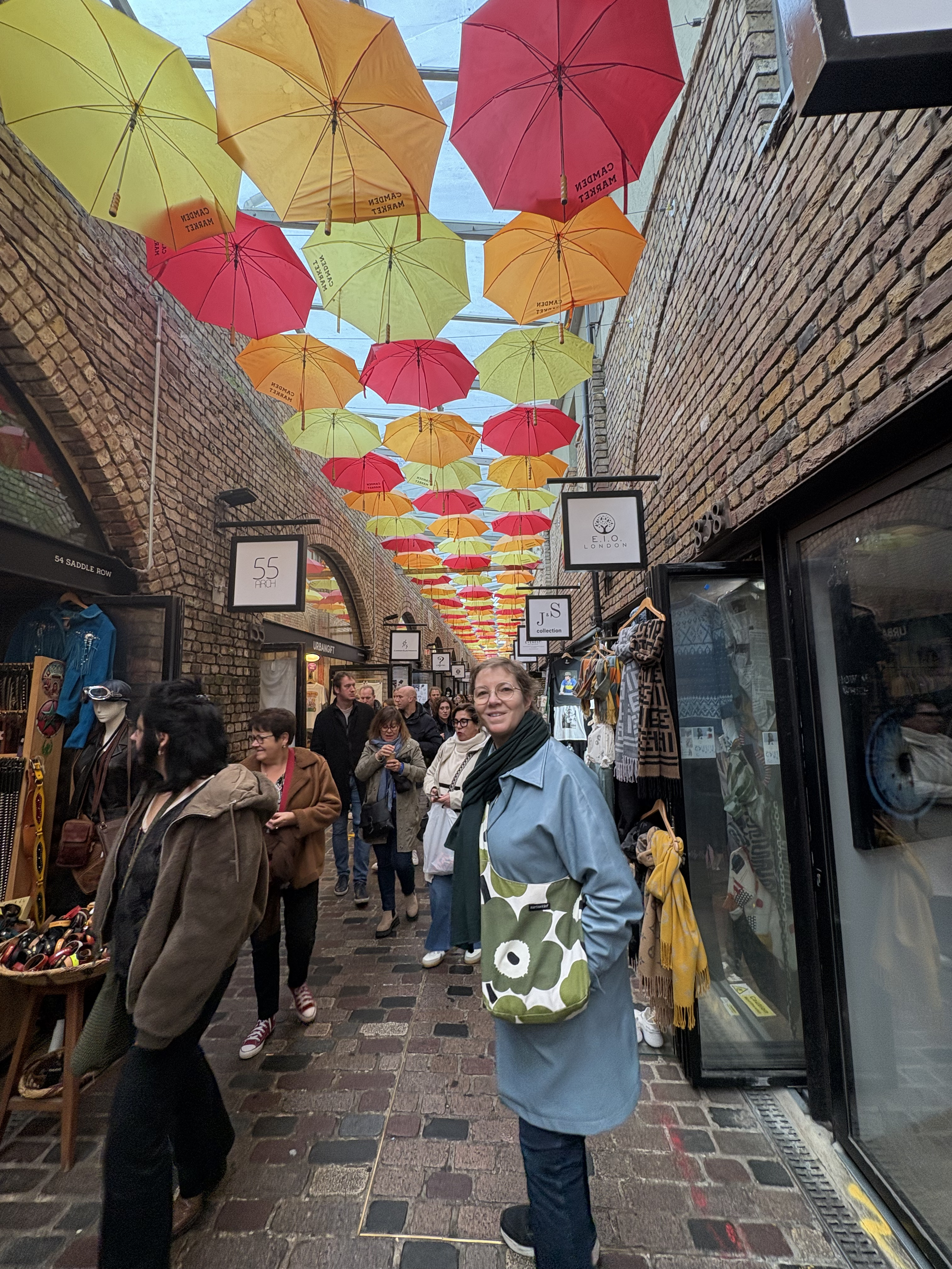 Z längtar alltid till Camden och det brus av turism, atmosfär och kommers som är där. Vi tar bussen och får en guidad tur på vårt eget vis med våra Oyster Card. Vi kliver av bara något kvarter från händelsernas centrum och slukas genast in i folkvimlet. Dagarna i London har, förutom någon regnskur, bjudit på milt, vackert höstväder. Prasslande lönnlöv kantar våra promenader och det hela känns behaglig. Jag har inte behövt använda min vändbara Burburryrock, som jag fyndade på en loppis i Marbella i våras, mer än någon enstaka gång. Den har helt enkelt varit för varm. Det har blivit min gråa Sand, secondhandkavajen jag hittade hos Stadsmissionen i Arkaden tidigare i år. På huvudet en Stetsonkeps, skjorta och pullover, halsduk, ett par grå yllebyxor, strumpor och ett par Clarks-skor med gröna snören – allt secondhand.Det räcker i swinging London utan att sticka ut.