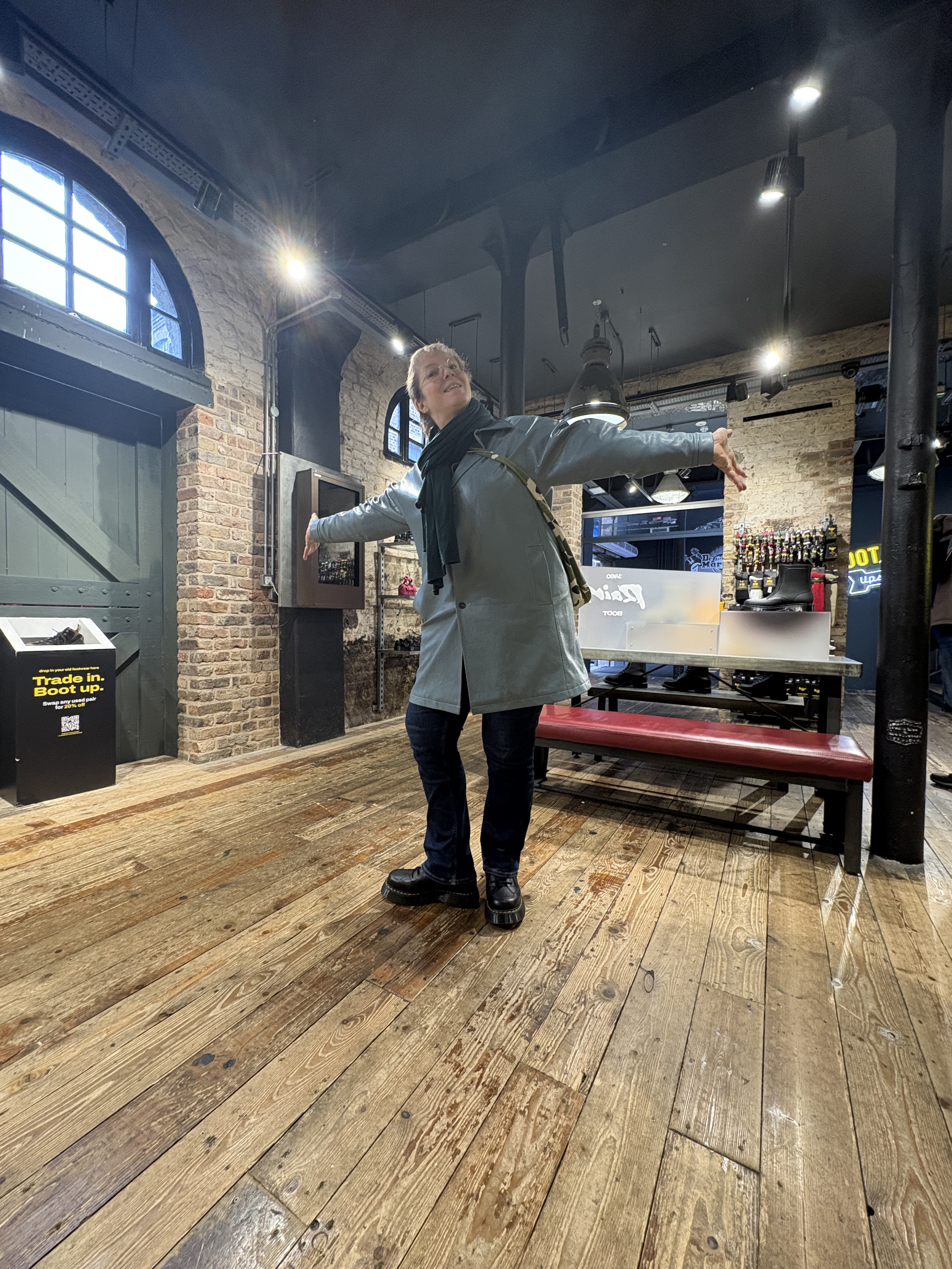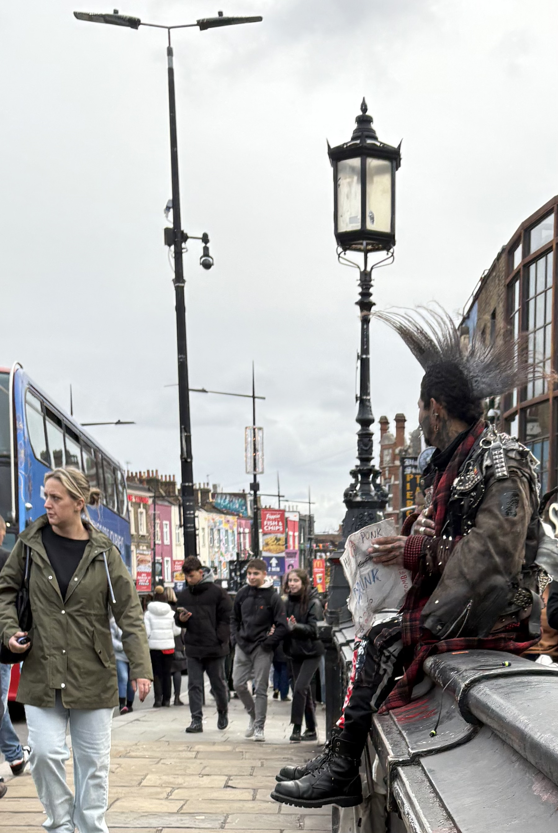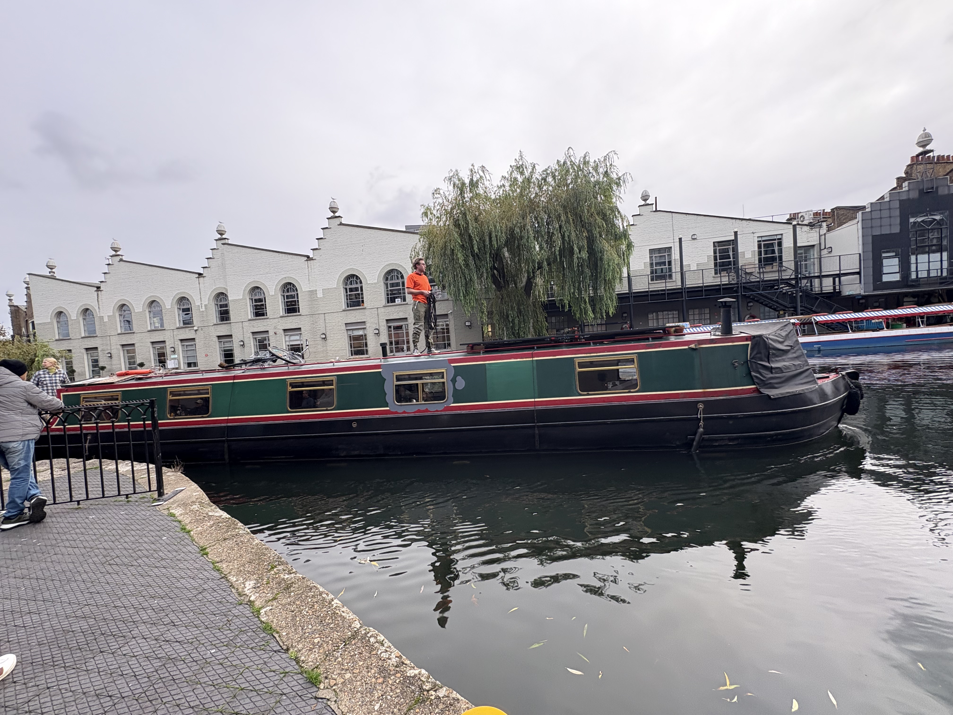 Vi fortsätter in i Dr Martensbutiken, där Z fastnar i både skoprovande och -köpande, som går ovanligt fort. På andra våningen i butiken finns något av ett museum med rockstjärnor som alla i olika sammanhang burit just Dr Martens. Vi tar en kik, fortsätter ut och in i matmarknaderna och en och annan butik, bestämmer oss för att försöka hitta busshållplatsen i motsatt riktning som vi kom. Men först travar vi Chalk Farm Road ner, passerar bron över slussområdet. En punkare sitter med en enorm mohikan och en skylt om att få bli ”a drunk punk”, men verkar mest vara en institution, en clown, en gycklare. Vi korsar gatan, går ned mot de nya området med mer snobbiga butiker och därmed mindre puls. Vi kommer ner till slussarna där en pråm just ska docka in i en sluss för vidare färd på Grand Union Canal. Mannen springer som en skeppsråtta för att öppna portarna medan kvinnan styr båten med van hand. Det tar sin stund och de får sin publik, inklusive de haschrökande a-lagarna som sitter på parad vid en bänk mot en vägg med utsikt över det som händer.