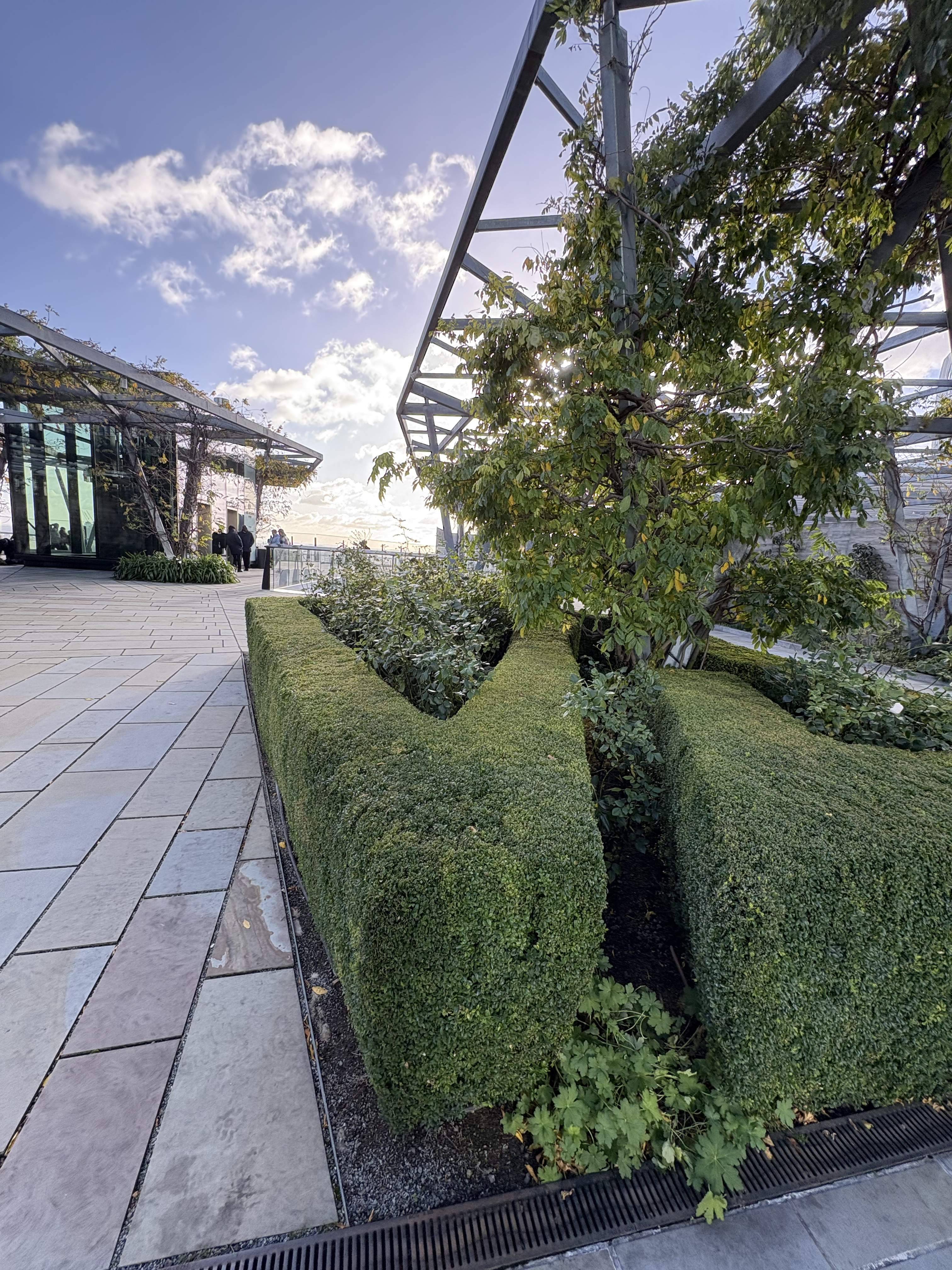 Vi hittar ett ställe för bagageinlämning, men Z är övertygad om att det finns skåp någonstans. Vi irrar oss ut mot den väldiga stationshallen för att irra oss tillbaka. Det finns bara den. Vi lämnar in våra väskor och promenerar mot den perrong som ska ta oss via Circle Line till Aldgate. Prefekt, det kommer ett tåg, men plötsligt är destinationen ändrad. Nästa tåg går långt mycket senare. Märkligt. Vi stannar tålmodigt, men bestämmer oss för att istället ta oss till Aldgate East, som borde ligga inte så långt ifrån Aldgate. Det funkar. Vädret är strålande och Z har bestämt att vi ska utforska ett av många ”hemliga” ställen, som denna botaniska trädgård på toppen av ett hus.