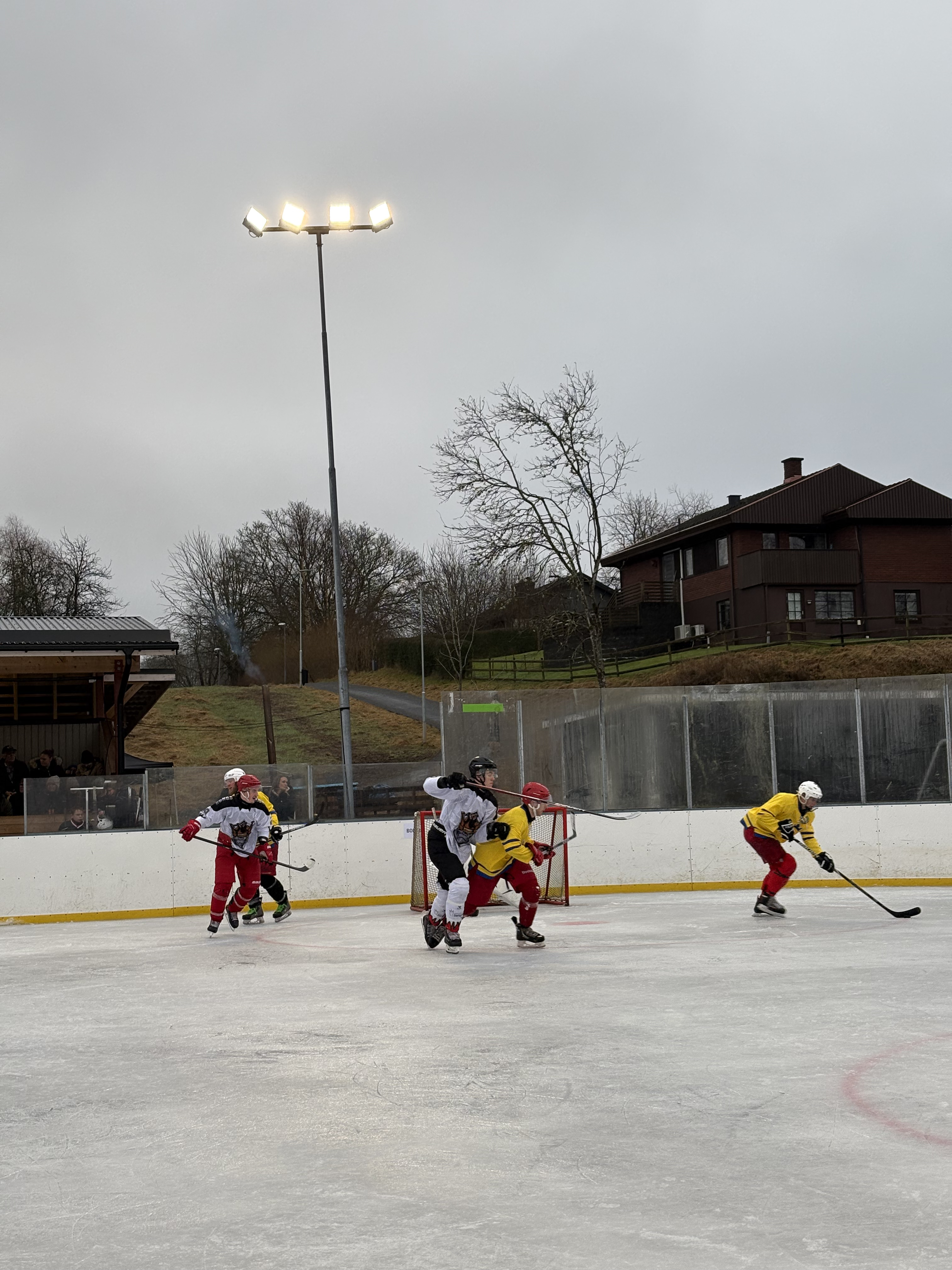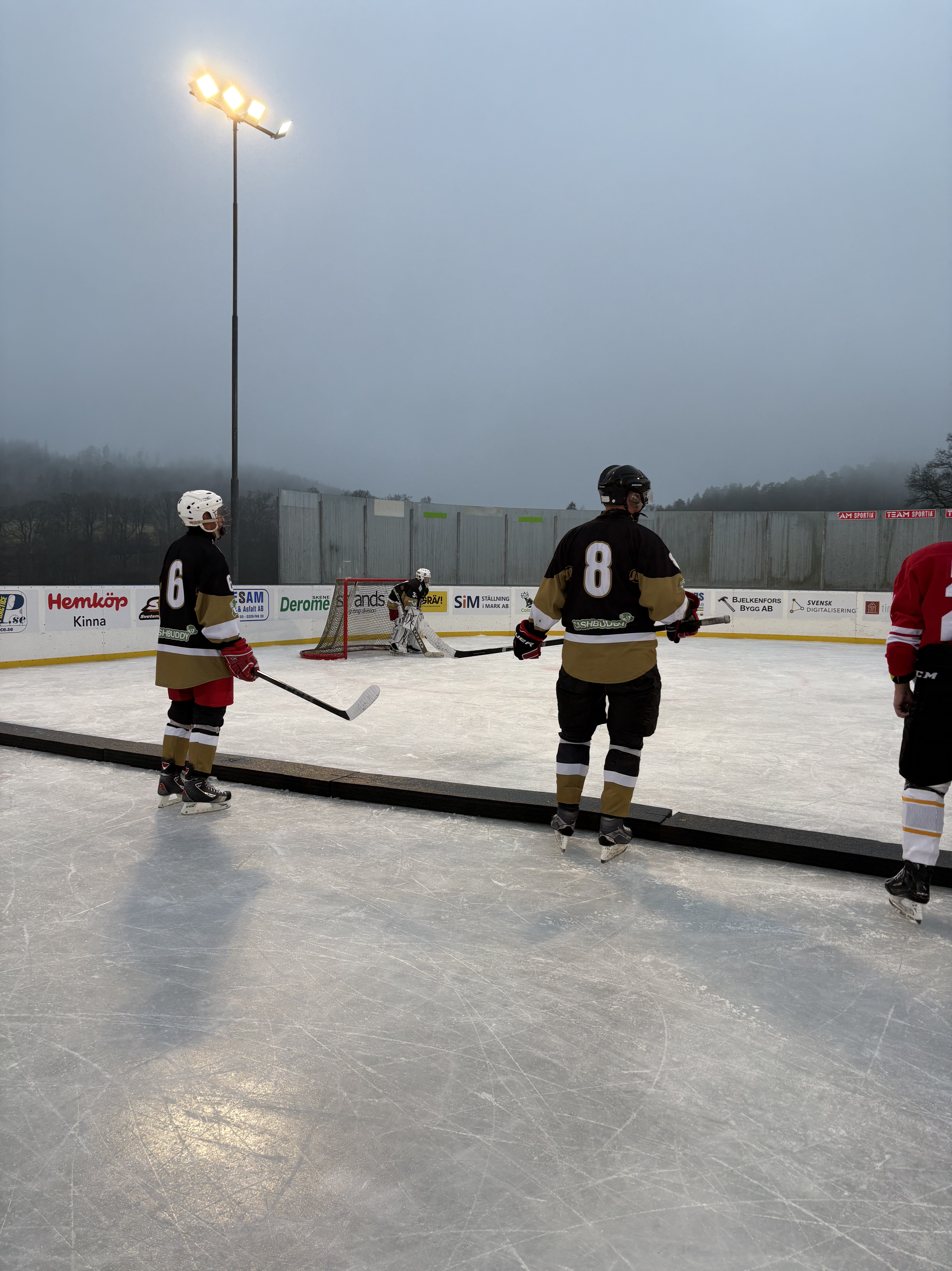 Jag presenterade mig för laget och som udda fågel tog jag plats i den märkliga rinken. I storleksordningen var den som lite mindre än Frölundaborg. Men rinkens mått…! Längden som de europeiska. Men bredden var några meter ytterligare. Dessutom var yttersidan av sargen klädd i tegel. Stabilt och bra.