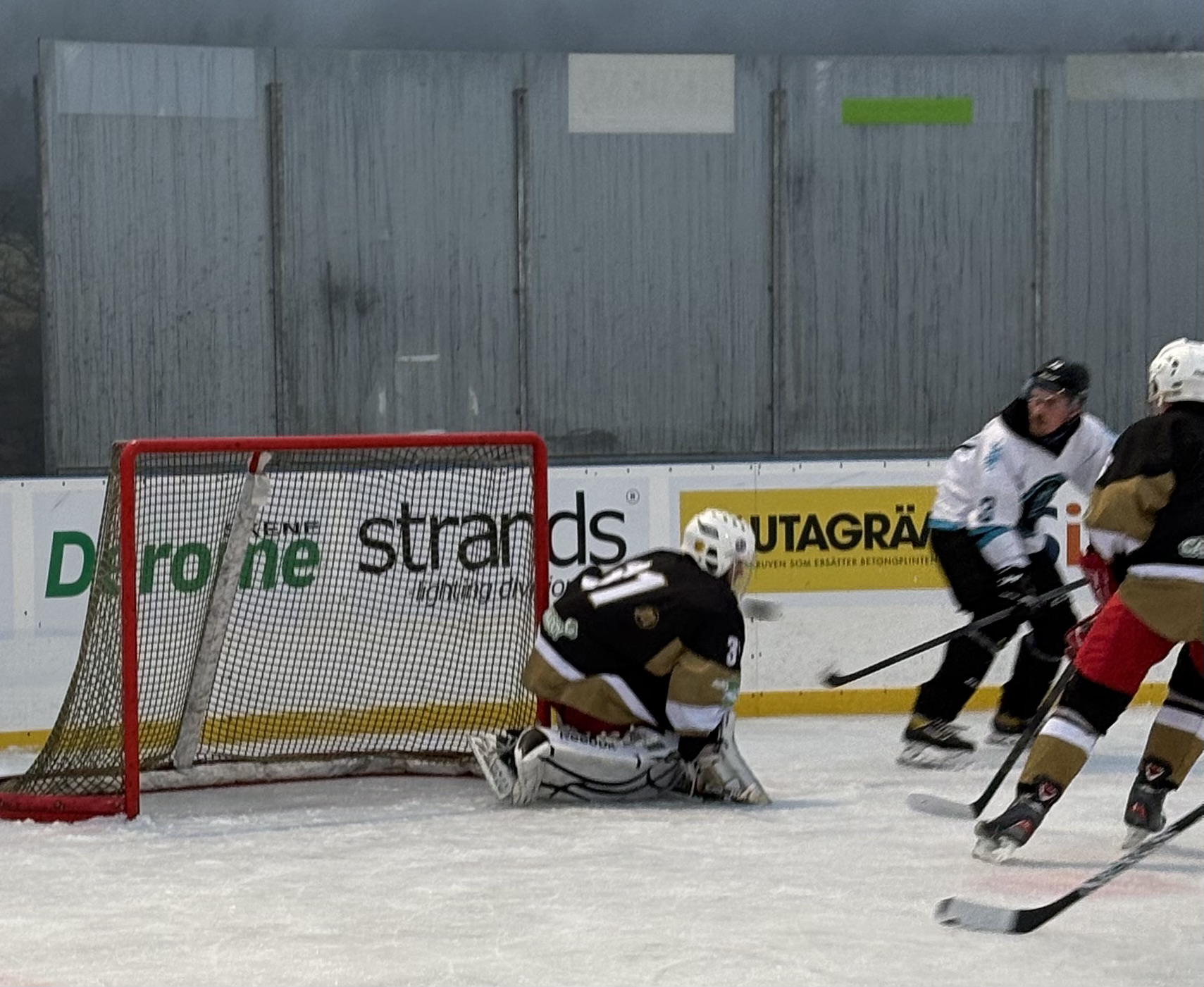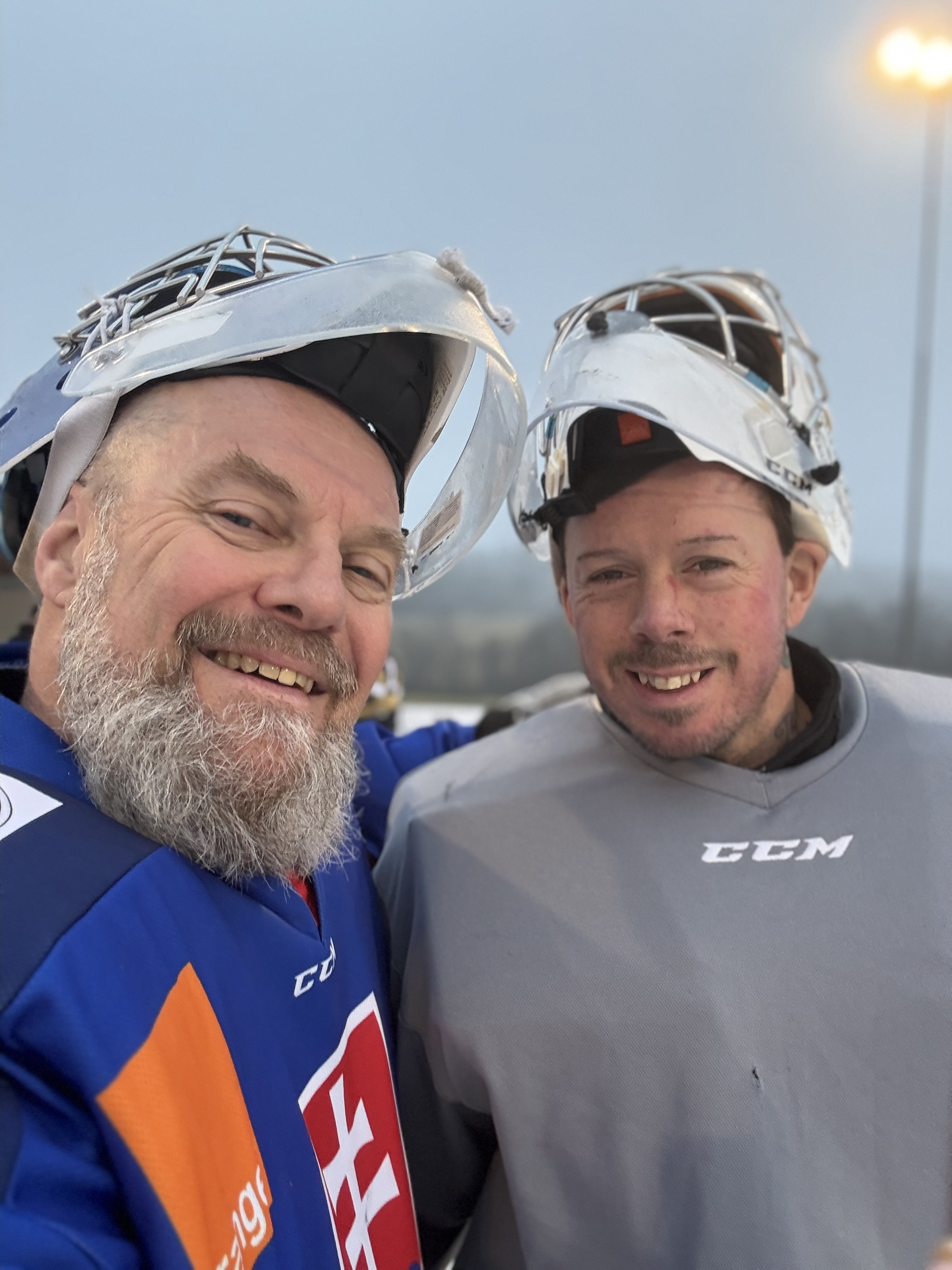 På uppvärmningen innan hade jag fått en rejäl smäll. Jag skulle inte stå. Stod utan min CCM-mask (en sådan jag fann på Gitarrmuseet i Umeå, men som jag av någon korkad anledning slängde vid skilsmässan 2006) bredvid Torbjörn, min kollega. Han håller på att rensa ut puckarna efter att ha blivit uppvärmd, då någon eller några skjuter in puckarna i mål. Han blir förbannad, svingar sin klubba. Den träffar mig snett över höger kind/käke. Jag blir omedelbart bedövad, men tänderna klarar sig. Det juvenila skinnet likaså. Känslobortfallet håller i sig. I veckor.