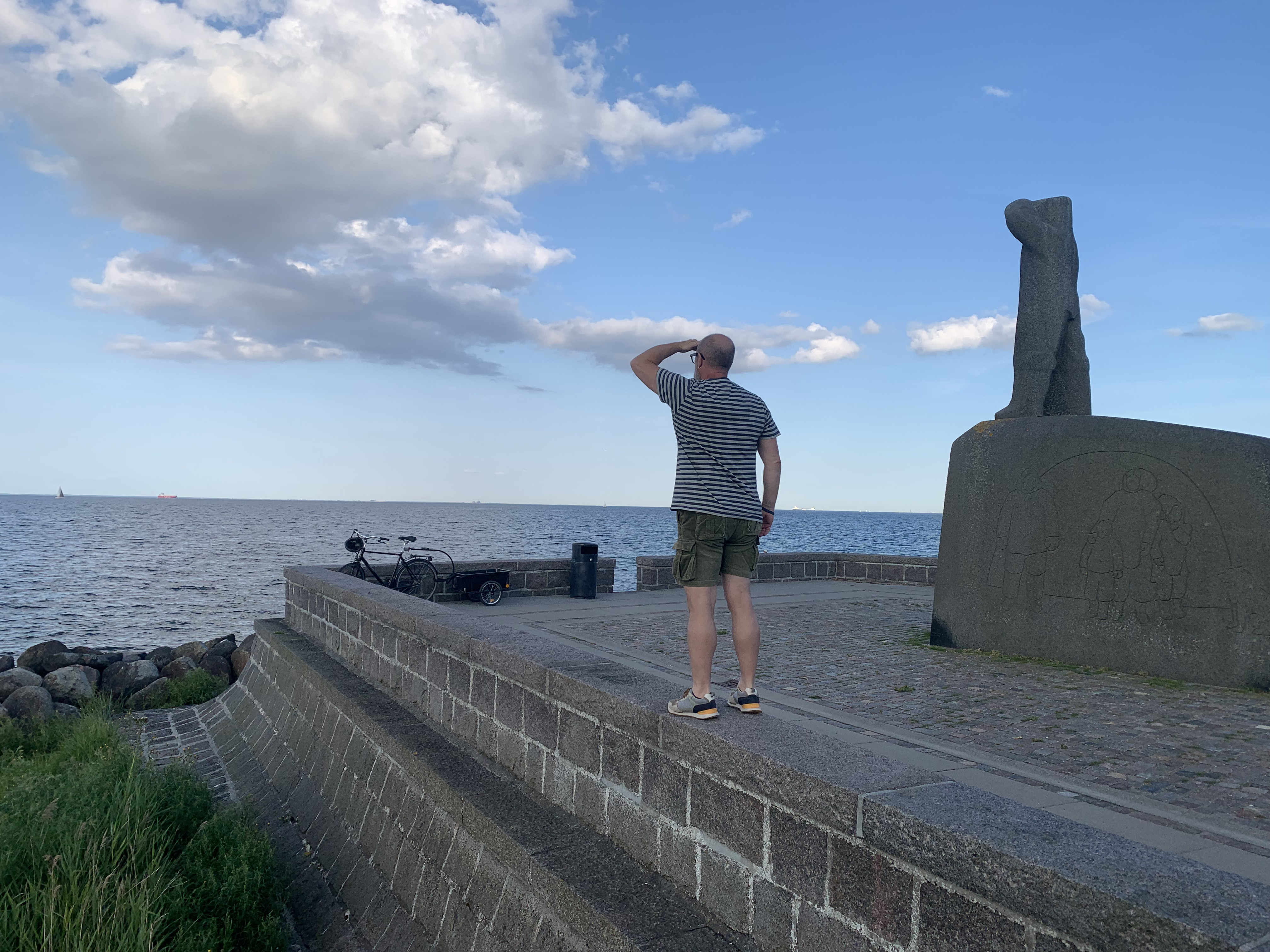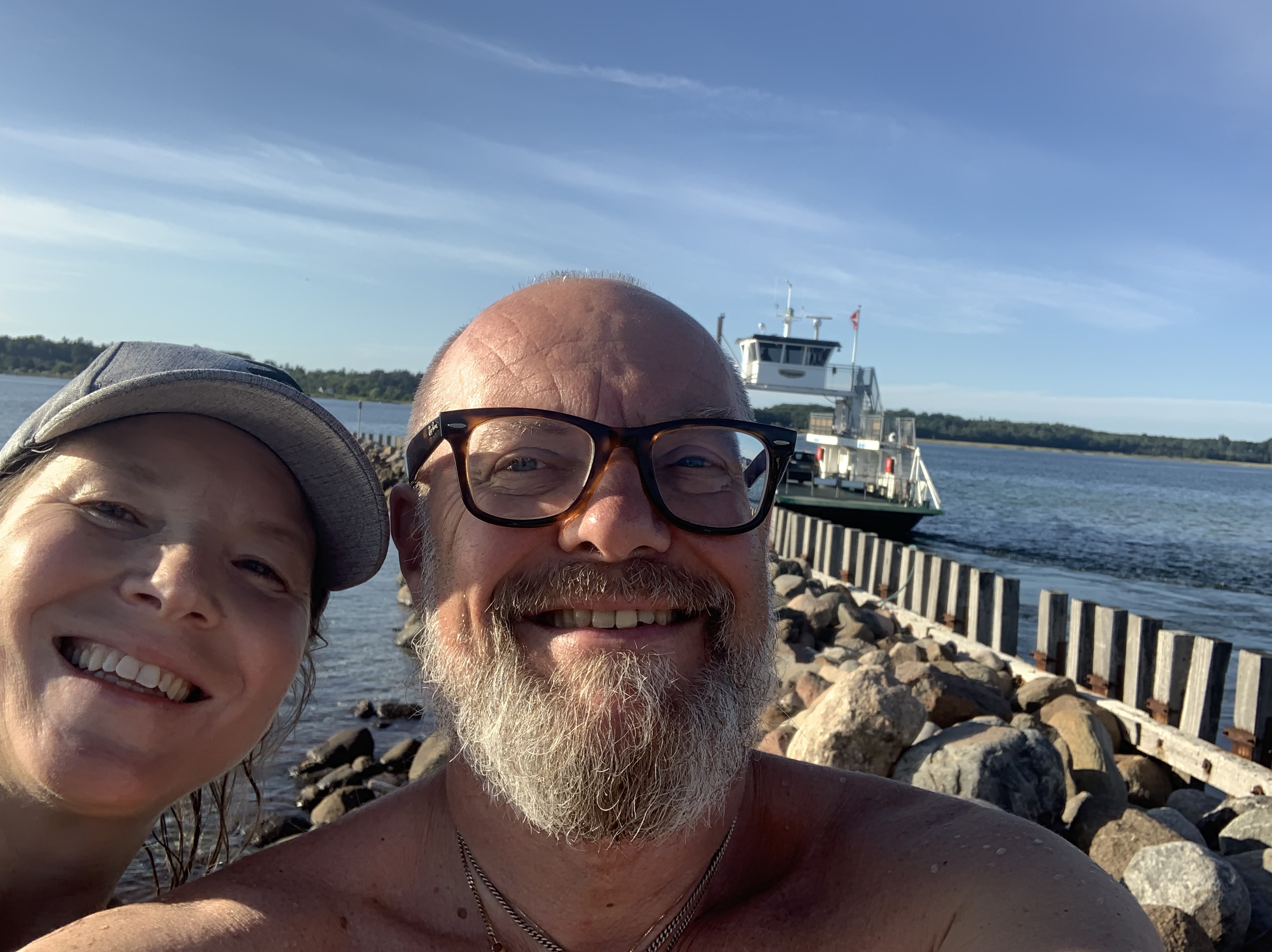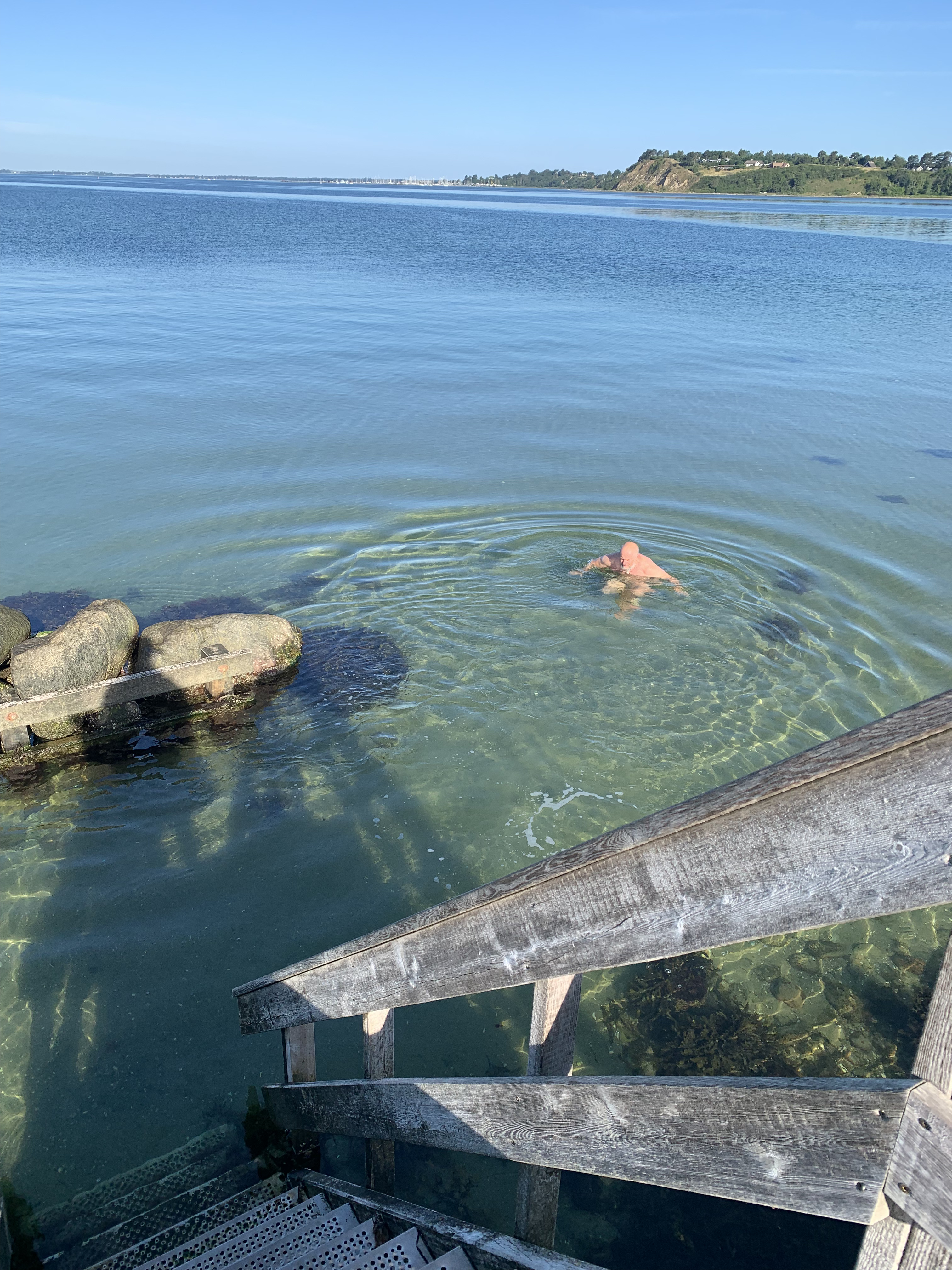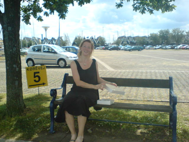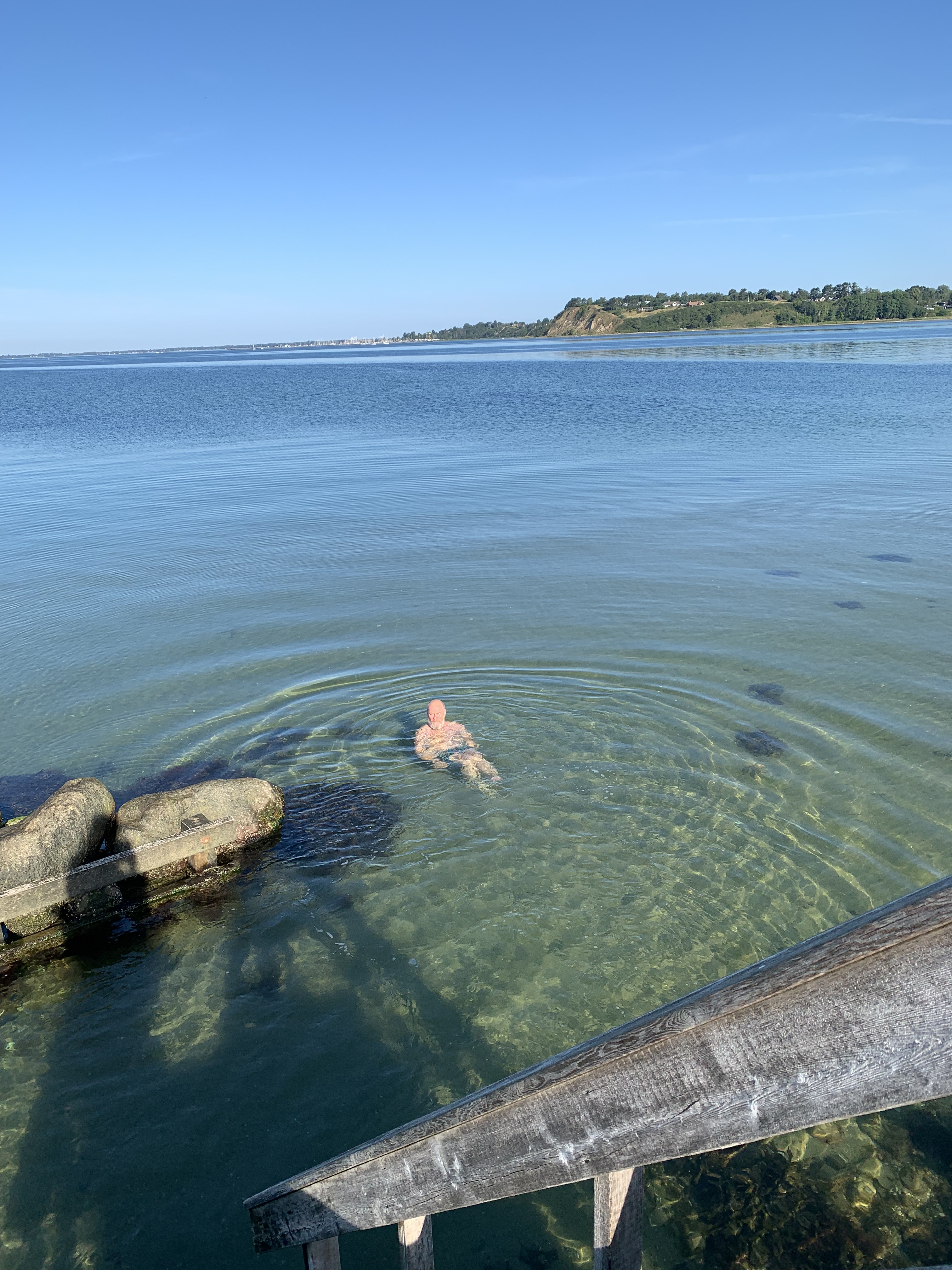 Vi kontaktar T i Bagsværd, för vi har ju bröd långt över vårt behov. Hon får hälften, vi får frysa ned mycket av det vi själva inte kan härbärgera. Så tar vi adjö, åker till tältplatsen för första natten. Plötsligt kommer T på besök med Max, som ska rastas. Vi går ned mot stranden, flitigt frekventerat av utrikesfödda danskar (varför får männen bada iklädda endast shorts och kvinnorna står invirade i sina klädesplagg på stranden och titta på…?). Z och jag passar på att bada. Härligt, friskt och kallt.