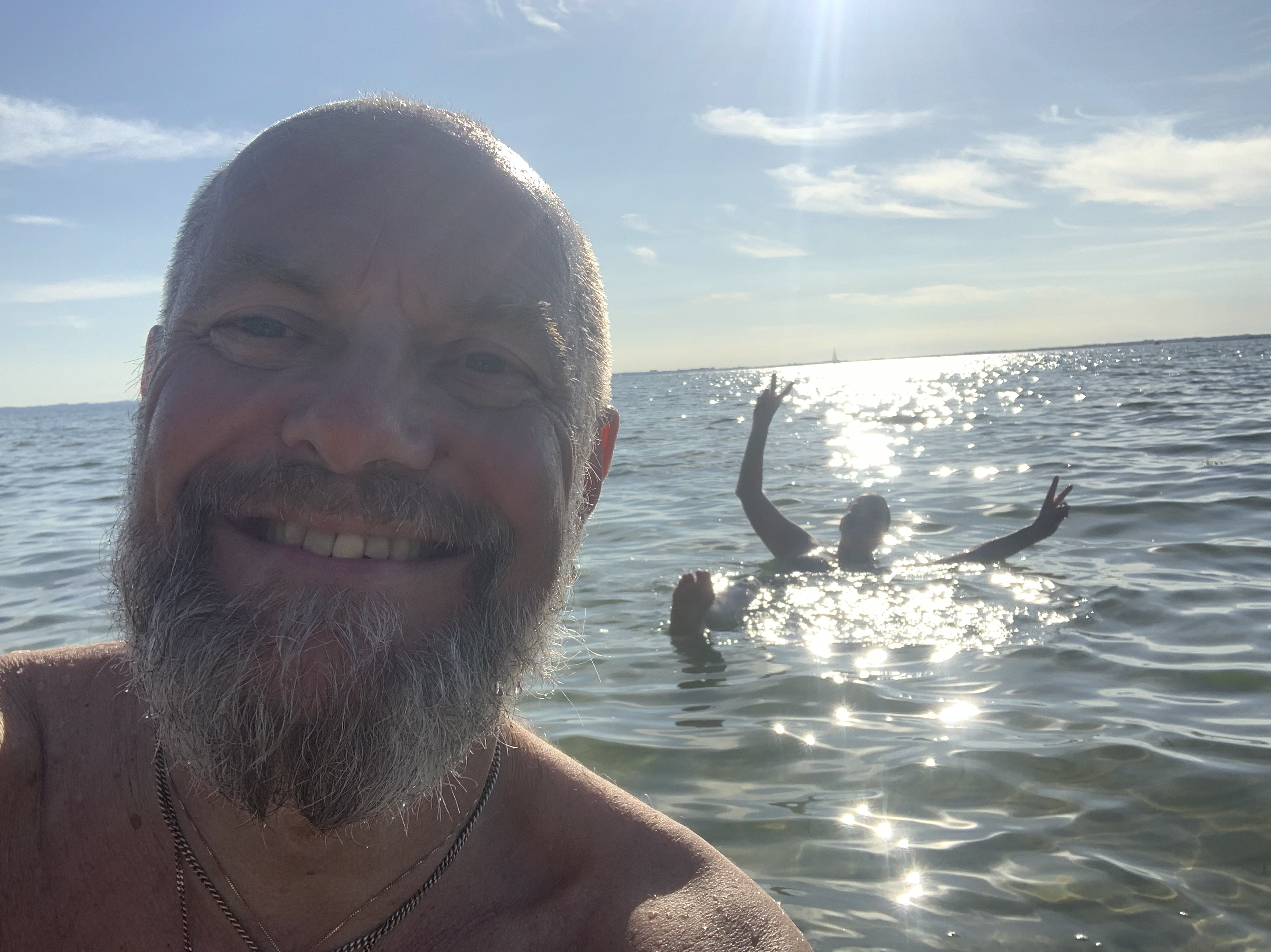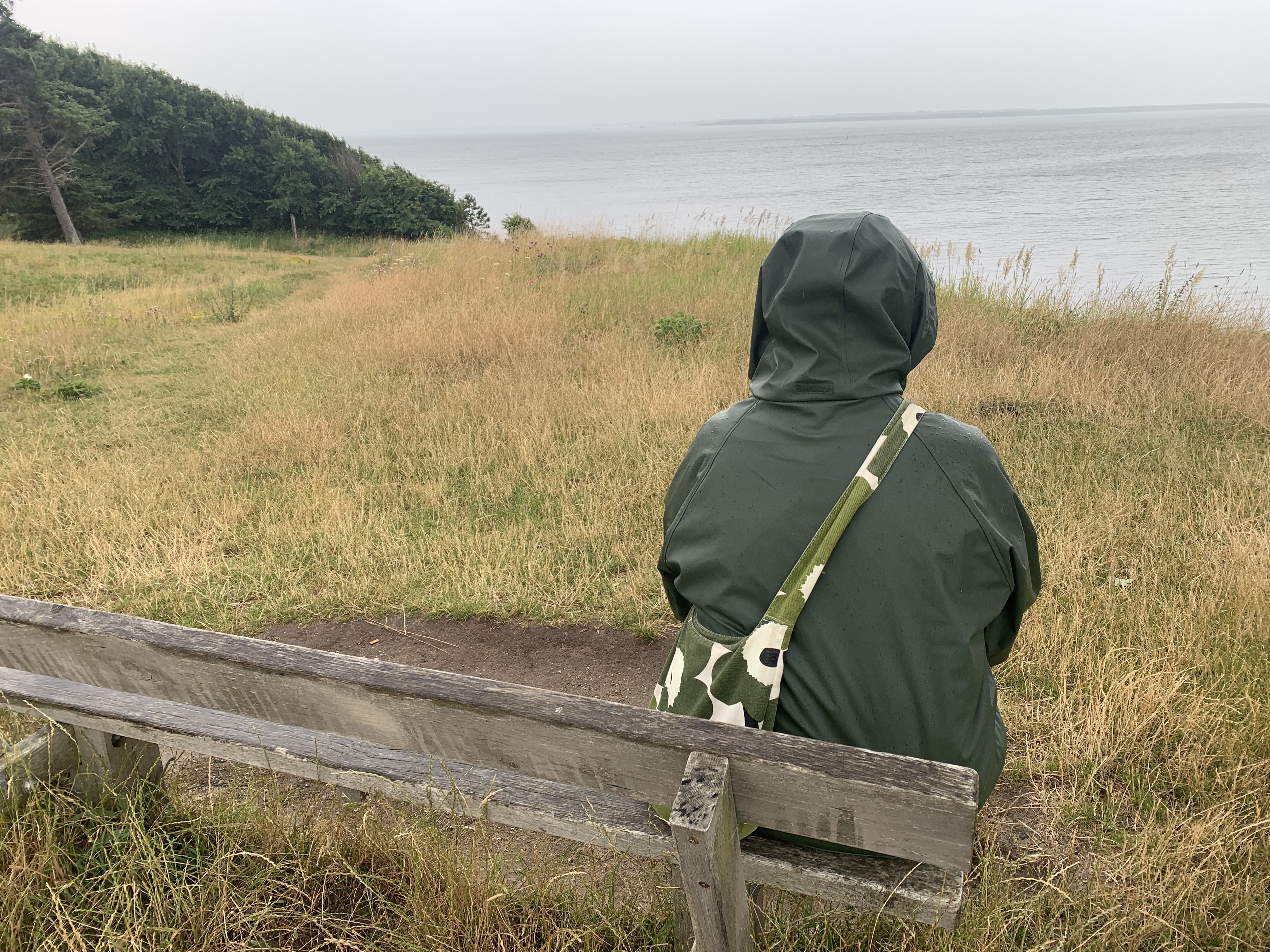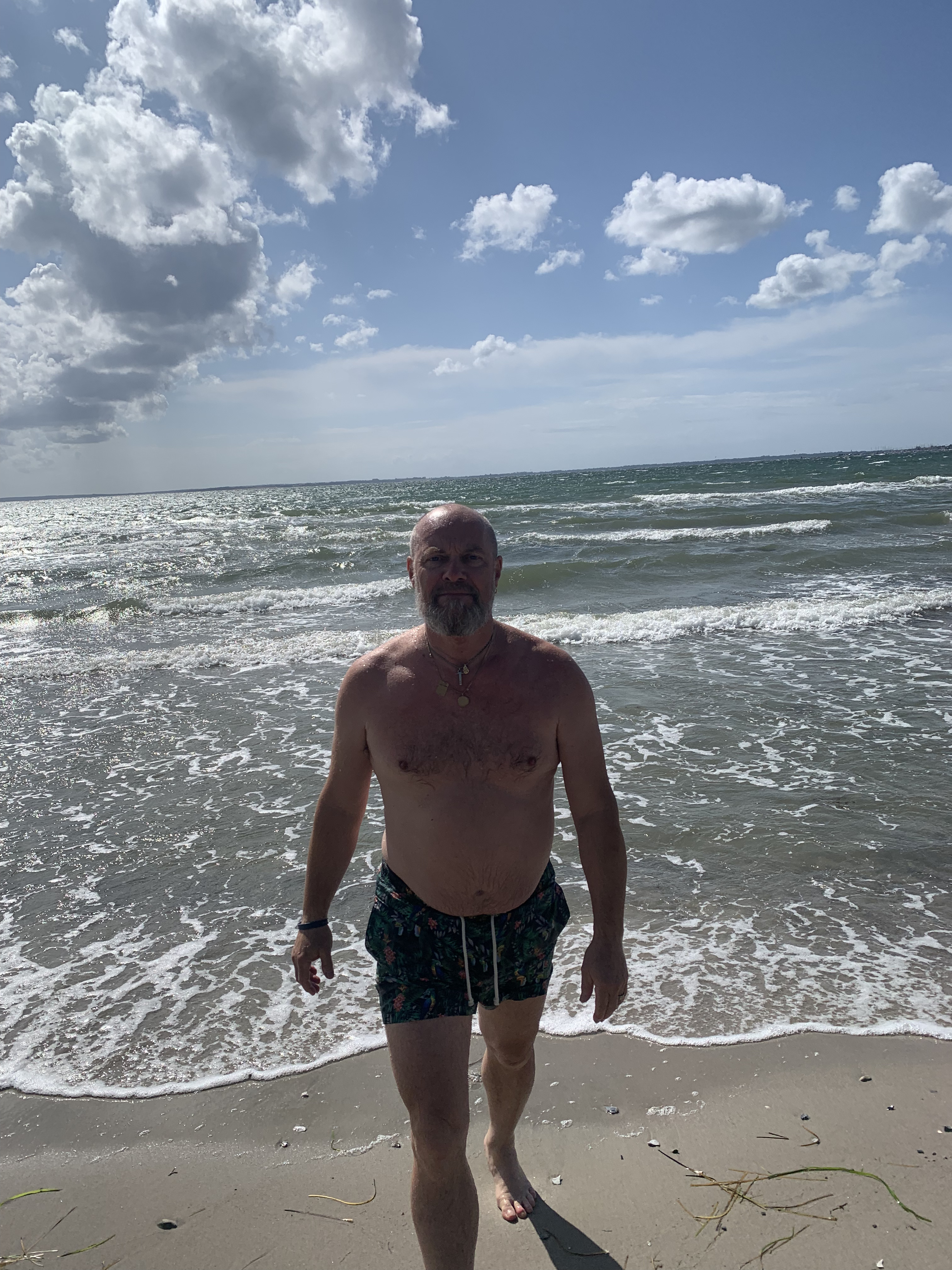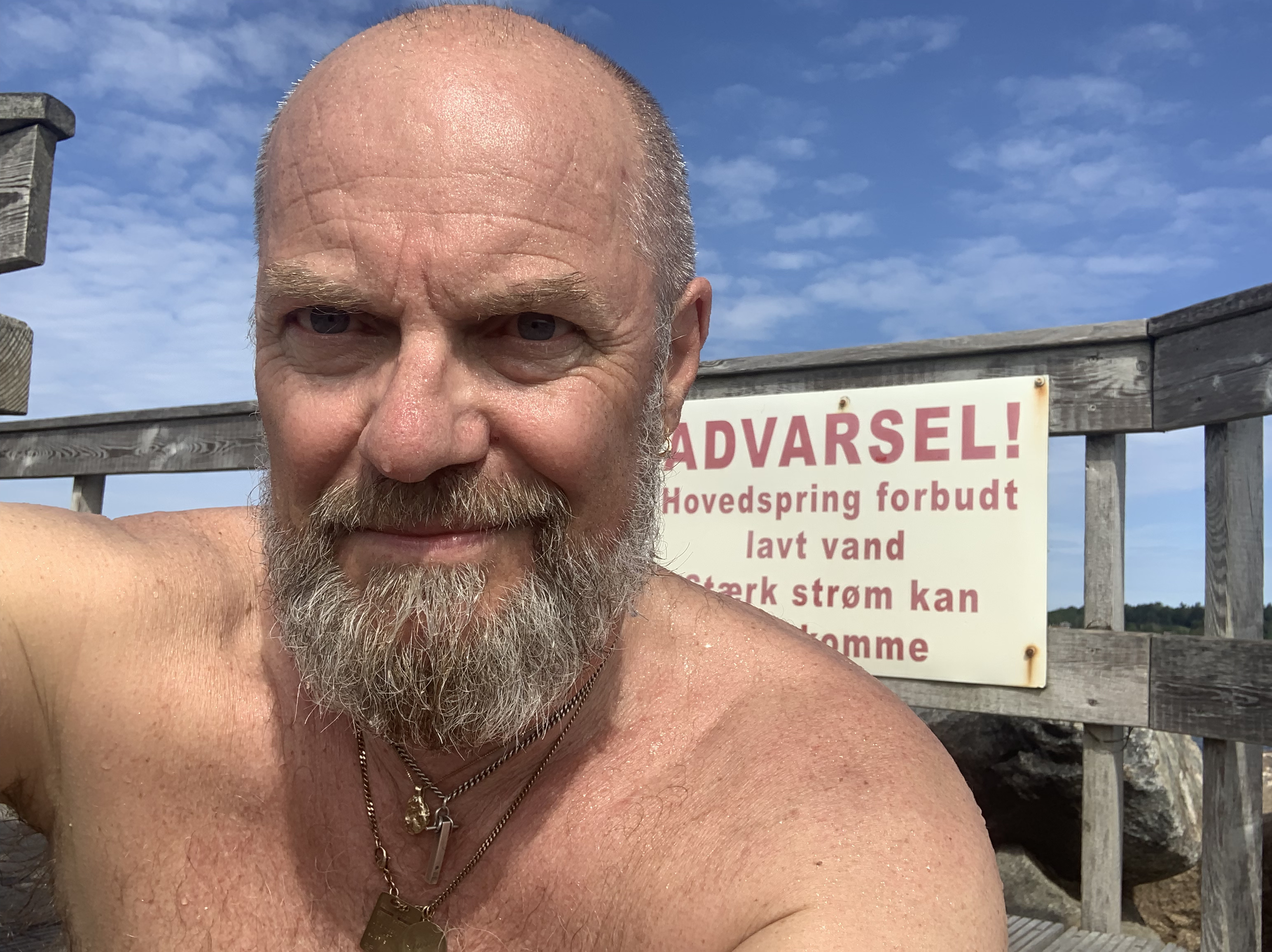 Vi kontaktar T i Bagsværd, för vi har ju bröd långt över vårt behov. Hon får hälften, vi får frysa ned mycket av det vi själva inte kan härbärgera. Så tar vi adjö, åker till tältplatsen för första natten. Plötsligt kommer T på besök med Max, som ska rastas. Vi går ned mot stranden, flitigt frekventerat av utrikesfödda danskar (varför får männen bada iklädda endast shorts och kvinnorna står invirade i sina klädesplagg på stranden och titta på…?). Z och jag passar på att bada. Härligt, friskt och kallt.