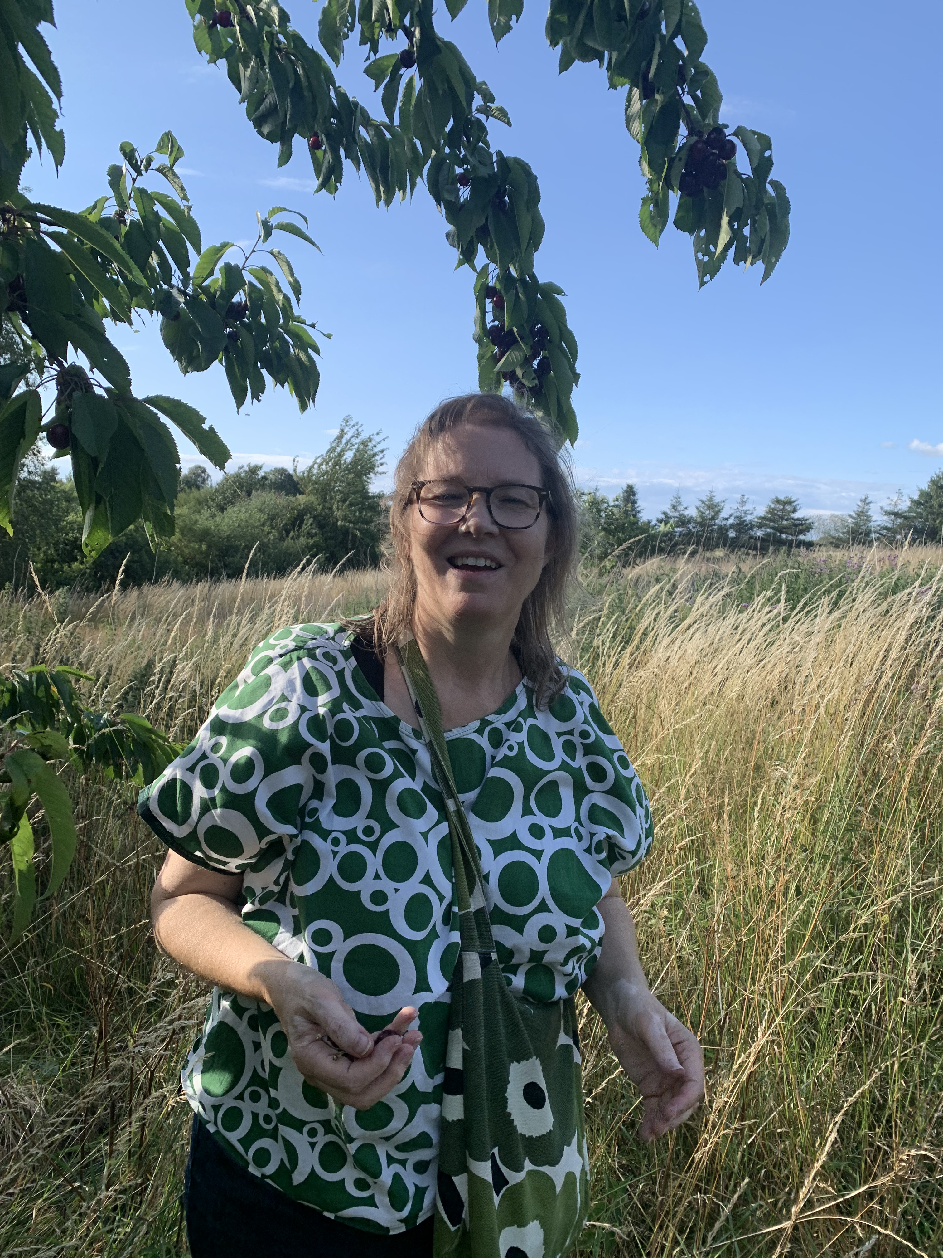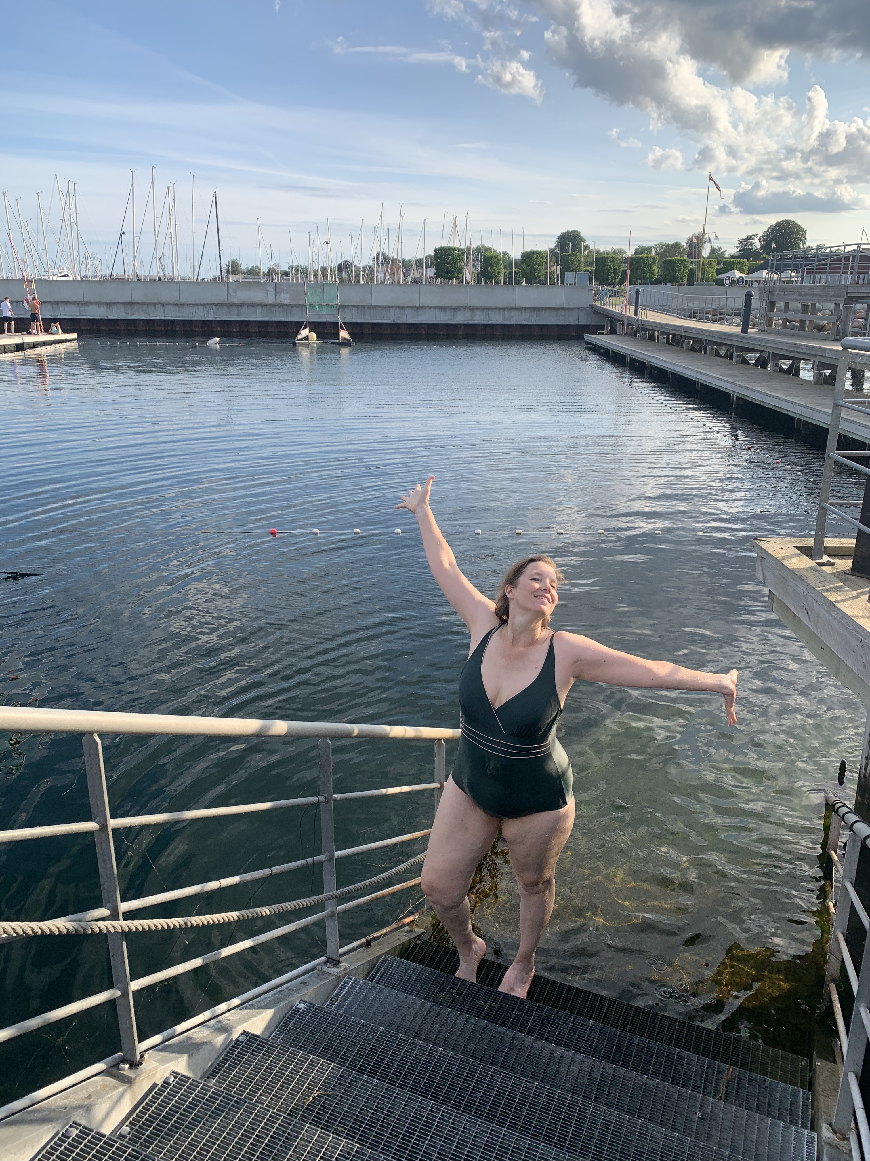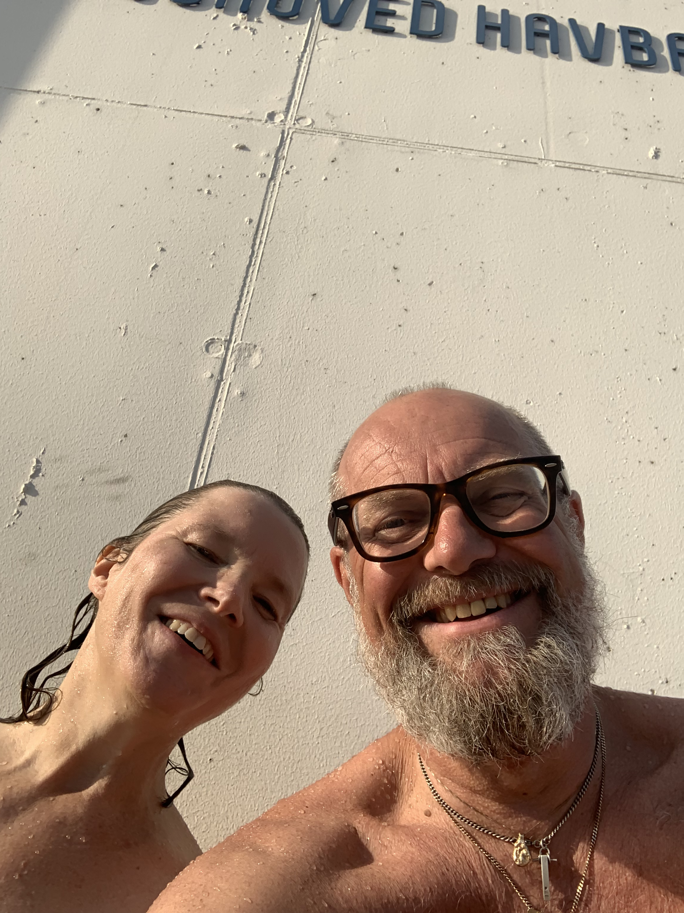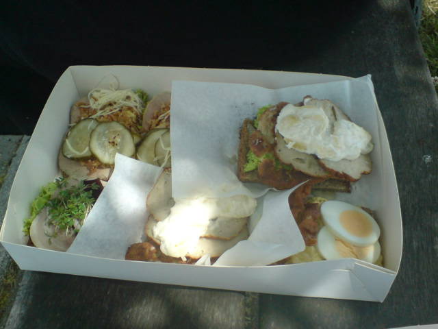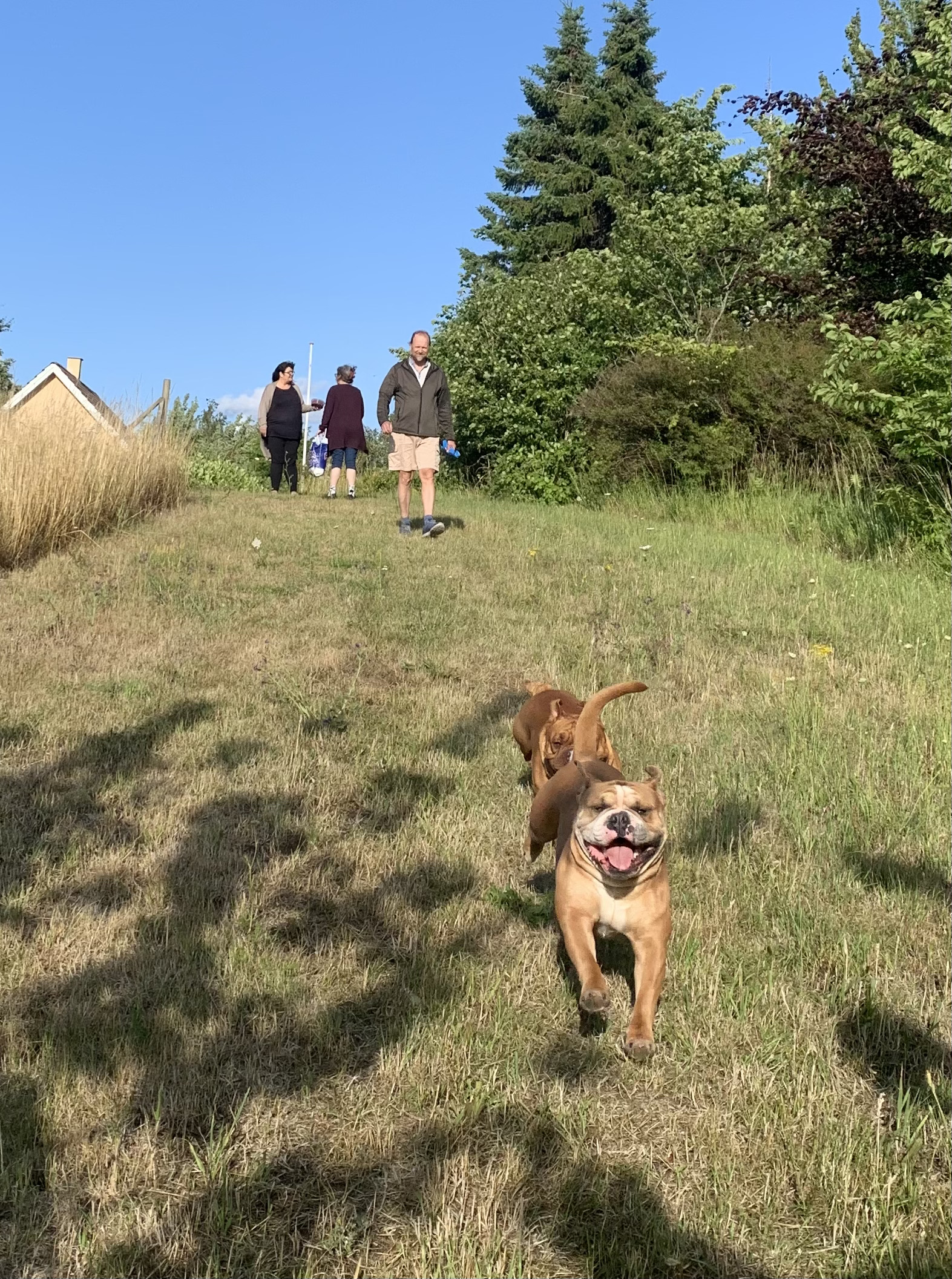 Vi kontaktar T i Bagsværd, för vi har ju bröd långt över vårt behov. Hon får hälften, vi får frysa ned mycket av det vi själva inte kan härbärgera. Så tar vi adjö, åker till tältplatsen för första natten. Plötsligt kommer T på besök med Max, som ska rastas. Vi går ned mot stranden, flitigt frekventerat av utrikesfödda danskar (varför får männen bada iklädda endast shorts och kvinnorna står invirade i sina klädesplagg på stranden och titta på…?). Z och jag passar på att bada. Härligt, friskt och kallt.