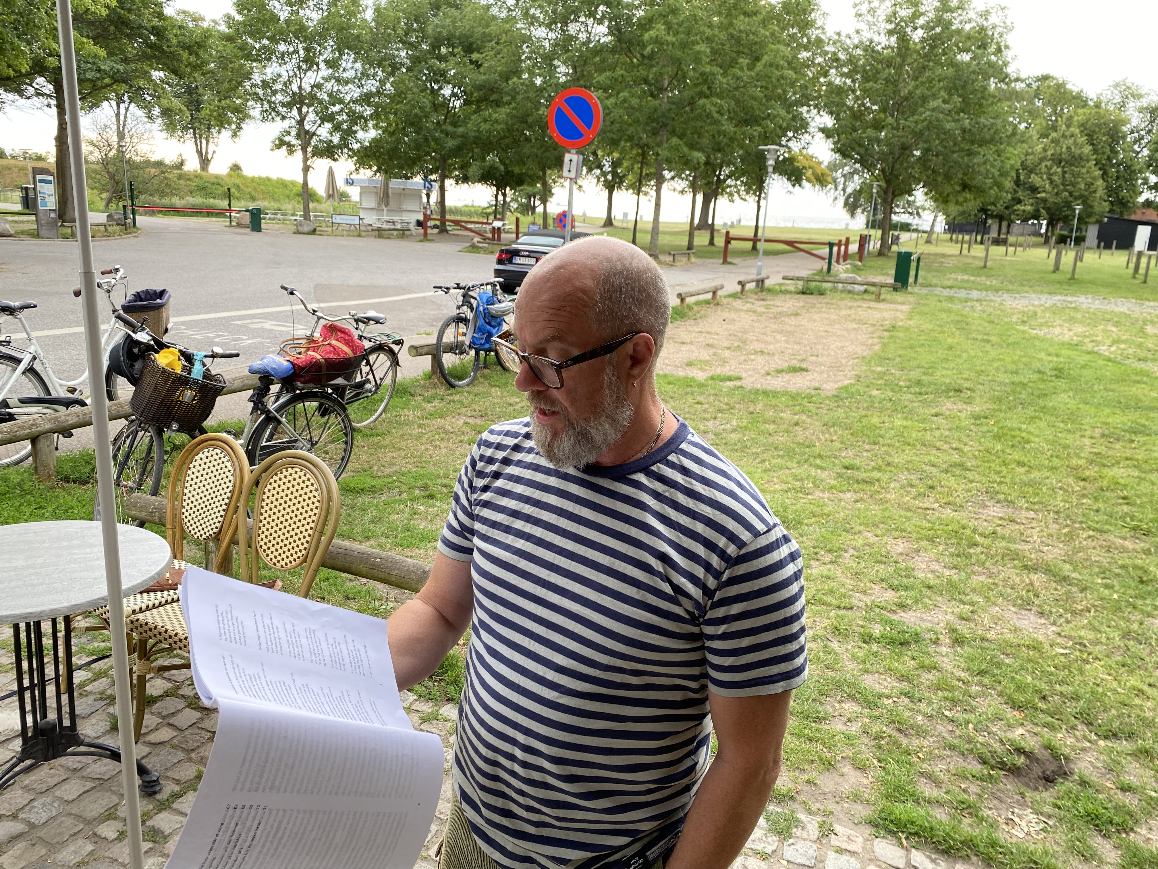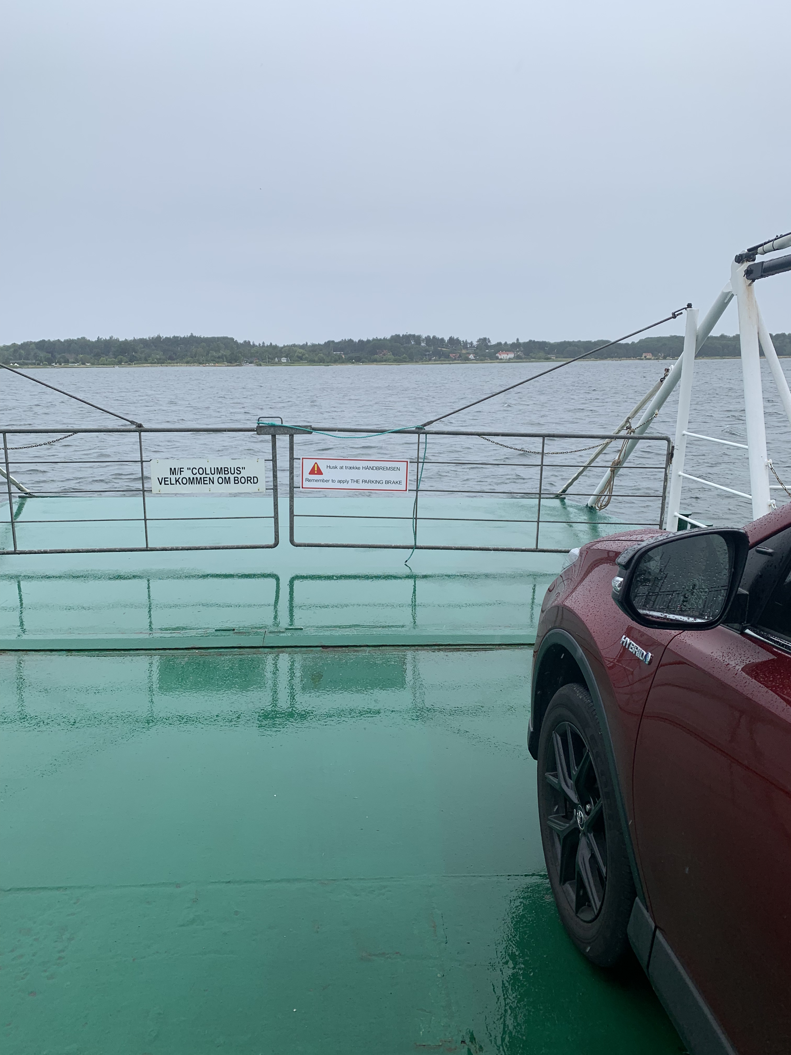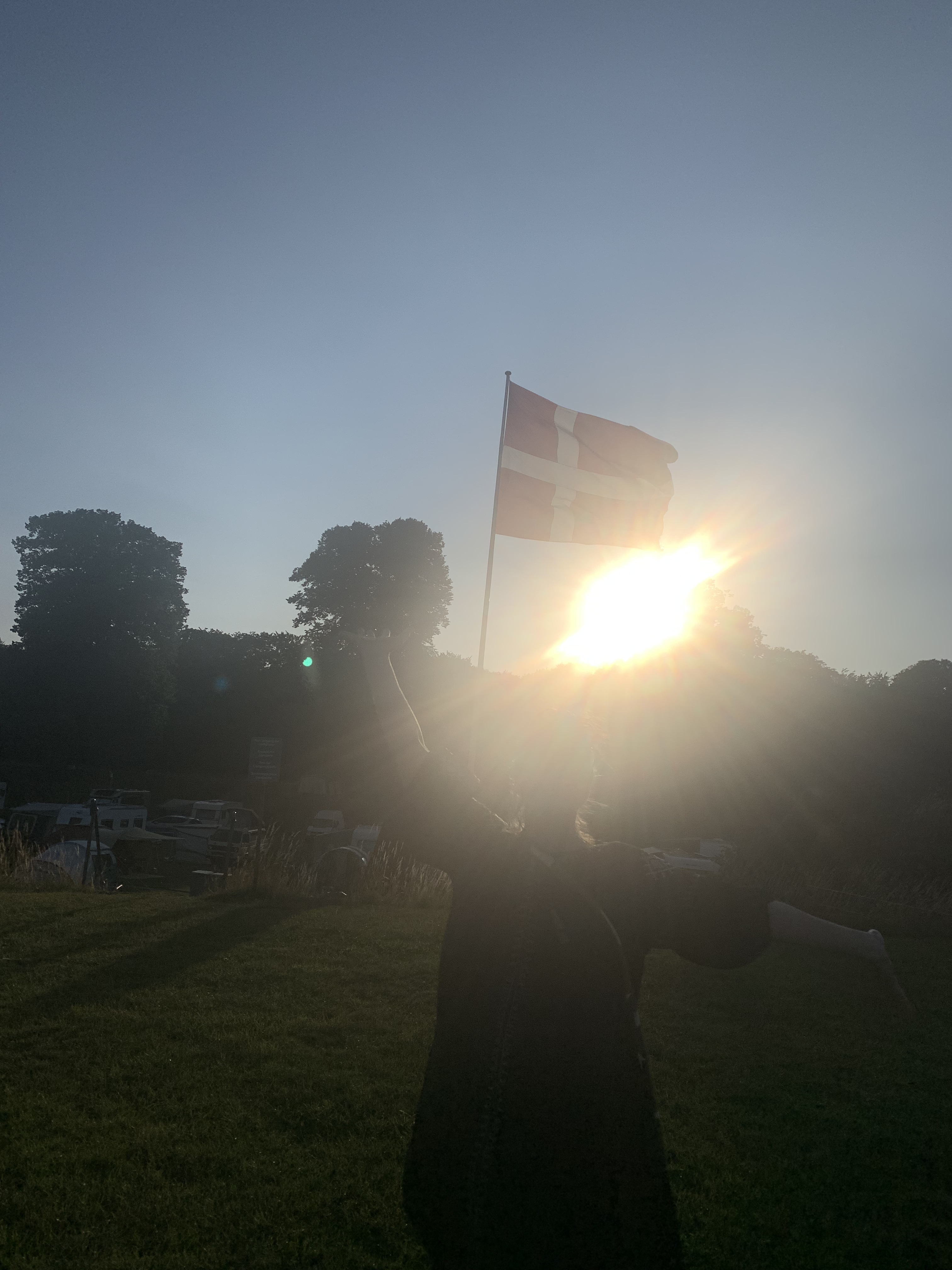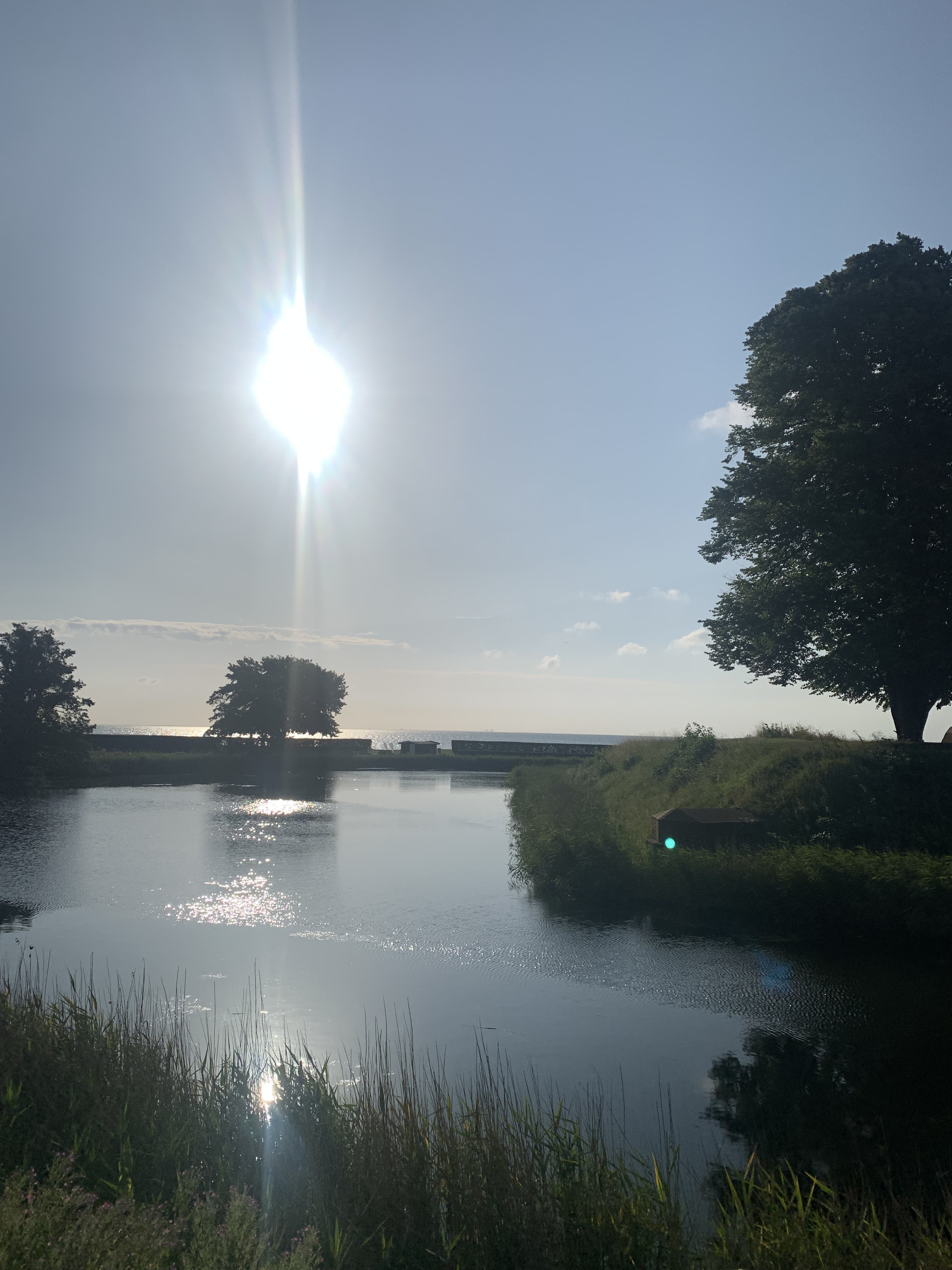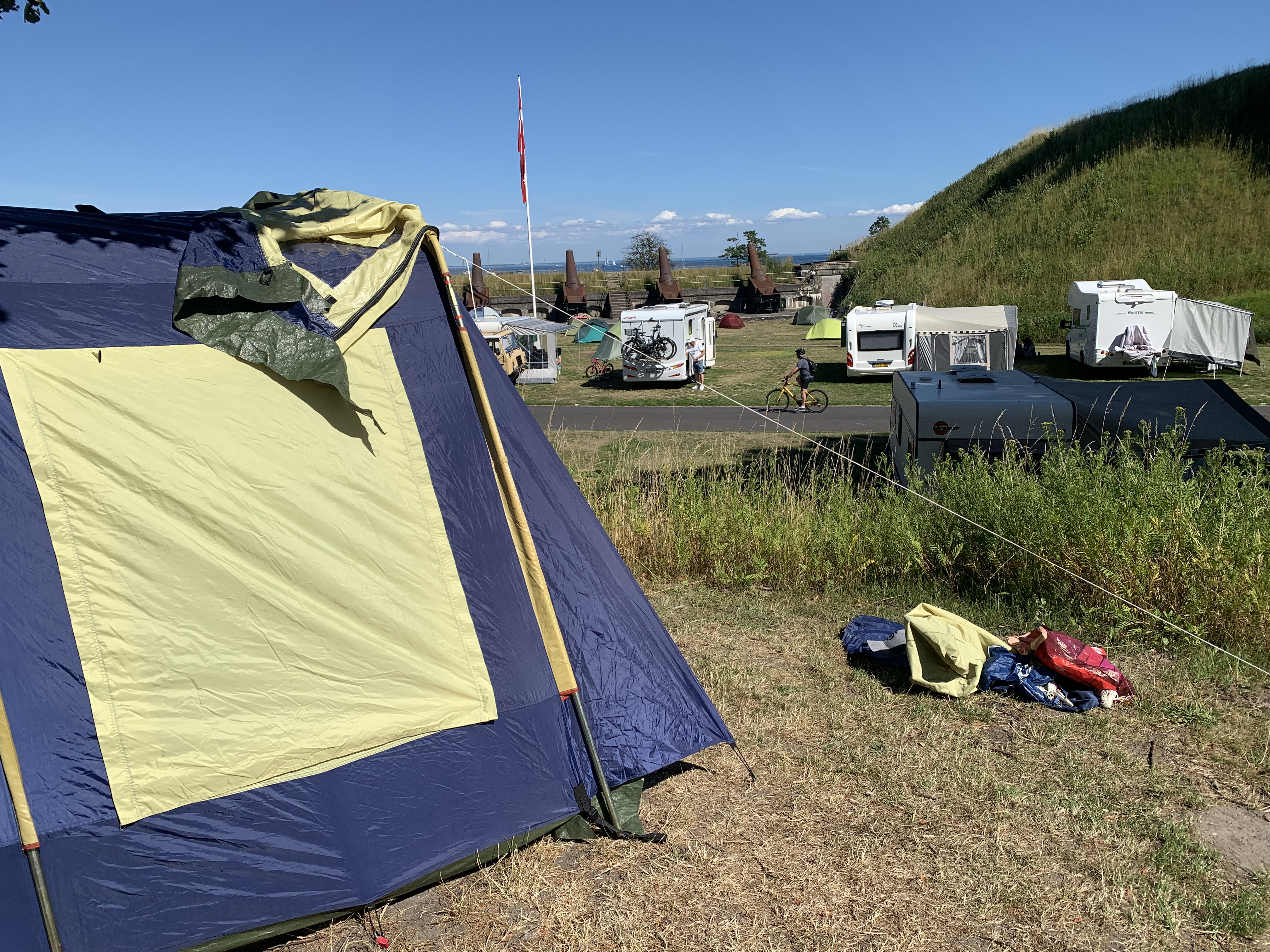 Vi checkar in, åker in genom bommarna och tar oss fram till vår plats. Lastar ut. Vädret är med oss och Z reser med van hand sitt ståtliga tält, som rymmer tre rum, men inget kök. Det blir en sovalkov, en walk in closet och ett vardagsrum med dagbädd och två stolar samt ett kylskåp, det vill säga en kylbox som går på den el som är framdragen från en stolpe nedanför fästningsvallen. Vi har utsikt över inte bara campingområdet med sina husvagnar, husbilar och tält i olika storlek och ordning, utan också utsikt över Øresund.