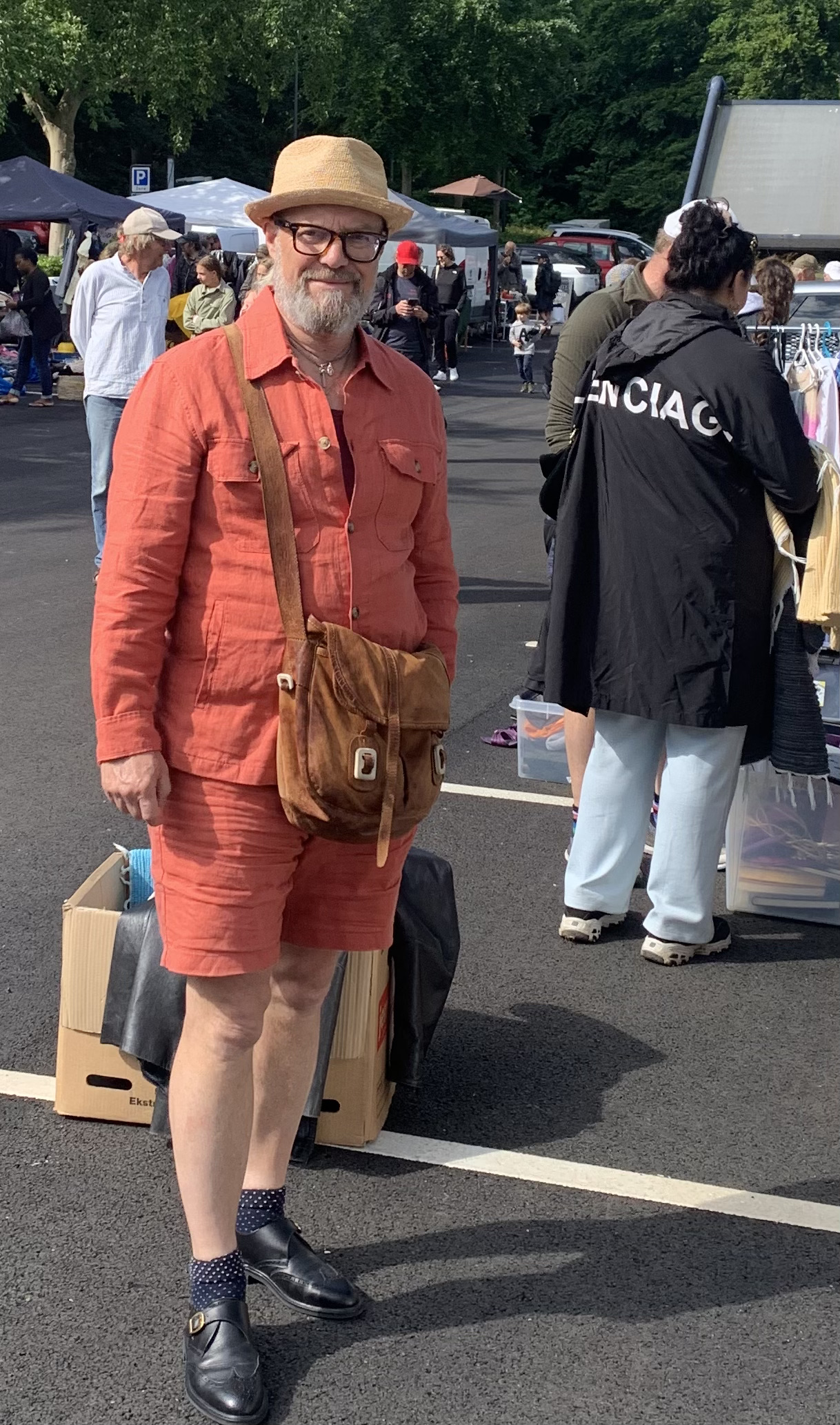 Z hittar en skjorta som hon vill köpa till mig, men jag är tveksam. Dels är behovet inte så stort. Dels kostar den 10 euro utan prutmån. Vi går vidare utan att fastna för något. Så går vi längre in, eller ut, hittar en skoförsäljare där det sannerligen är rusch. Jag spanar in ett par gröna mockaloafers, men orkar inte riktigt ge mig in i högen av potentiella köpare. Men där är ju ett par röda, säger Z och pekar mot högen. Jag nyper dem. Mäter skosulan mot mina sneakers och är övertygad om att de passar. 25 euro åter utan prutmån för ett par illröda OnFoot i mocka, ett spanskt märke som normalt tingar ett väsentligt högre pris. Ny påse att bära. Z hittar spännande knappar som hon köper. Vi går trappan upp för fler stånd och butiker, in och ut ur dem, kikar på mat som serveras utan att riktigt nappa. hittar kläder som inte landar rätt. Men plötsligt hänger ett par snygga gröna manchestershorts framför ögonen. Jag provar dem. Konstaterar att de möjligen sitter tajt, men priset är hanterbart, precis som för den intillhängande kortärmade tröjan i frotté. Där finns också ett bar beige byxor i stretch med intressant mönster. Z prutar till 50 euro, men vi hamnar på kompromissen 55 euro. Nya kassar att bära som blir fler då Z köper några längder tyg. Så går vi åter ned. Z köper den där skjortan till mig och en exklusiv ask med slips, matchande snusnäsduk, manschettknappar och slipsnål. Märket är okänt för mig, Fly Fish, och svårgooglat.Men den brandgula färgen i mönstret lockar, även om det senare visar sig vara polyester och inte siden som de andra liknande askarna från Boss och Paul Smith, som jag har hemma. Men. Totalt 15 euro. Vi är överlastade, men nöjda och lite loppisrusiga när vi går därifrån och tar sikte mot Torre Glòries, för vi ska till toppen.