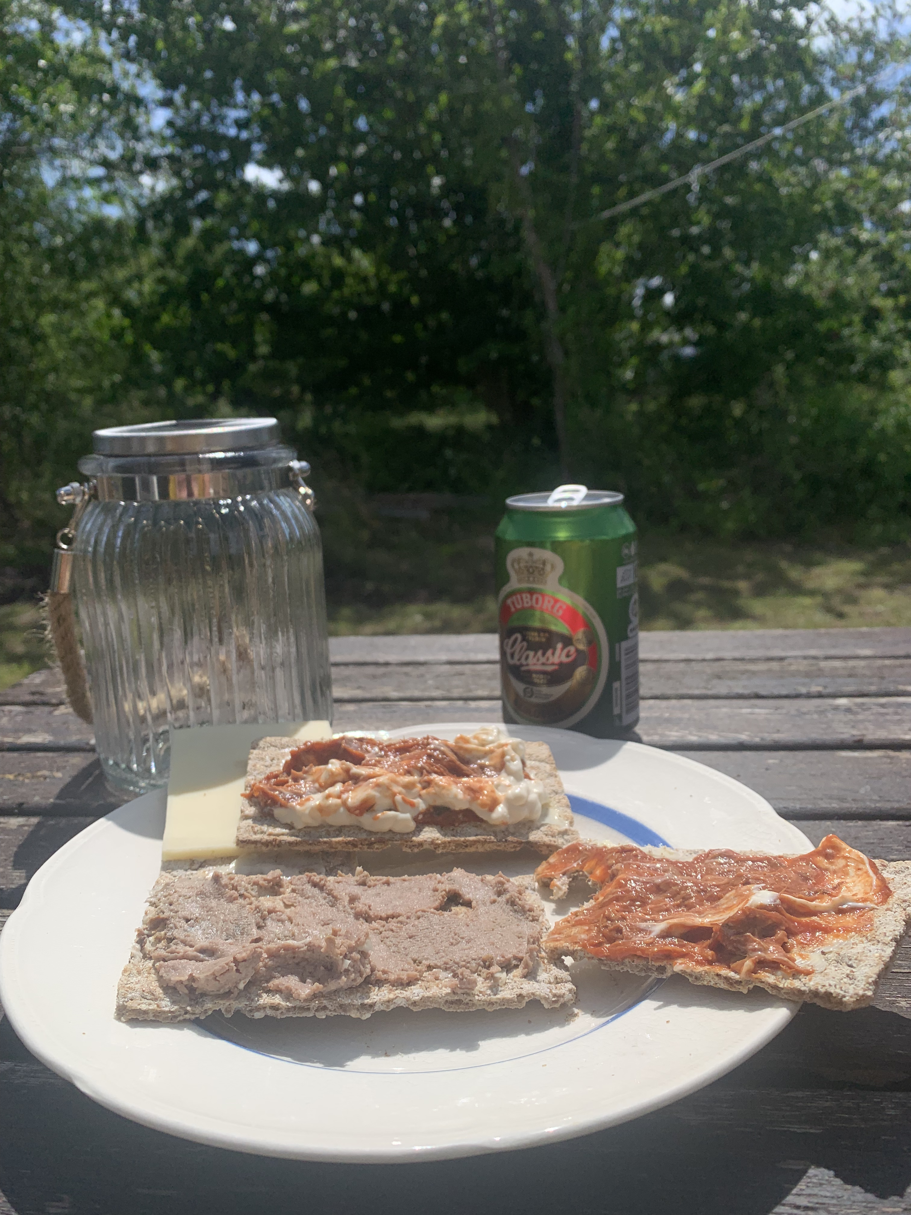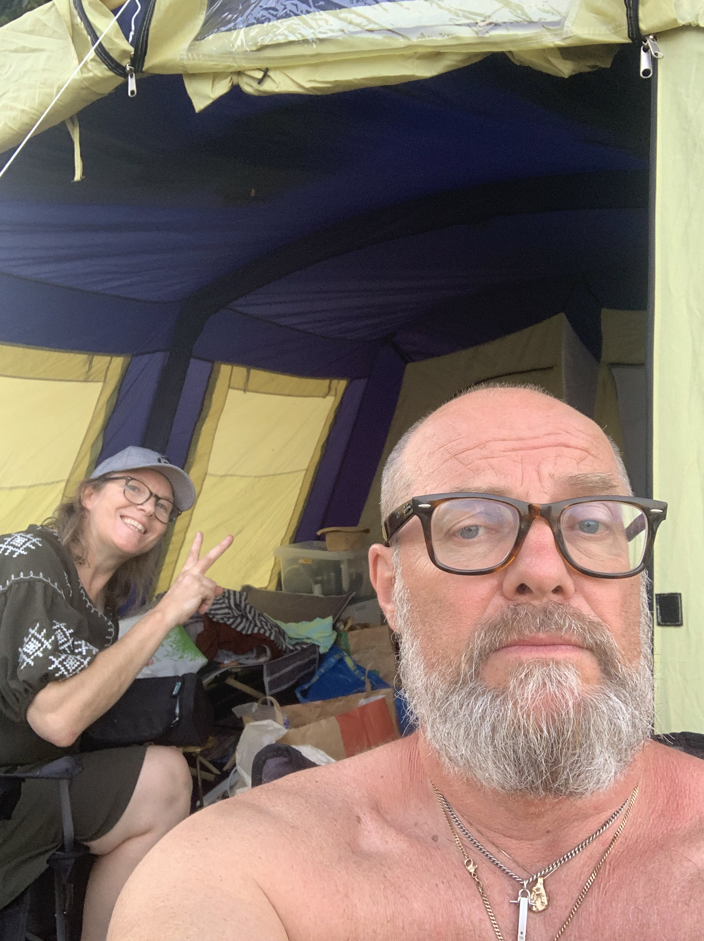 När tältet är rest och uppkopplat tvekar kylboxen. Är den för gammal, eller är i sin tur dess adapter trasig…? Det visar sig också att vi har fått sällskap. Trots mina år på Expressen har jag aldrig varit särskilt förtjust i getingar. Nu finns de irriterande insekterna överallt surrande. Jag blir grinig. Ska jag bo med giftiga insekter under min camping…? Nej tack.