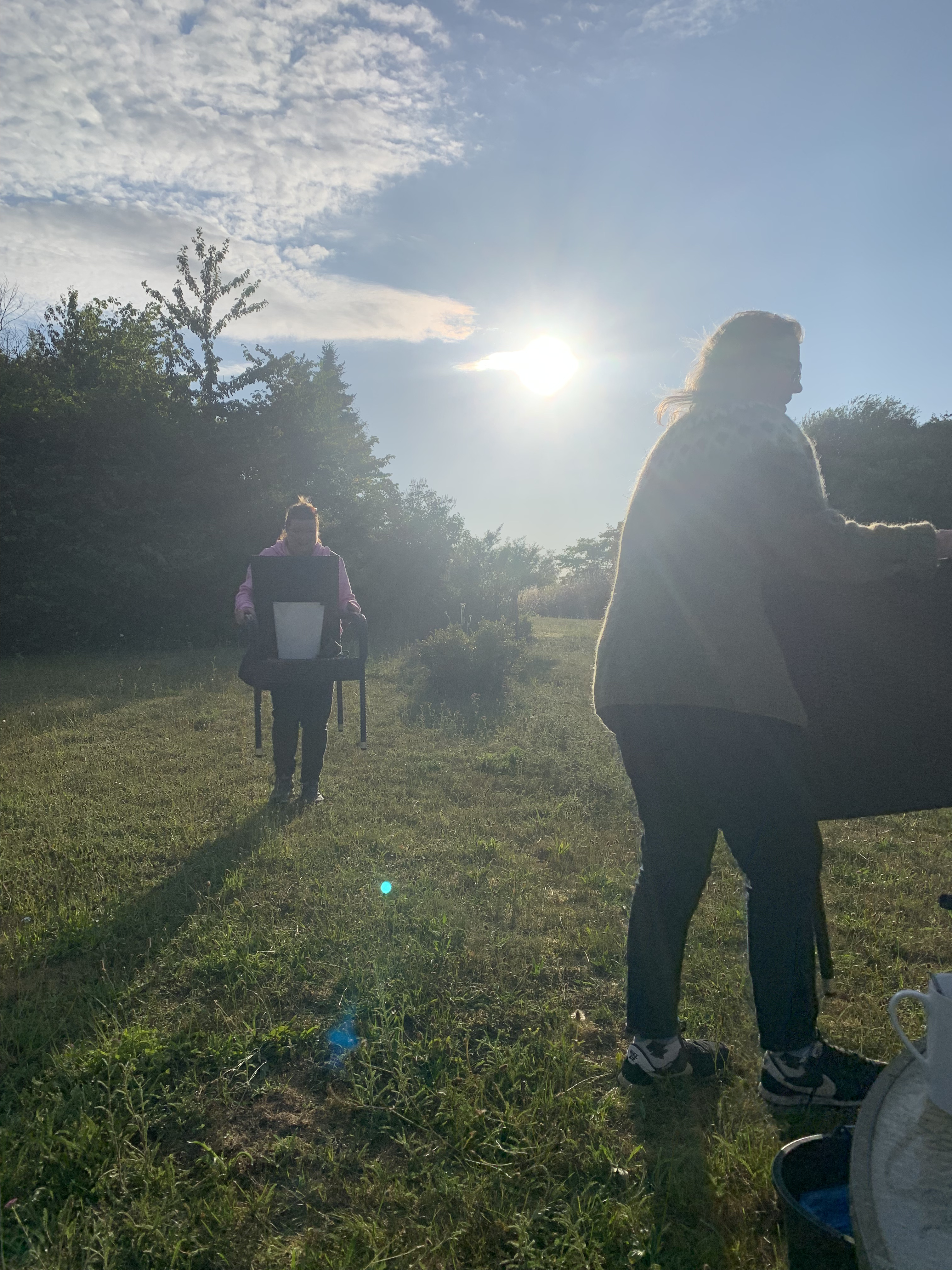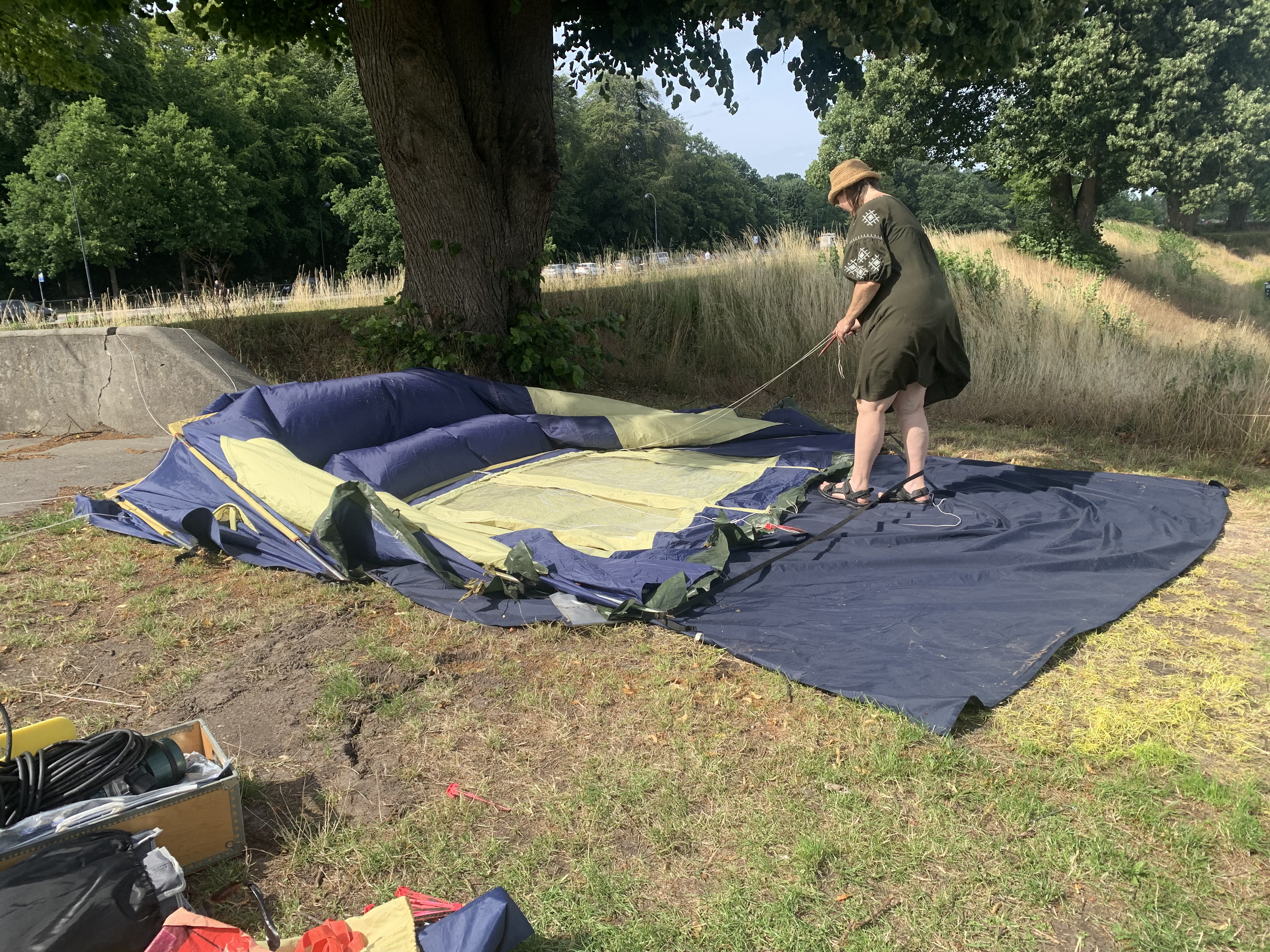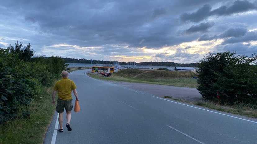 Kvällen mörknar på, T och Max lämnar och vi gör oss redo för första natten. Madrassen är bristfälligt uppumpad, men vi är trötta. Jag lägger mig först medan Z tar farväl av T och Max. Vi har pratat om att ligga med huvudet västerut, jag somnar åt ”fel” håll. På morgonen hittar jag Z skavfötters och nedhalkad i ena hörnet, som en ostbåge. Obekvämt. Platsen vi valt för tältet är ojämnt. Framför allt där madrassen placerats. Det är något vi måste åtgärda denna vår andra dag i campingen.