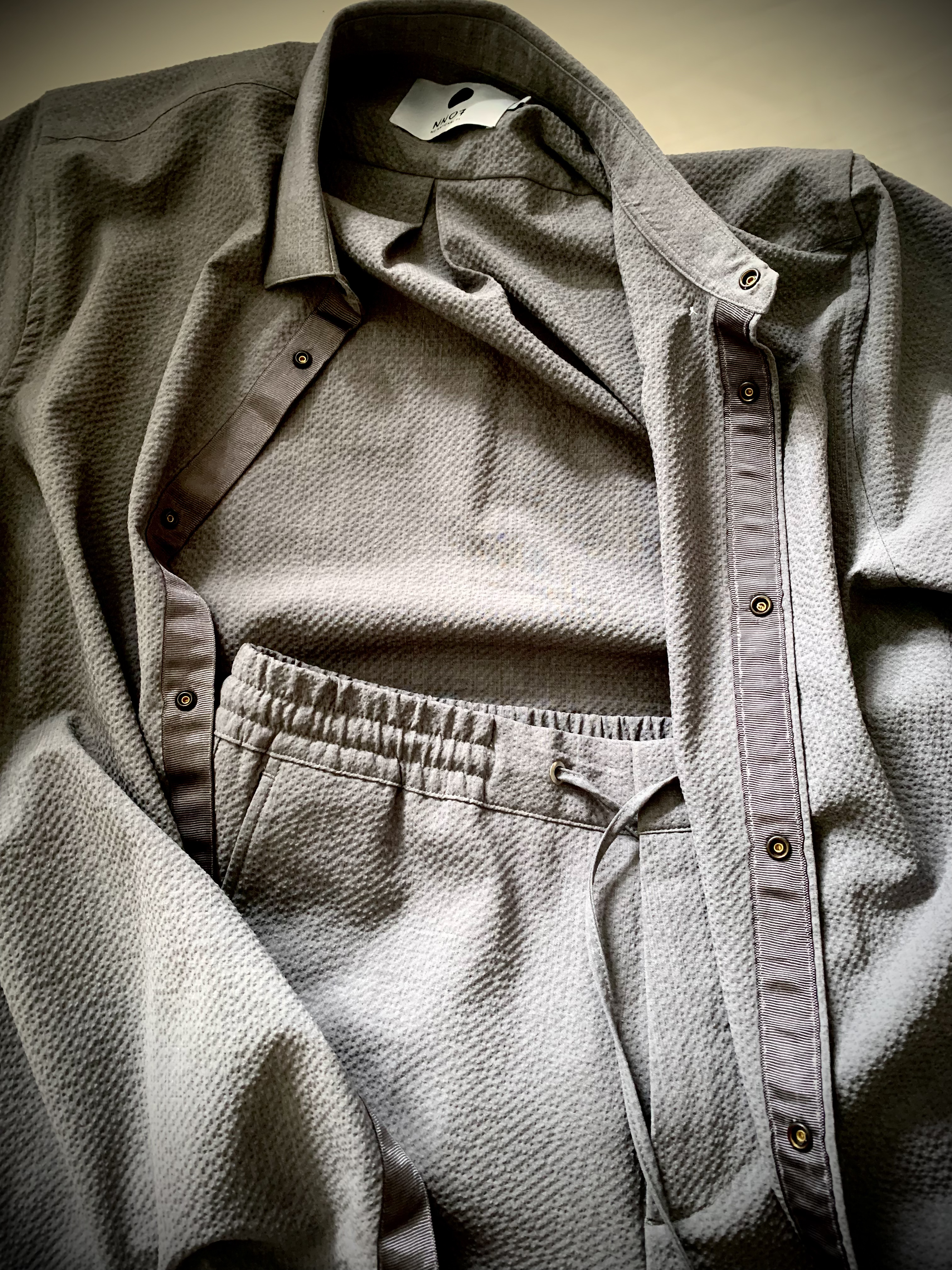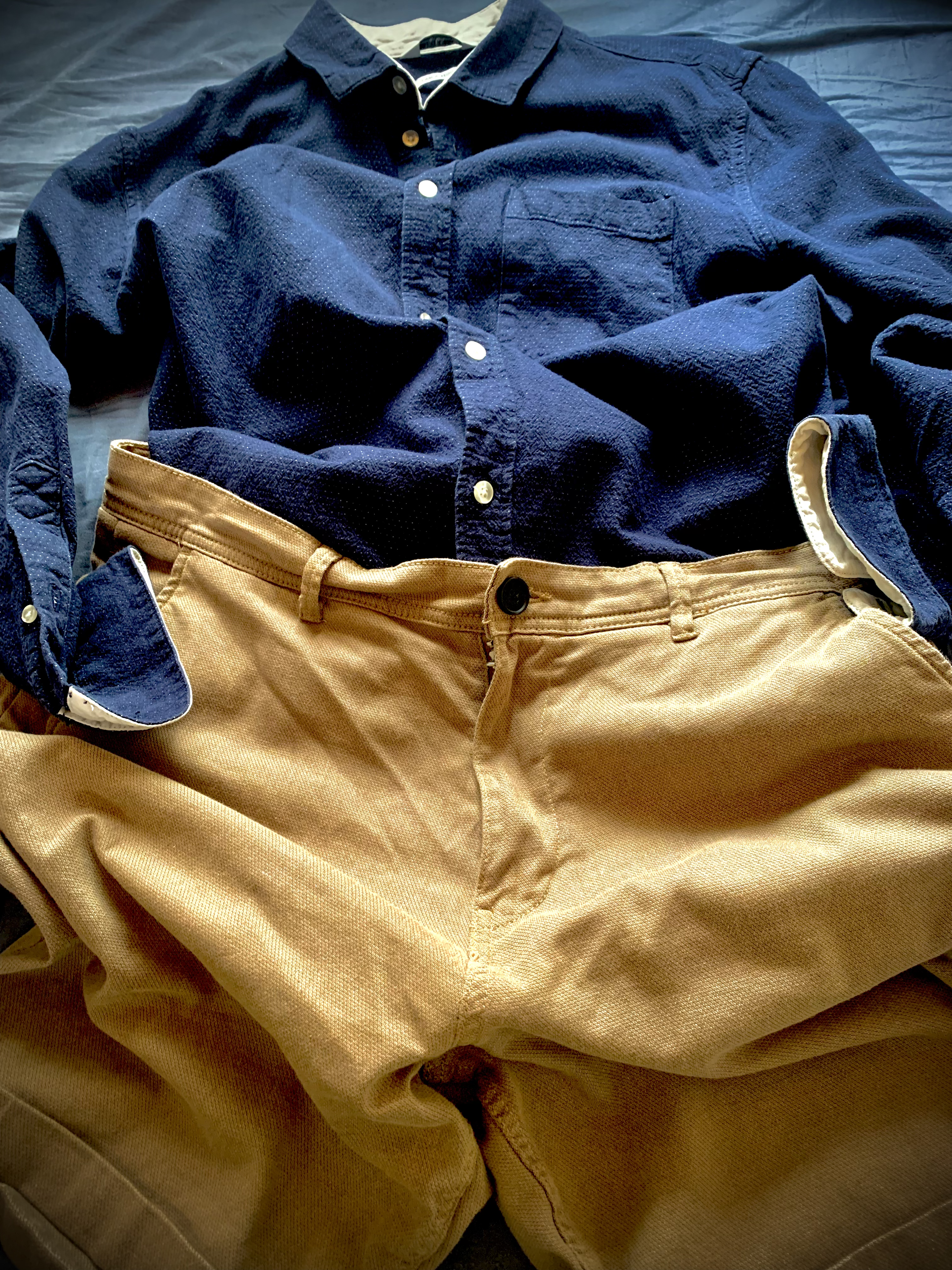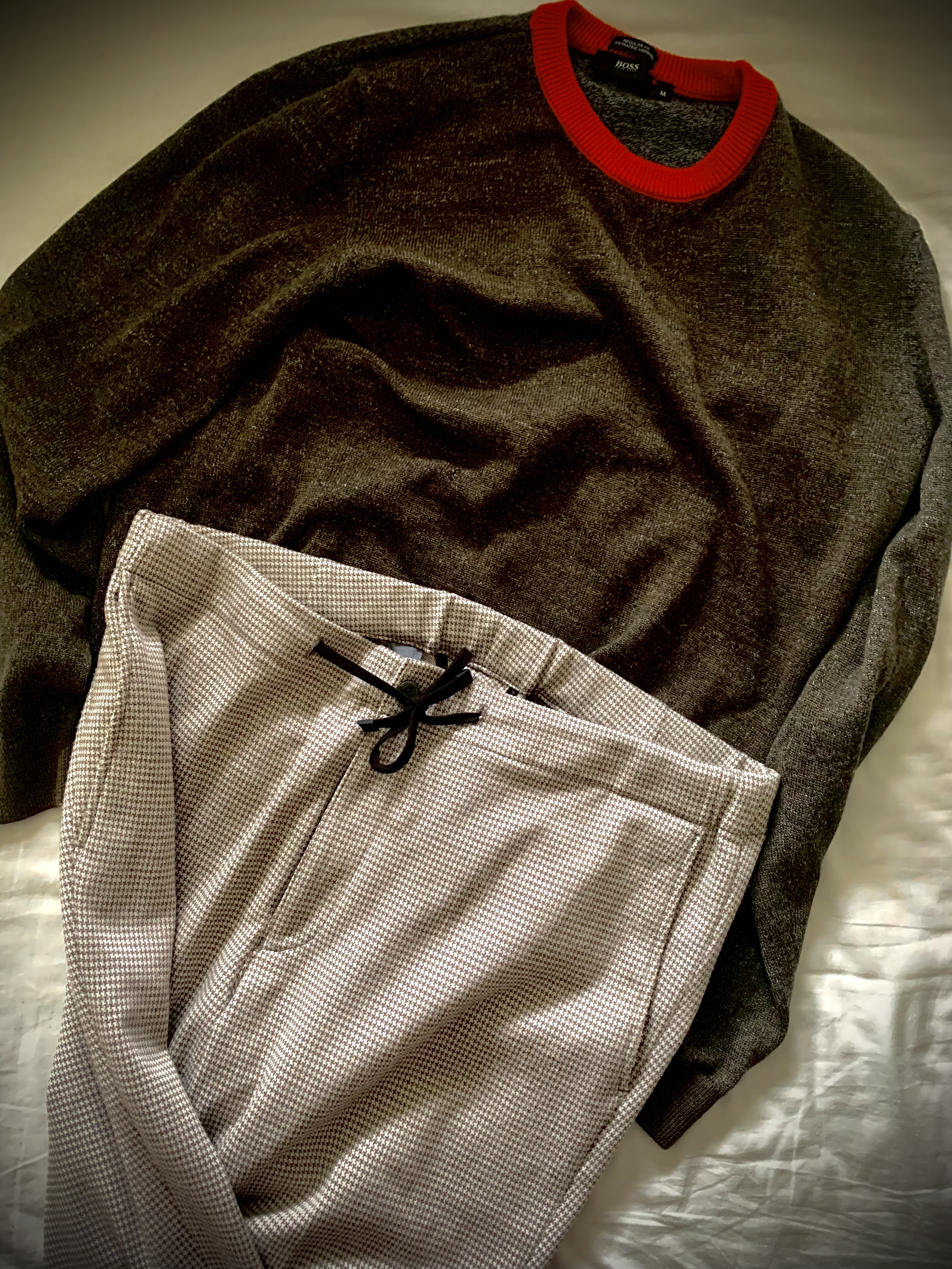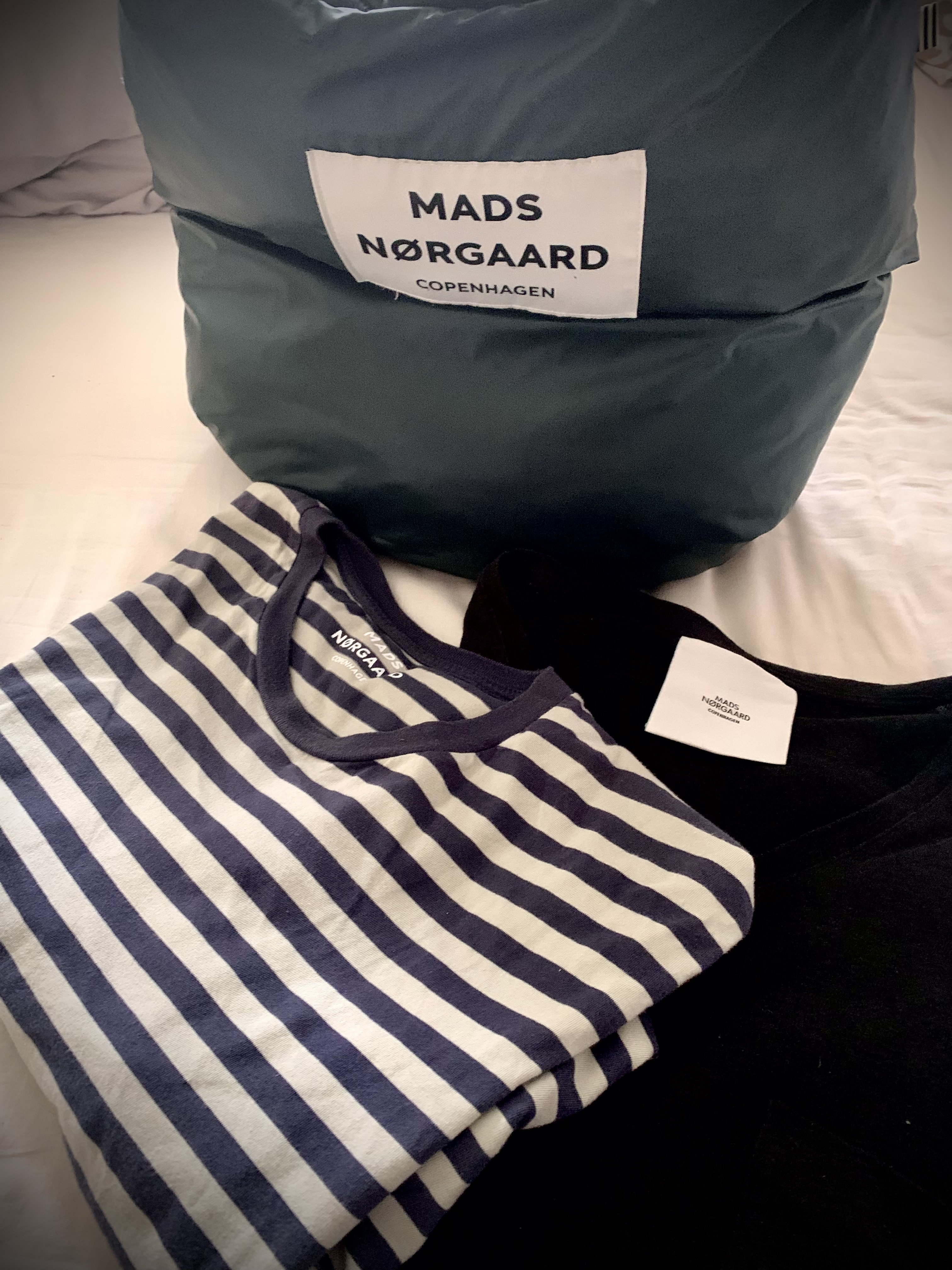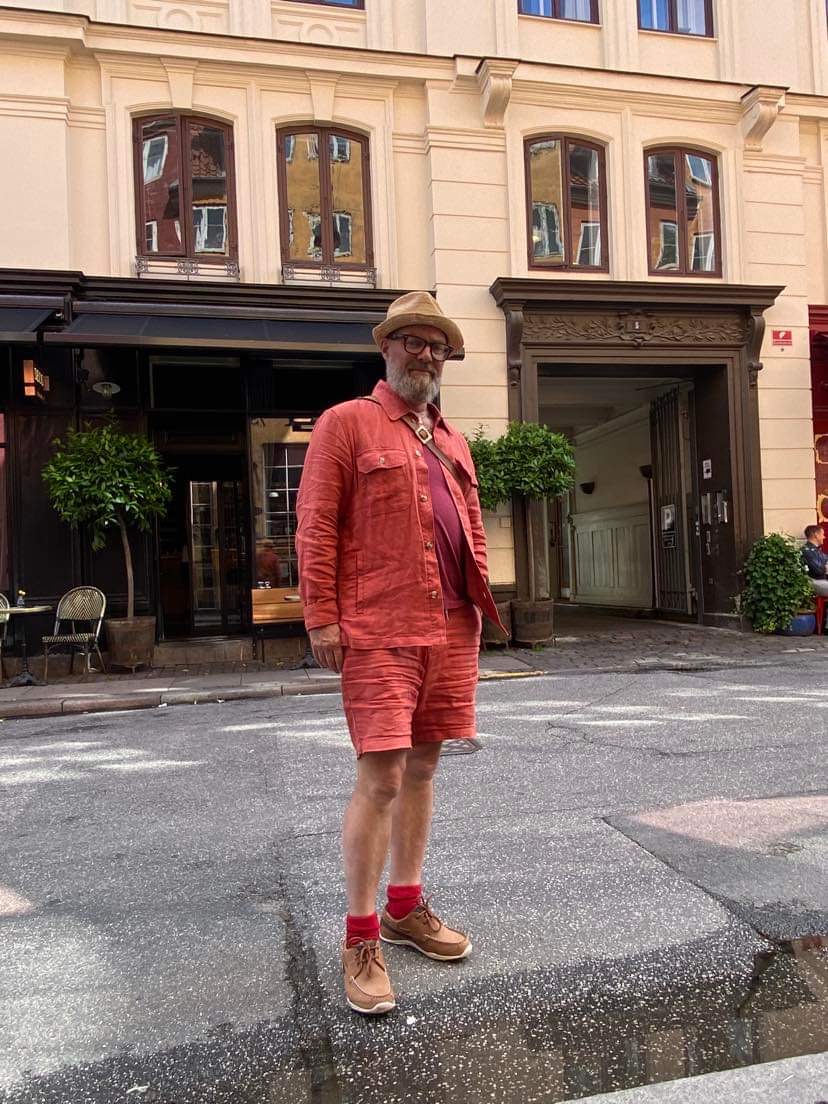 Jag klär mig som en city man: mina grå byxor med vita ränder, Les Deux, inhandlade på Herragagaudurin, Reykjavik i somras, den svarta, kortärmade pikén, Cavin Klein, Röda korset i Ystad från loppisresan sommaren 2017, utanpåskjortan, Oscar Jacobson, Hede outlet förra sommaren, Stetsonkepsen inhandlad på Ströms på rea för några veckor sedan, samt Ballyskorna, Blå kors i Ølstykke i somras. Redo för storstan.