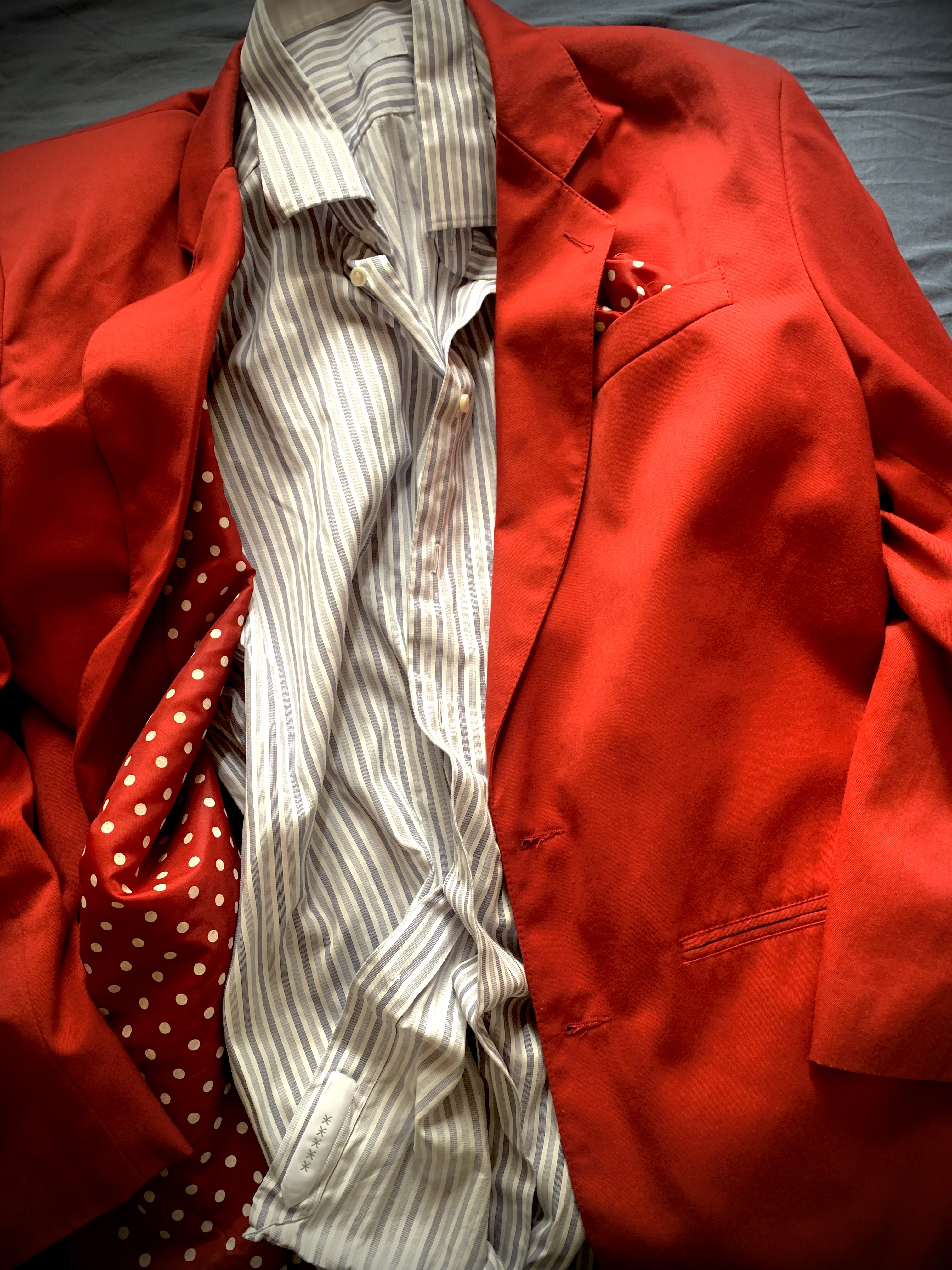 Vi är ett knappt stenkast från hotellet, går tillbaka dit för lite vila innan det är dags att svida om till banketten. Jag har med en Armanikostym, som tillsammans med downbottom Ljung-skjorta (ljusblå) och en röd silkesslips med vita prickar, som får utgöra min secondhandstass för kvällen. På fötterna ett par Paul Smithskor, även de secondhand. Jag är stukad, men redo för festkvällen.