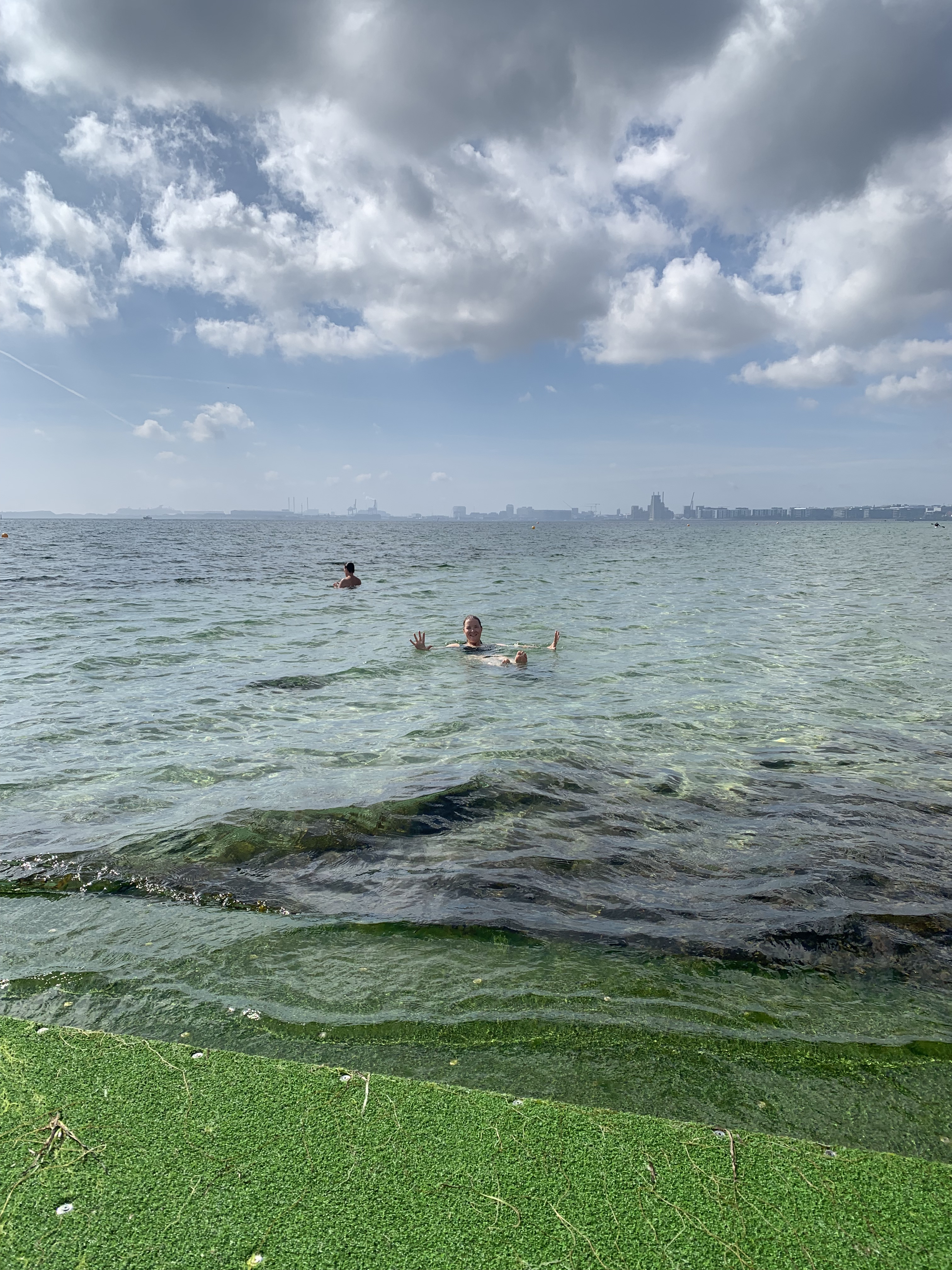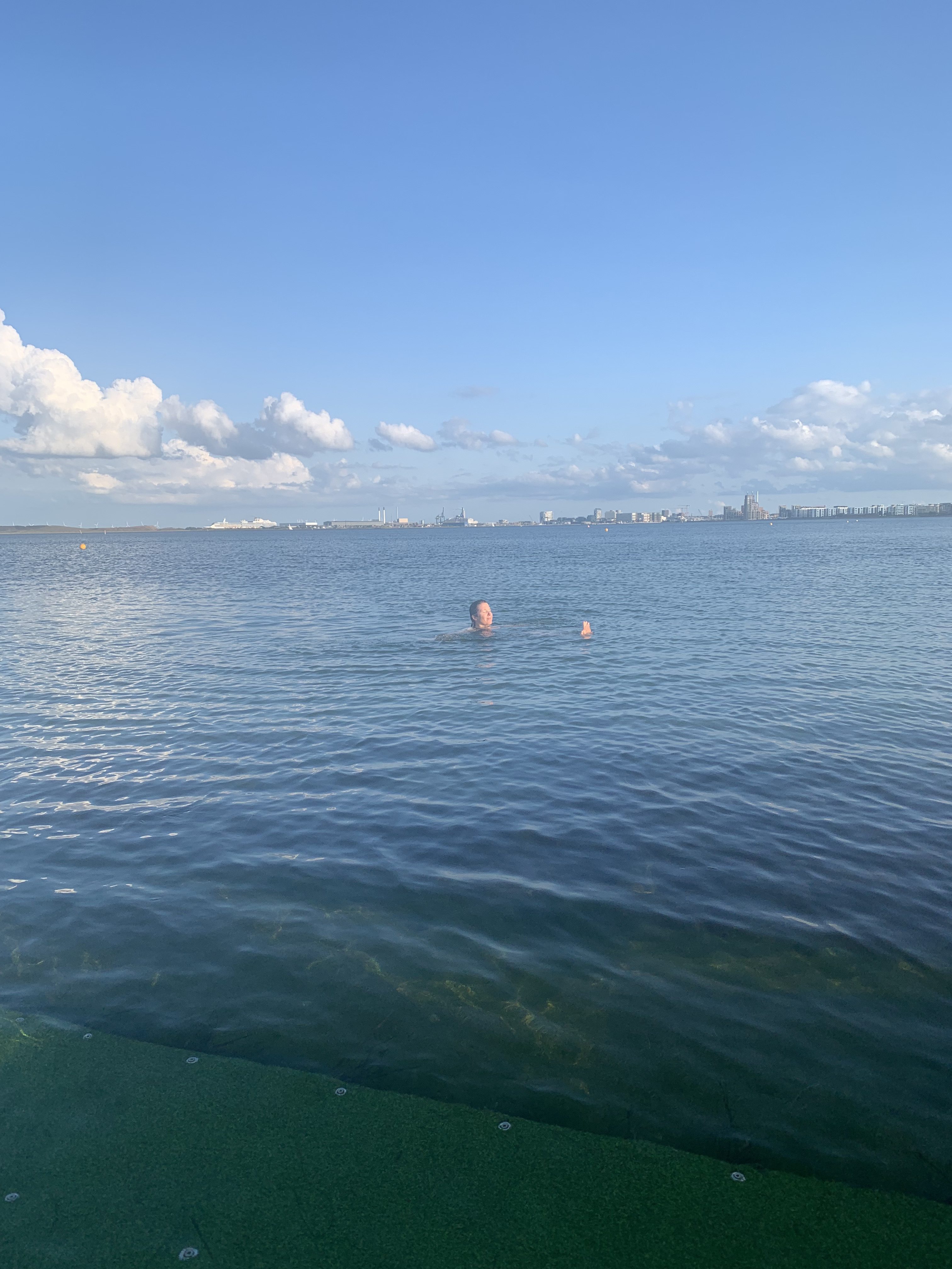 Vi betalar och bryter upp, går ned mot stranden och skapar vårt strandläger i skuggan, där Z:s bonad kommer till nytta. Jag får börja badet, skiftar snabbt till badkläder eftersom de togs på redan på hotellet med min GAP-kortbyxor från Londonresan sommaren 2015 över. Badskammen försvinner när jag väl är i. Jag låter vattnet smeka min kropp. Flyter, simmar, tar några meter under vattnet med öppna ögon. Det är underbart. Så är det Z:s tur. Hon tar sin tid. Kommer upp. Vi skiftar igen. Att bada är härligt.