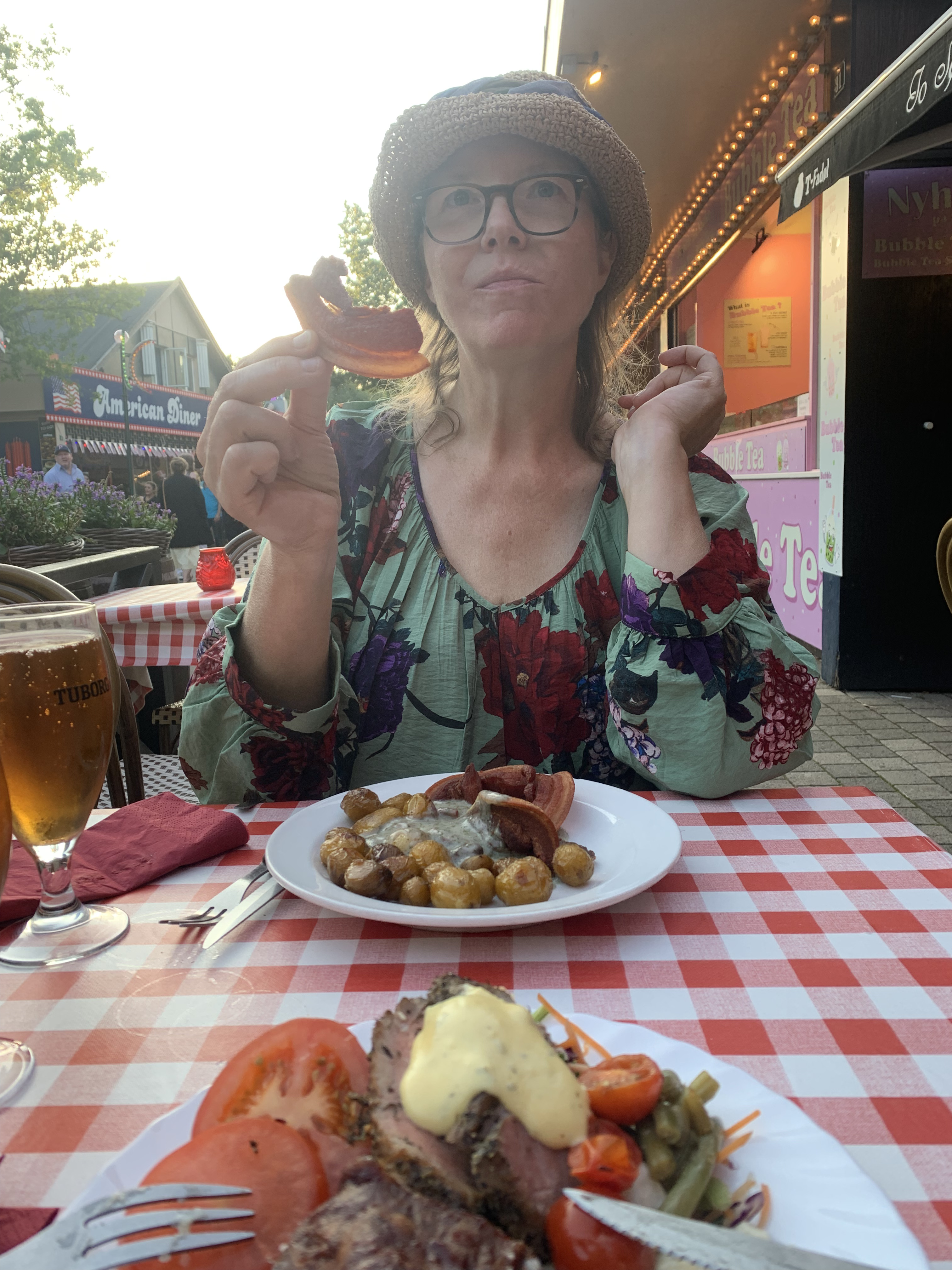 Jag föreslår att vi ska gå till restaurangen tvärs över gatan för middag, men Z säger nej. Vi kikar in på någon restaurang på vägen, men frestas inte. Så kommer mitt trumkort. Trots att hon är stoisk, min kära hustru, vet jag att hennes vänsterfot smärtar. Så… jag föreslår det rimliga i att sitta vid en restaurang med bara tio meter till hotellet. Trots hennes invändningar om avgaser, vilket hon inte haft då vi har suttit vid betydligt mer trafikerade leder, faller hon till föga.