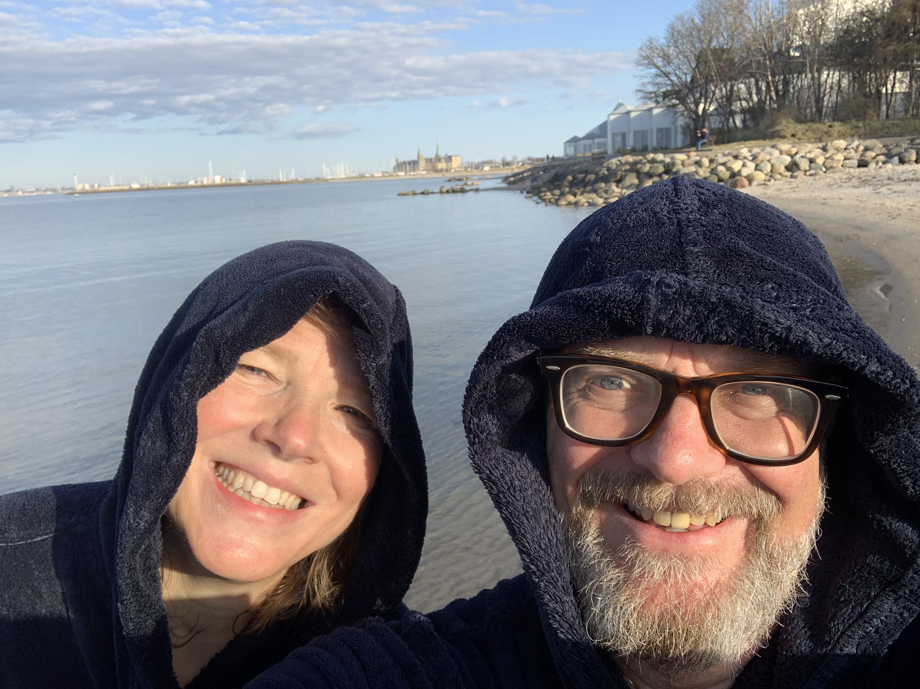 Vi har lyckats tigga till oss badrockar av den vänliga receptionisten, badrockar som annars bara tillfaller hotellets spagäster och några sådana är inte vi. Så iklädda de svarta badrockarna och badkläder tar vi hissen ned, går ut bakvägen och smiter förbi kasinoentrén mot en lite strand vid sidan av hotellet. I bakgrunden Kronborgs slott, i fjärran Sverige och Mölle by the sea. Jag tar resolut av mig badrocken, kliver obekymrat i vattnet, känner hur kylan kniper om mina vader, efter ett femtontal meter kastar jag mig och frustande tar mig upp. Z följer mitt exempel nära nog.