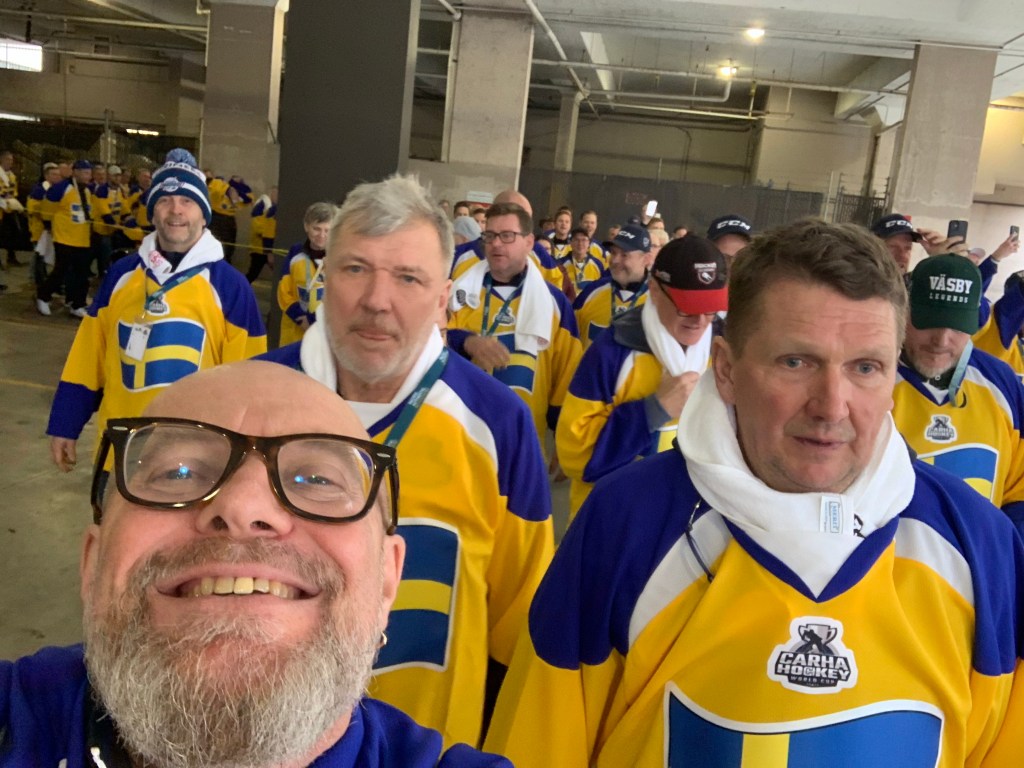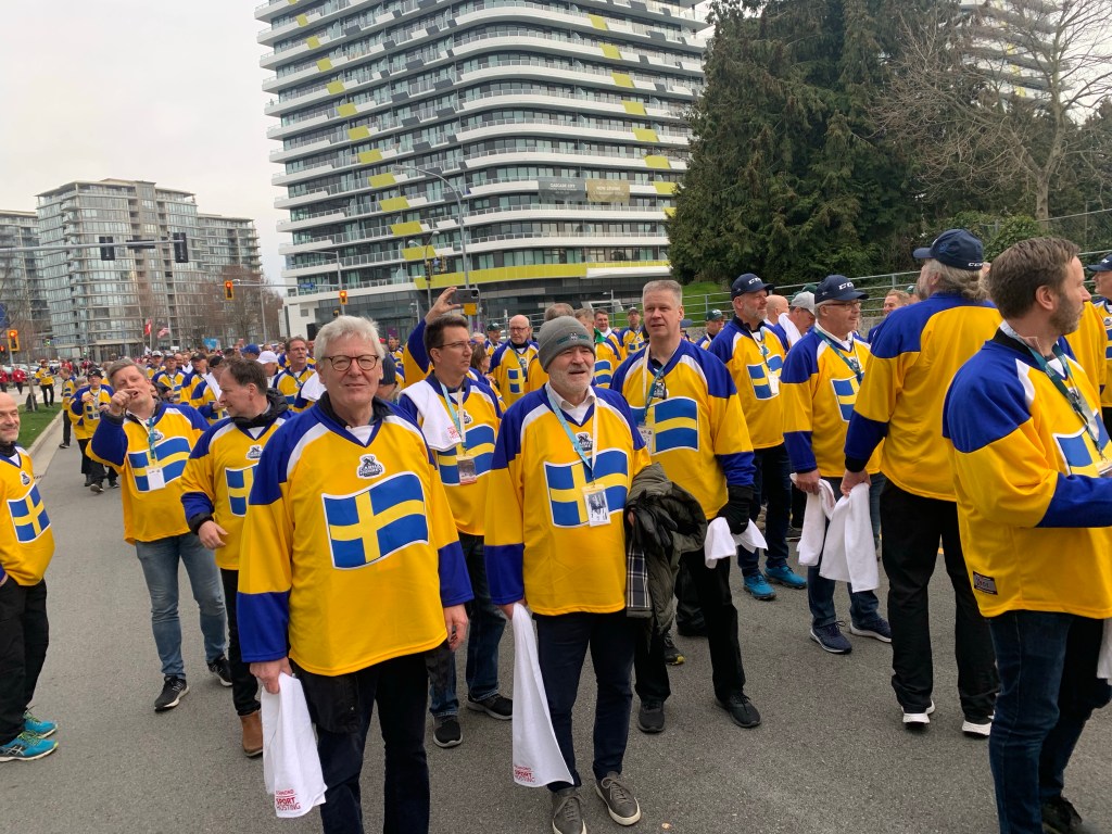 Mästarorganisatören gör +65 Mats T har våra biljetter – finansmannen, Kurt och jag – för vi tillhör en skara spelare som flyttats upp till +70-laget. Vi möts i foajén. Där sitter några spelare från Kanada och den ena och jag kommer överens om att skifta tröja. han får min med svenska flaggan, jag hans med lönnlövet på. När vi ska åka med en shuttle från vårt hotell till Sheraton är vi i god tid till bussen som ska gå 17.00, enligt organisatörerna. Men då den väl kommer väljer chauffören att ta rast. Det måste han enligt lag och den ska vara på en kvart. Jag blir irriterad, säger att jag förstår, men hävdar samtidigt med en representant för Carha att vi dels har fått uppgiften att shuttlen ska gå 17.00, dels att vi har en buss att passa. Chauffören suckar, lägger tillbaka sina mackor, går en säkerhetsrunda kring sitt fordon och kör i sakta mak från hotellet tio minuter senare än utsatt tid. Efter ett tag ringer Mats T och undrar var vi är. Det visar sig att det uppstått ett missförstånd. Det är sista bussen av ett gäng, som går 17.30. Hela +65-gänget sitter redan på en som är på väg. Nå, vi hinner och stävar i rusningstrafik norrut genom ett böljande centralt Vancouver från villakvarter till alltmer växande hus för att slutligen landa i arenaområdet på en parkeringsplats blott några hundra meter från arenan. Där står Mats T tålmodigt och väntar. Matchen kan börja.